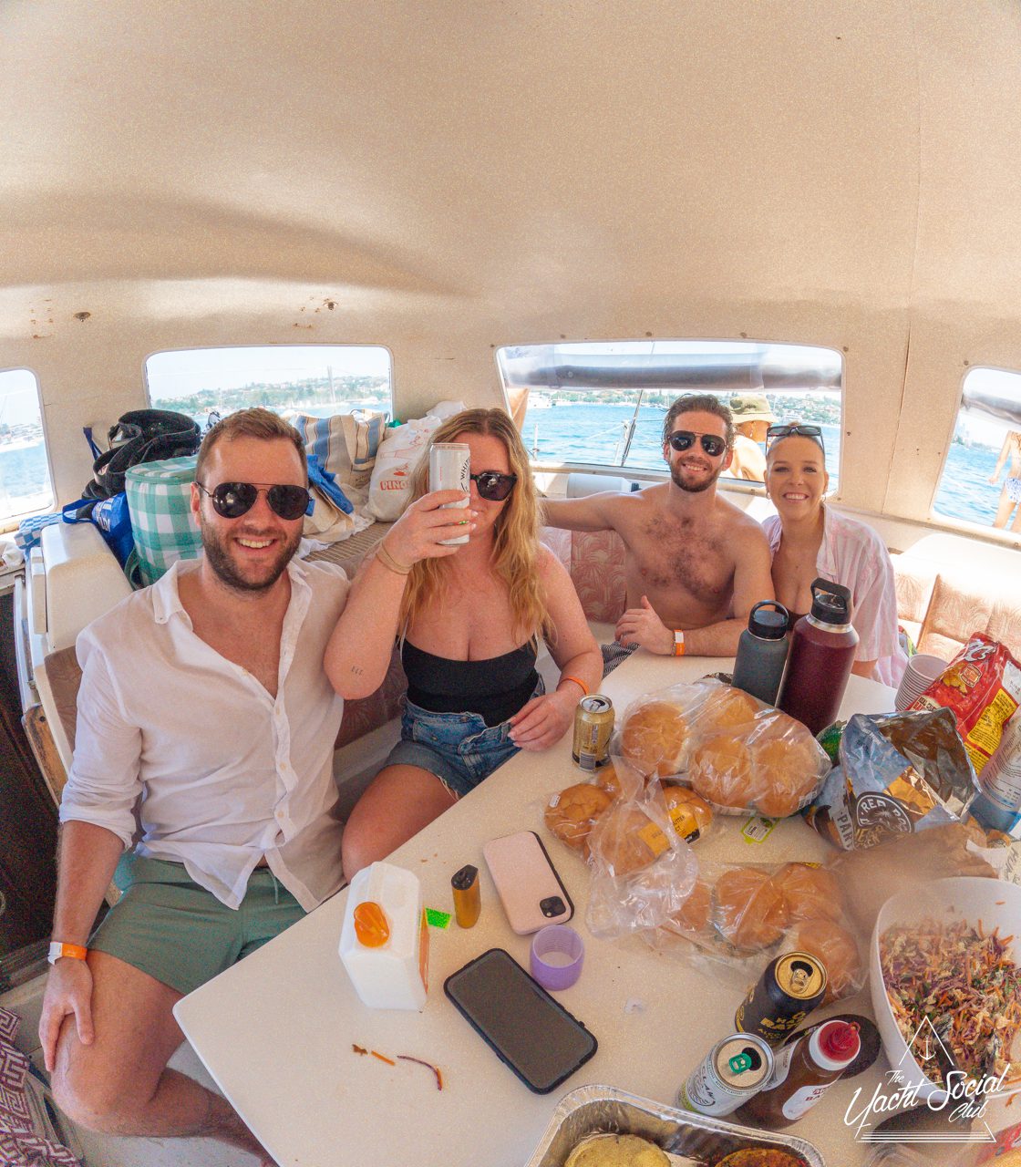 Four people in swimwear and light clothing sit around a table with food and drinks on a boat, smiling and raising drinks, with water and blue sky visible through the windows.