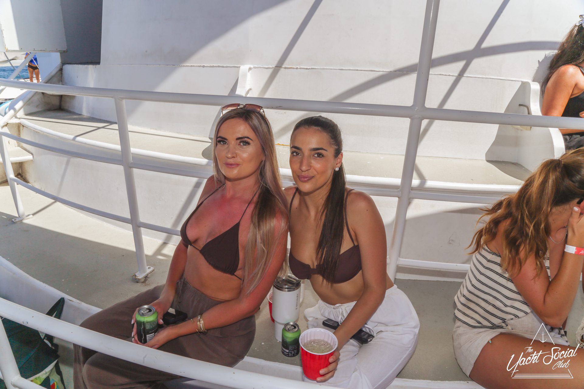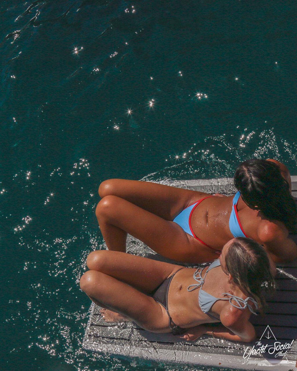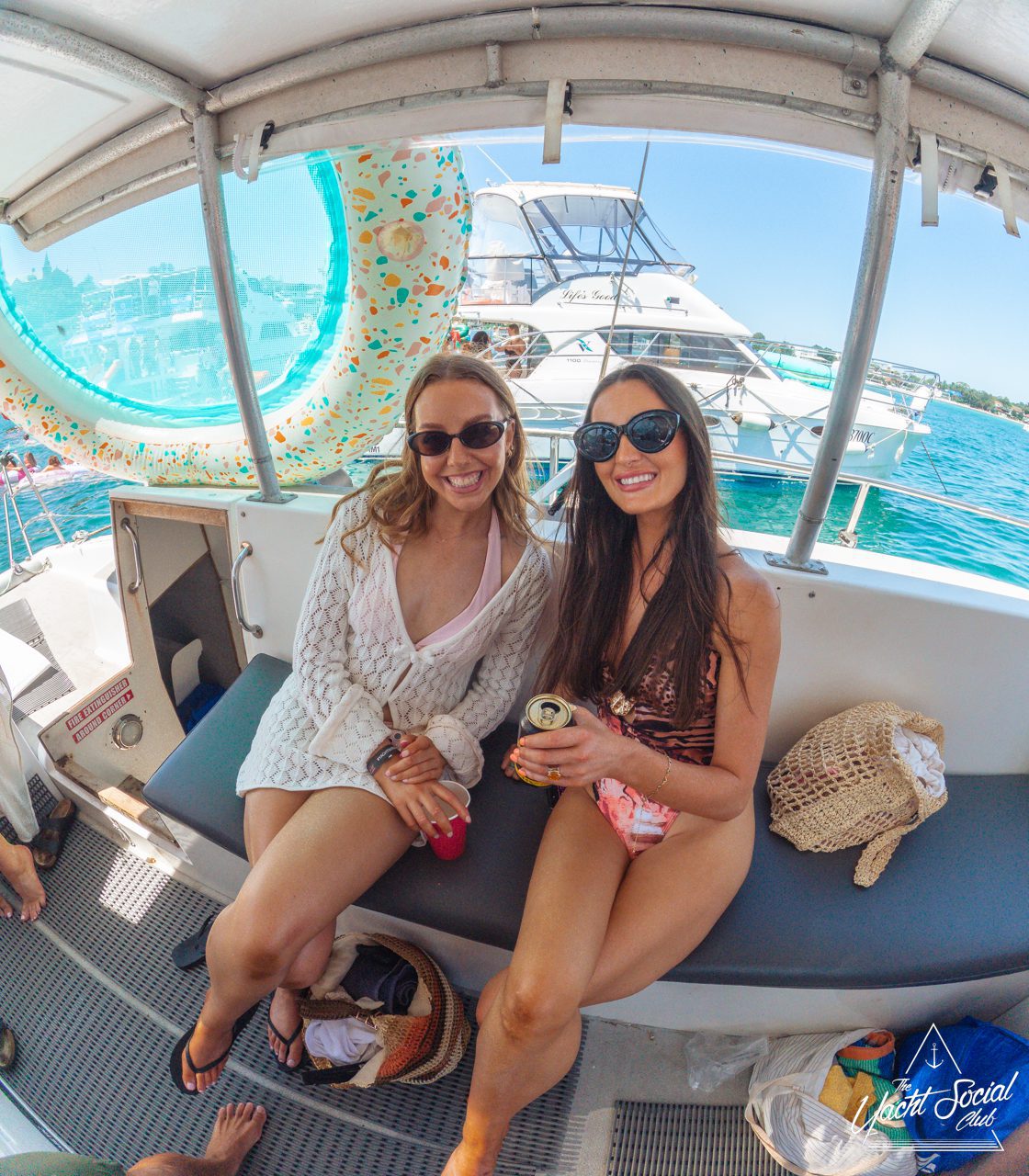 Two women in swimsuits sit smiling on the edge of a boat with their feet in the water. It’s a sunny day, and other boats and a coastline are visible in the background. The words "Yacht Social Club" appear in the corner.