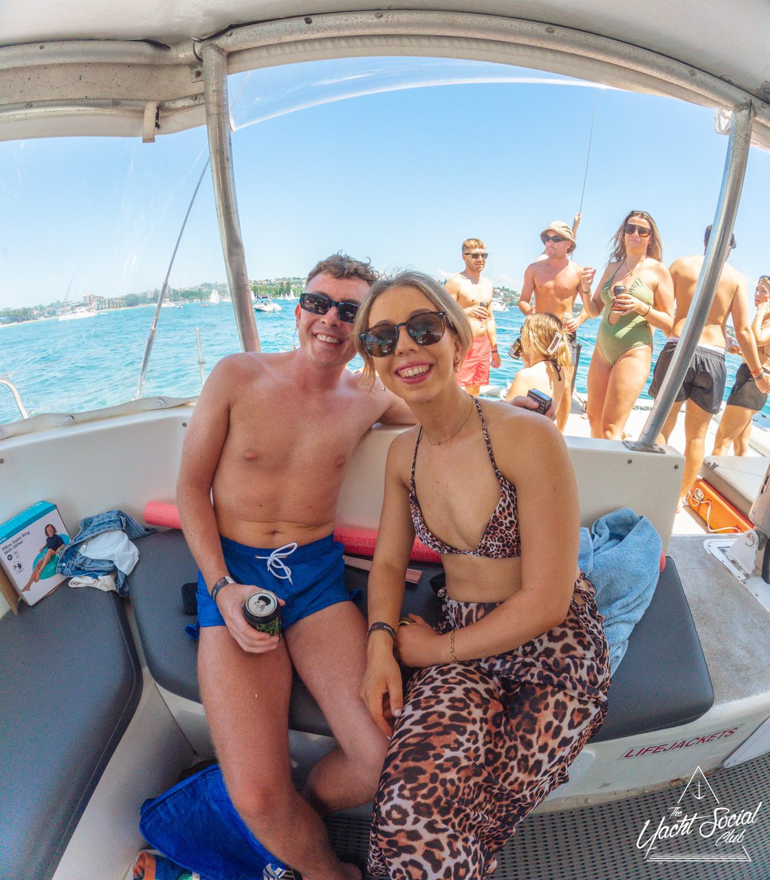 A man and woman in swimsuits smile at the camera while holding food on a boat. Other people relax around them, with more boats and clear blue water in the background on a sunny day.