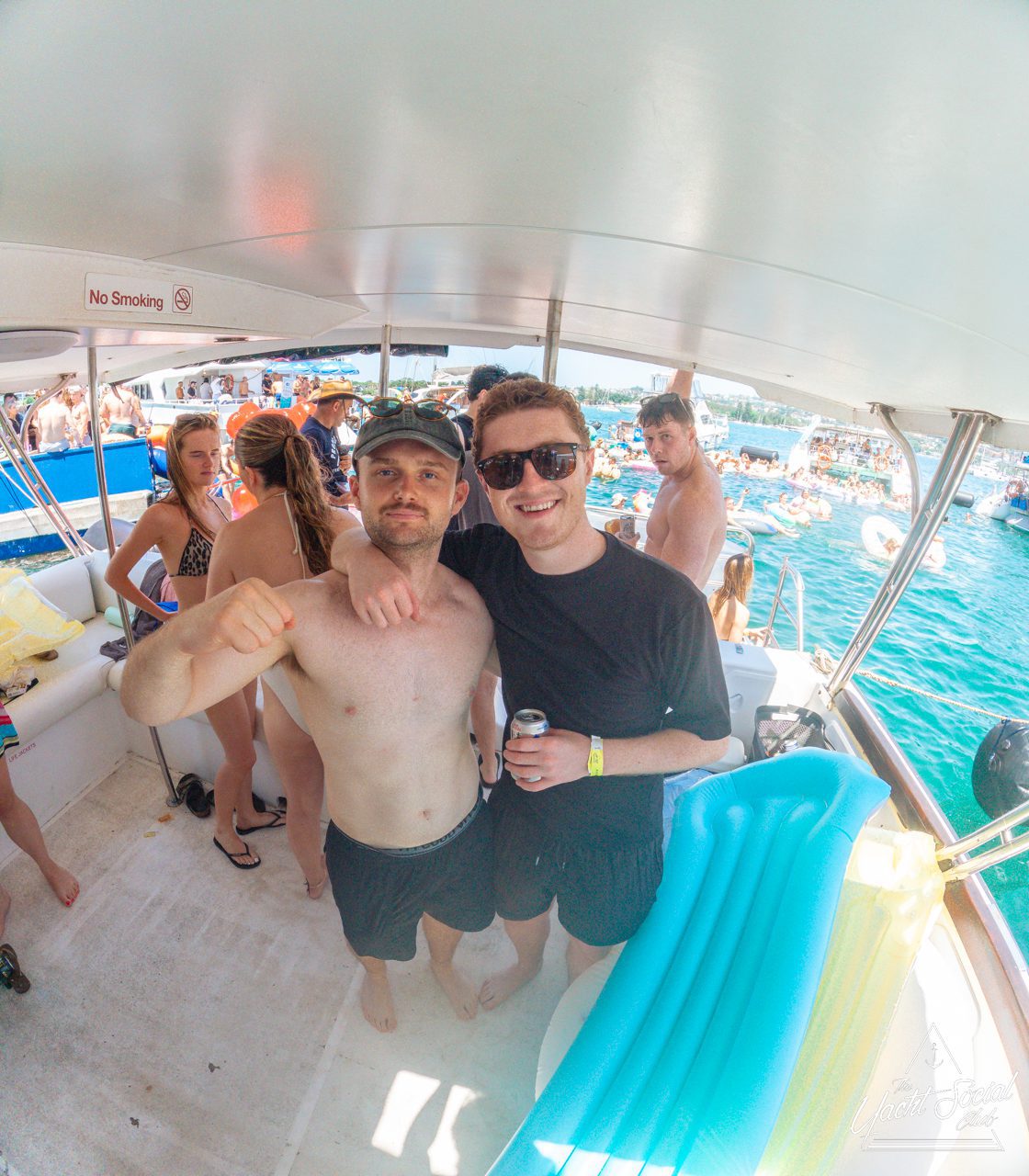 Two men in swim trunks pose smiling on a boat, one with his arm around the other. Other people in swimwear enjoy the boat and water in the background, with inflatables and a blue sky visible.