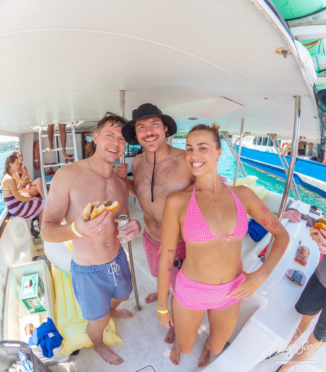 Three people in swimsuits smile and pose on a boat; one holds food, another wears a black hat. Other people and a blue boat are visible in the background, with sunny weather and water nearby.
