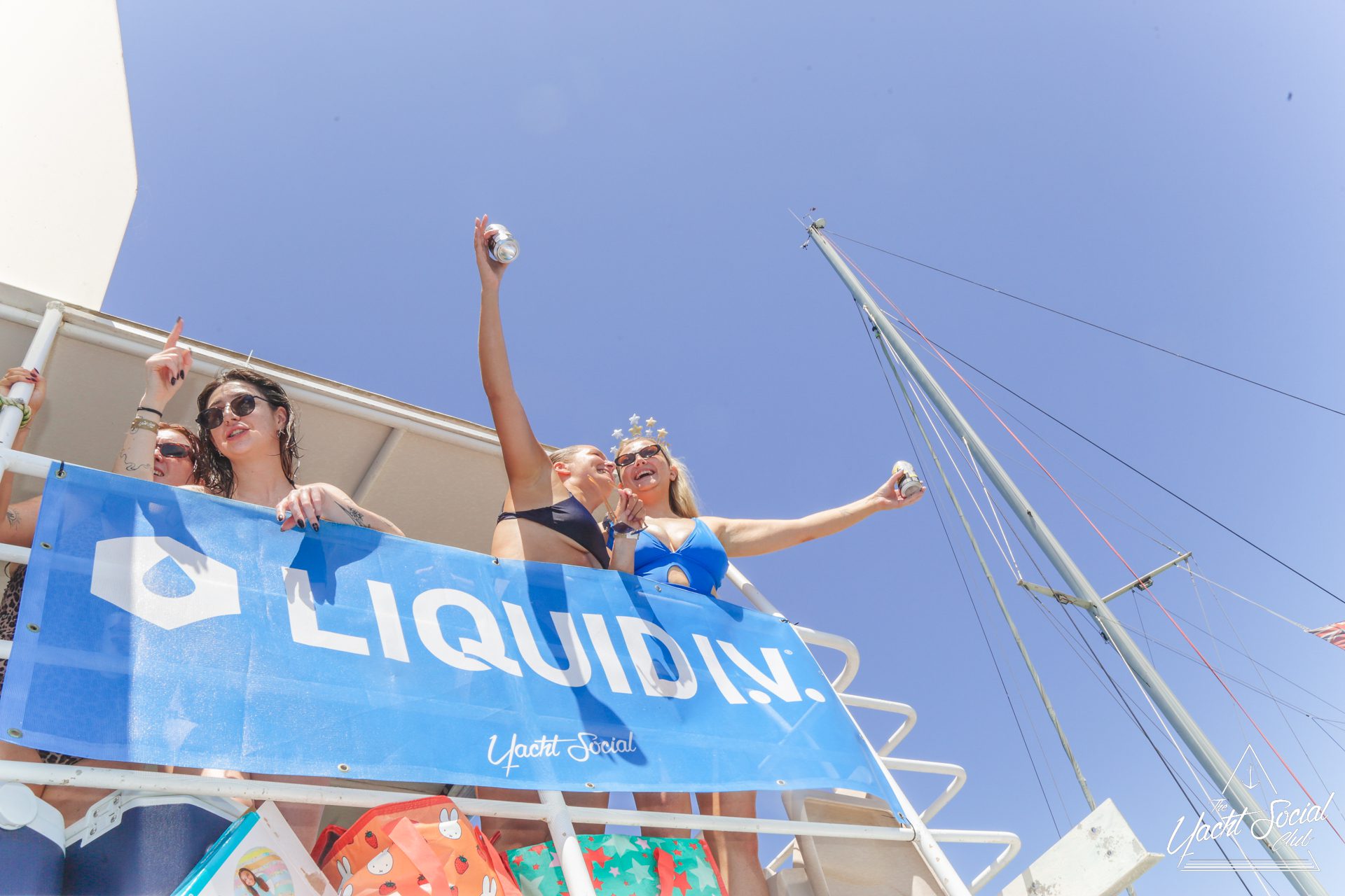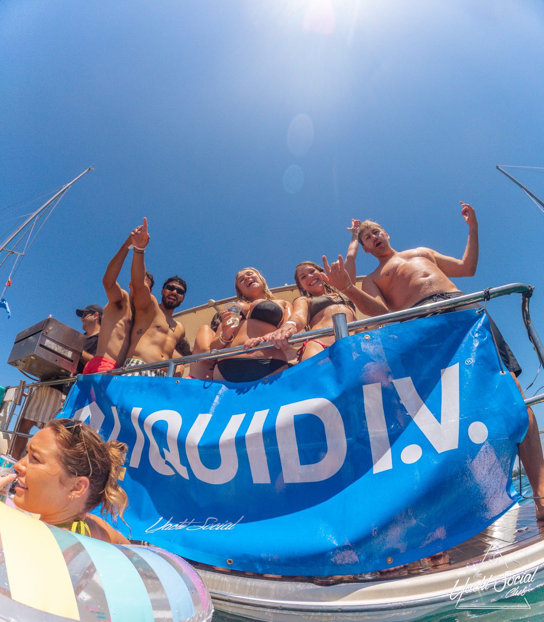 A group of people in swimsuits dance and celebrate on the deck of a white yacht in sunny weather, with water floats and a blue “LIQUID” banner hanging on the side, near a scenic shore.