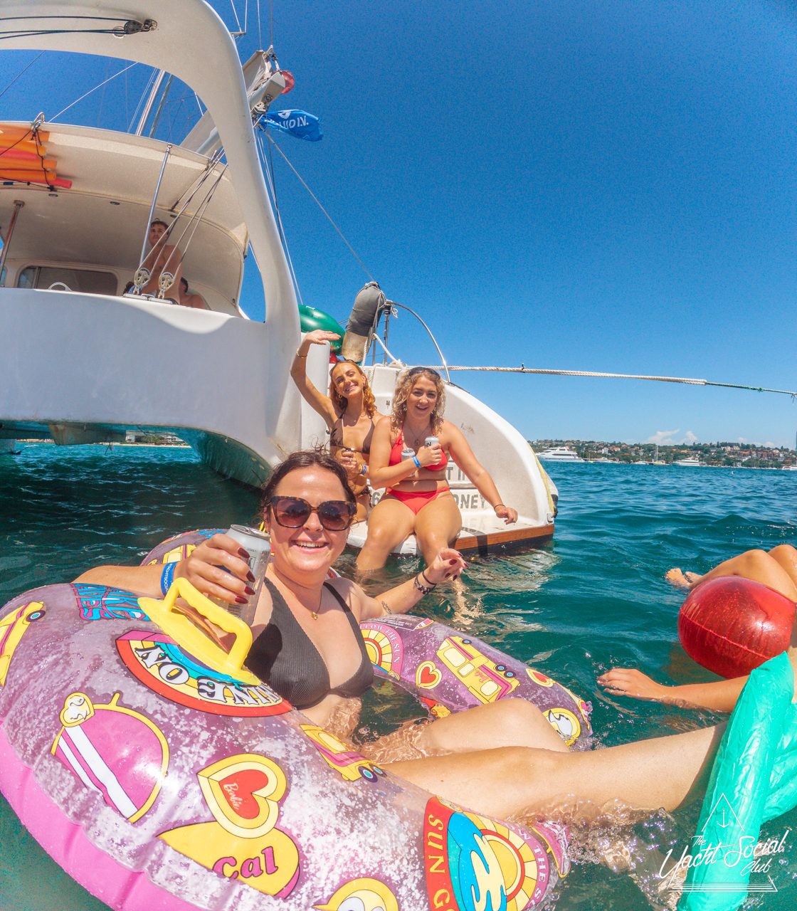 Three women in swimsuits relax and smile on pink-and-white floaties in clear blue water, holding drinks and raising their arms in celebration. Sunlight reflects off the water. "Yacht Social Club" logo in the lower right corner.