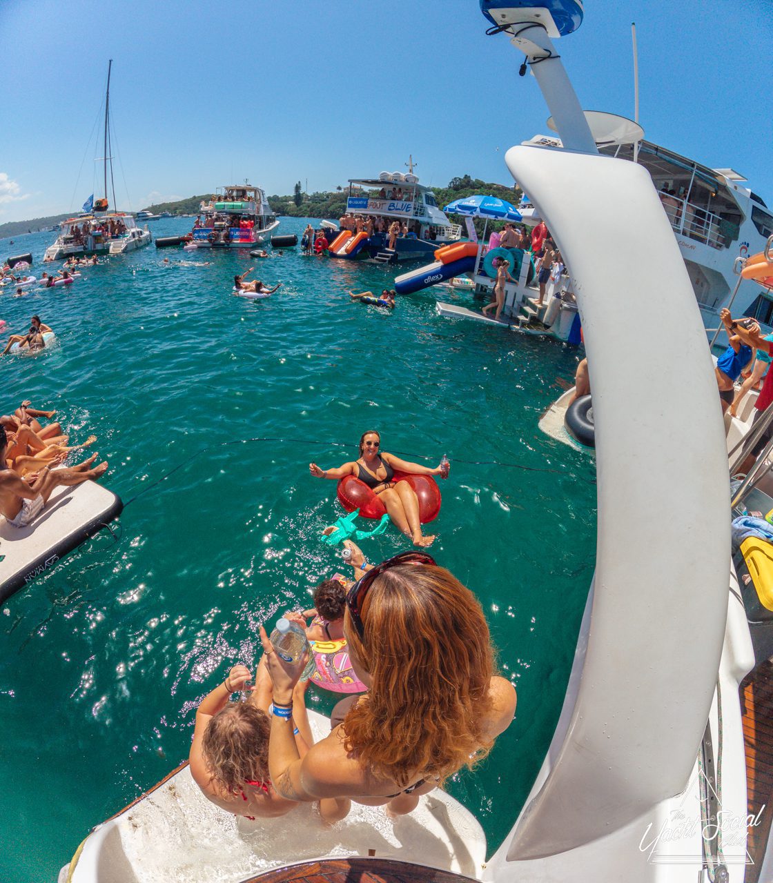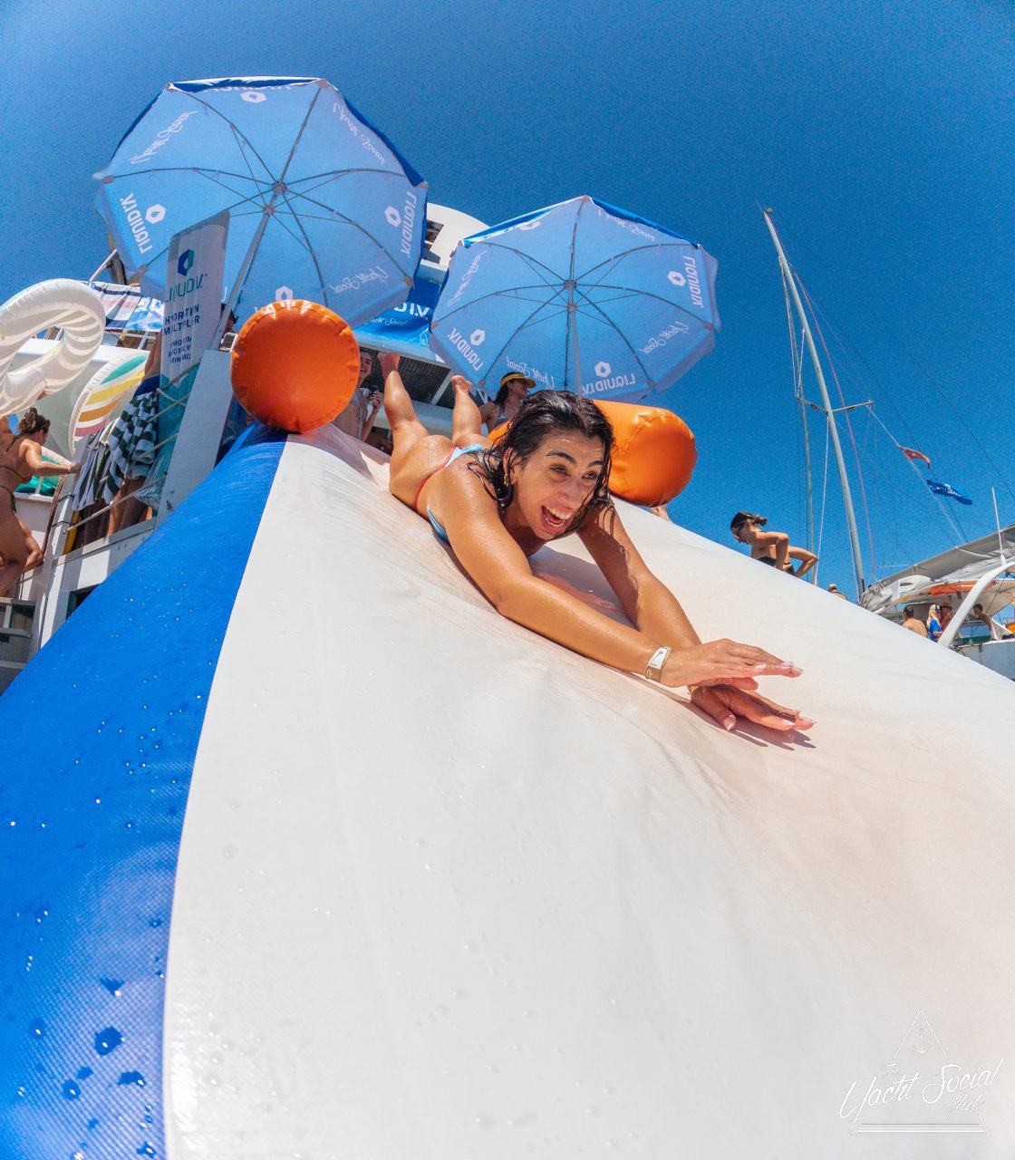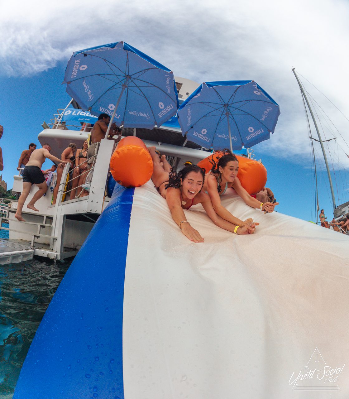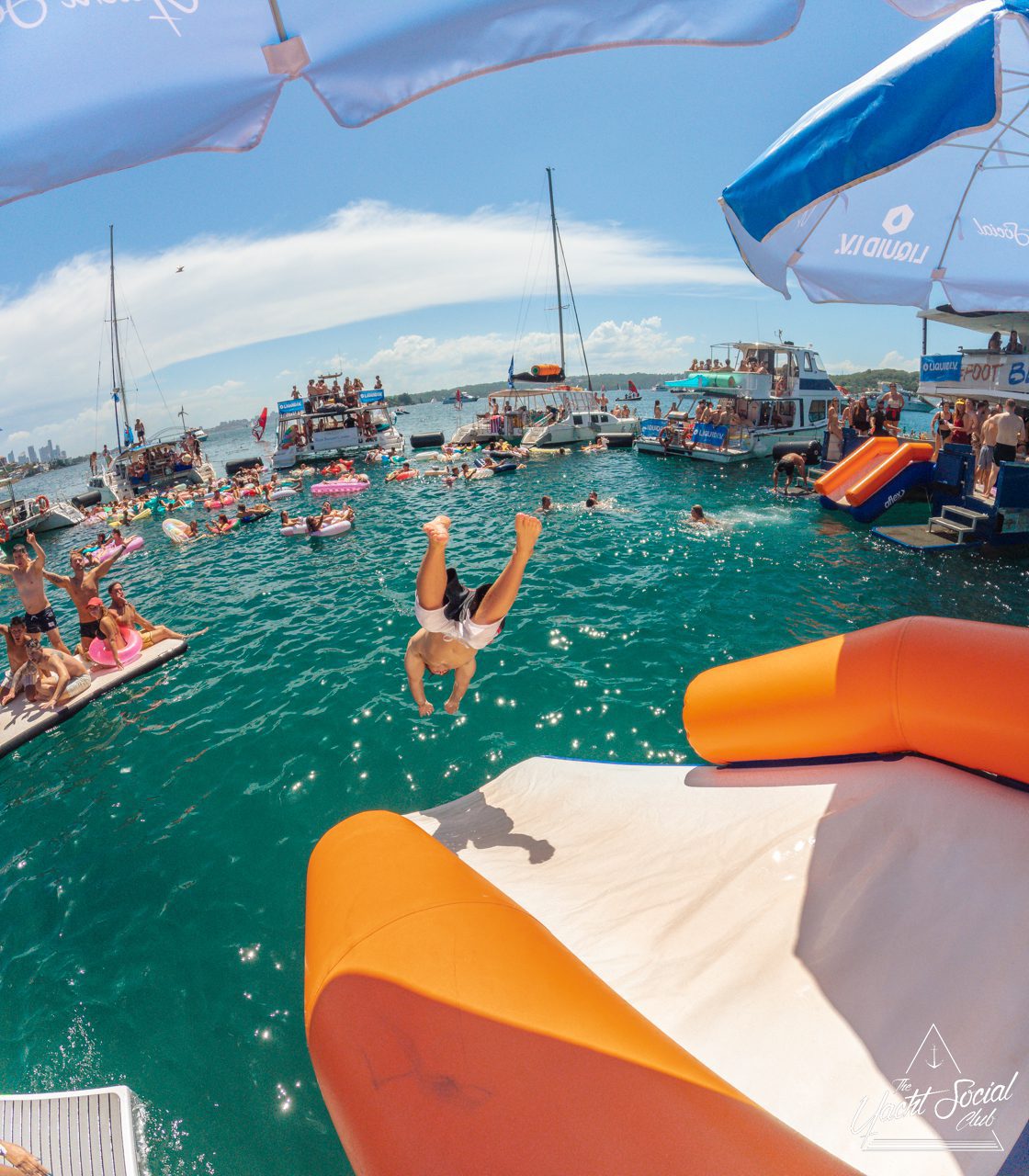 People enjoy a lively boat party, relaxing on floats and swimming in clear blue water. A woman helps a child at the top of a slide, while another person splashes into the sea below. Boats are anchored nearby under a sunny sky.