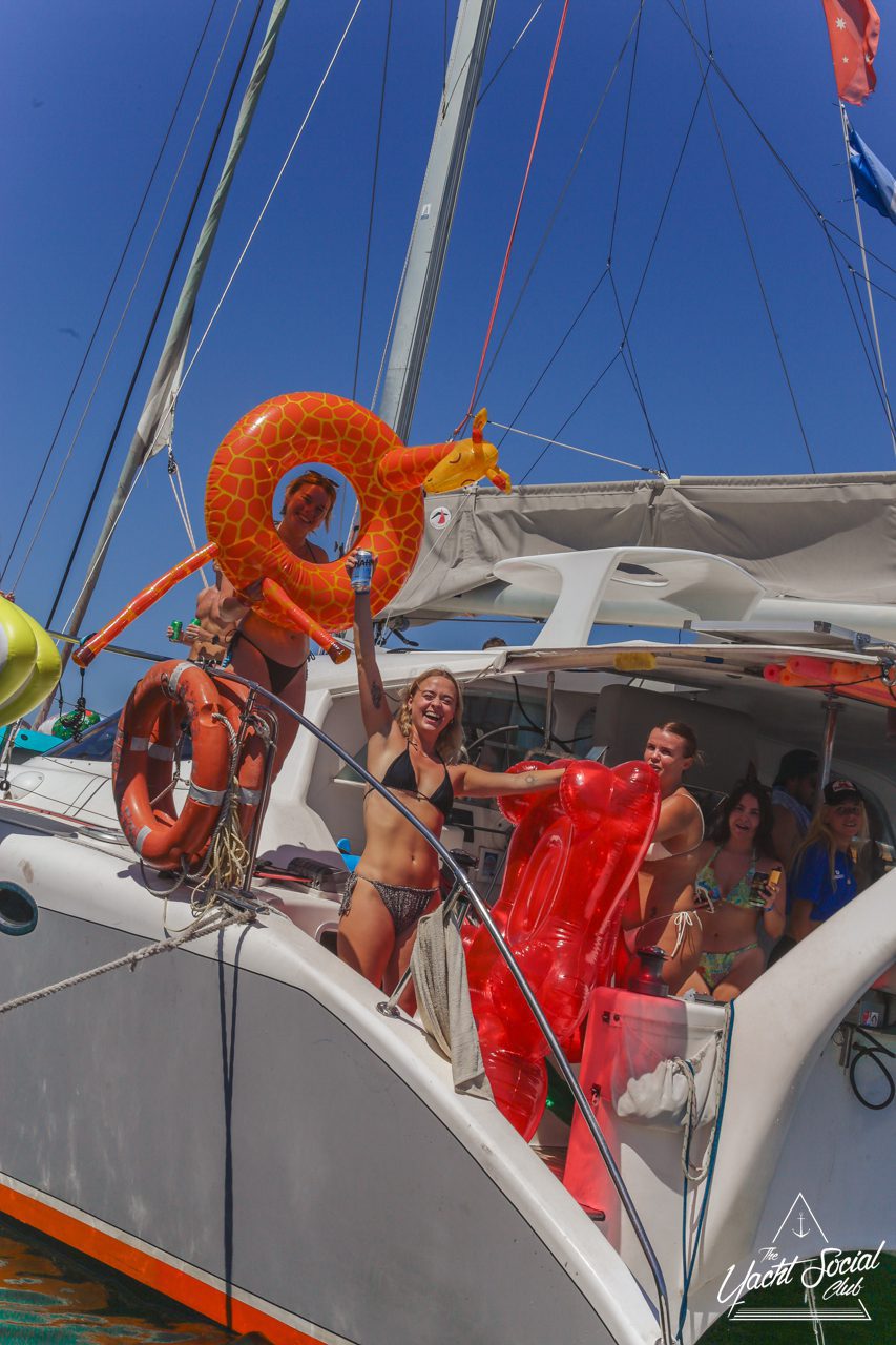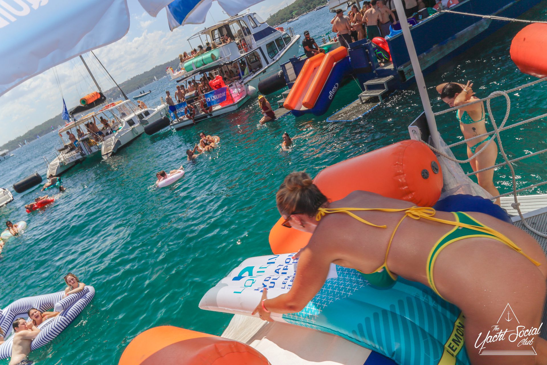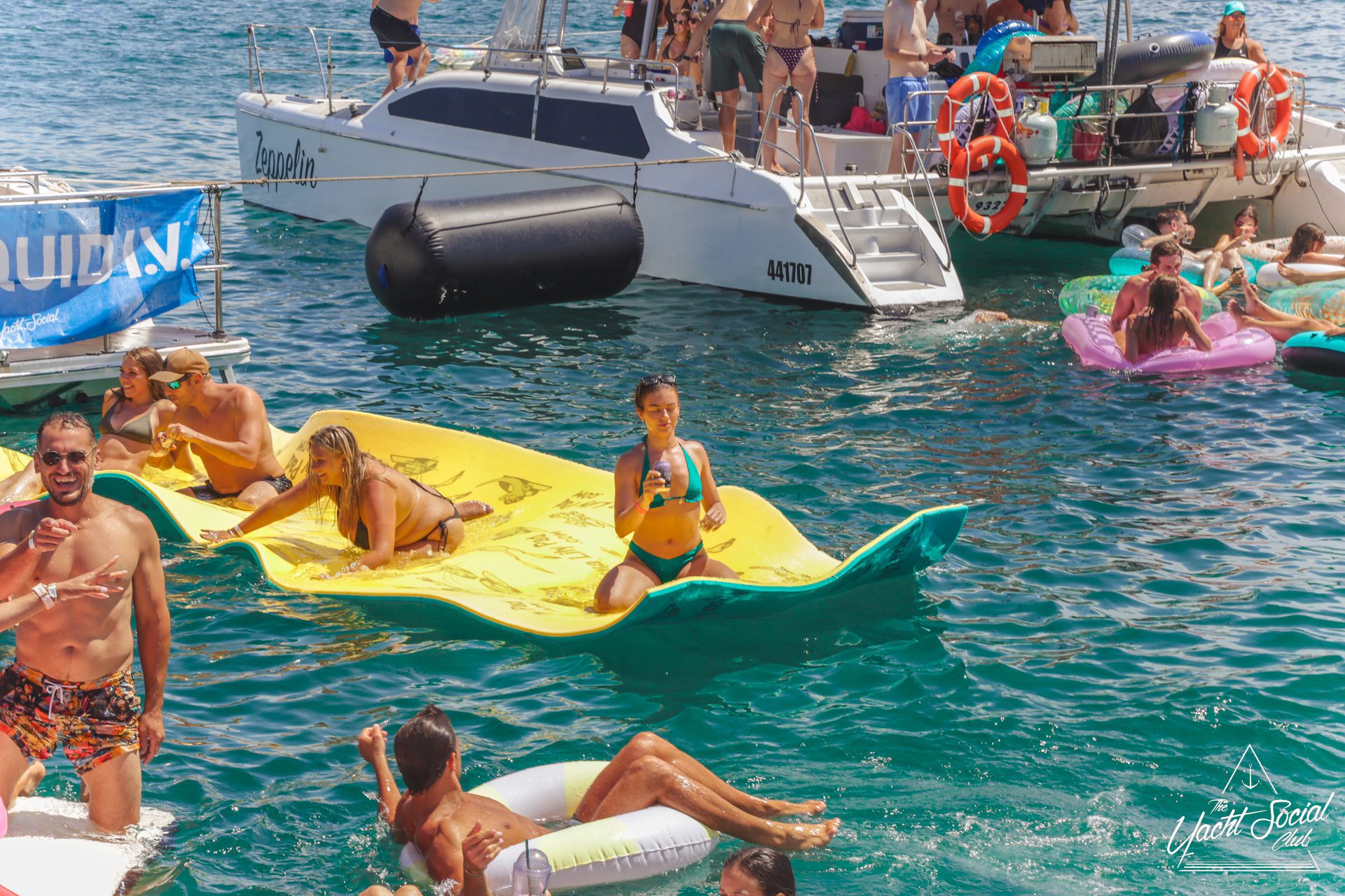 A woman in a green and yellow bikini climbs onto an inflatable float at a lively boat party. Several people relax on floats and swim in the blue water, while others gather on boats anchored nearby under a sunny sky.