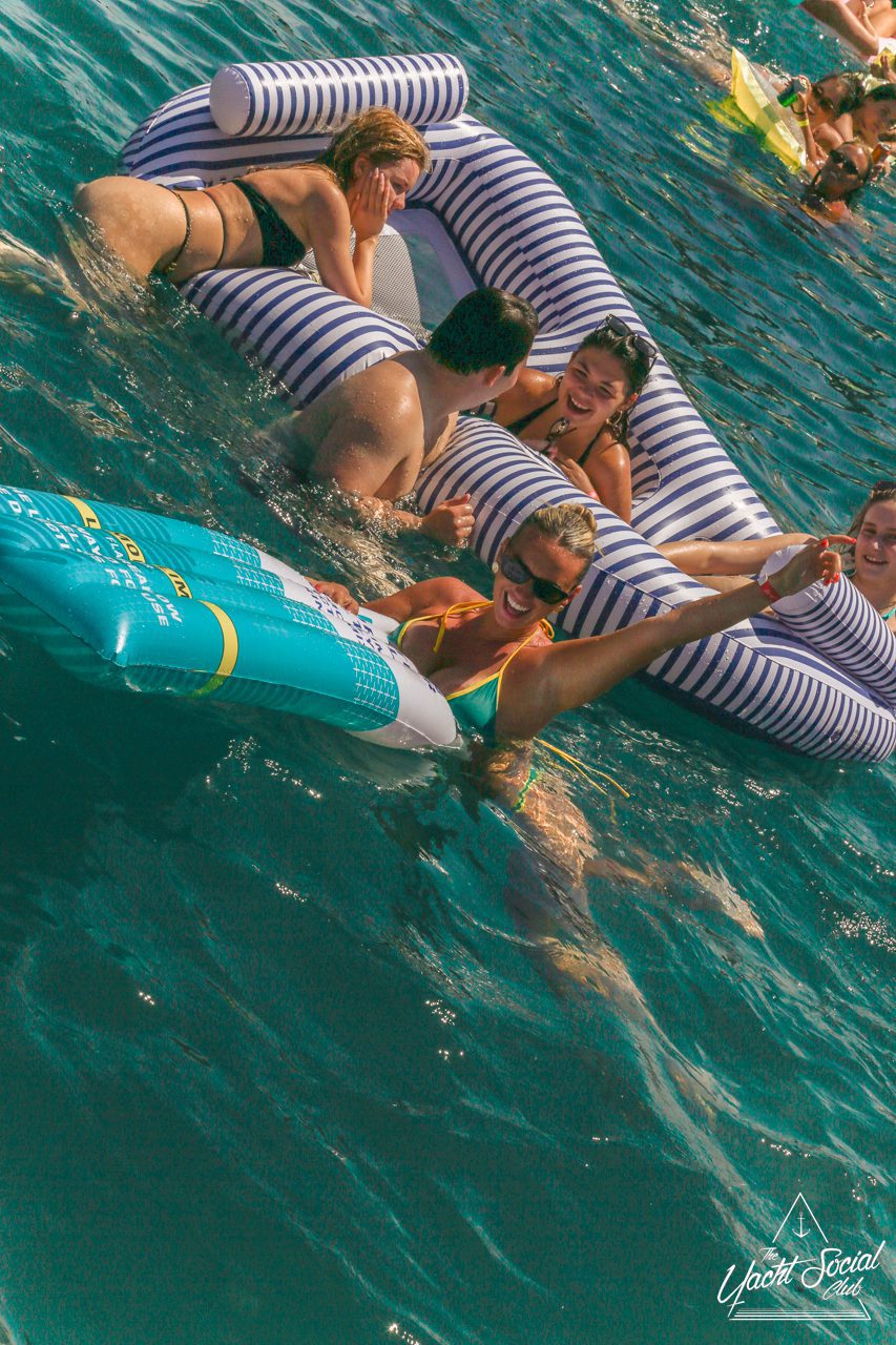 People relax on inflatables and boats in a crowded, sunny party scene on the water. A woman in a turquoise bikini lounges on a dock in the foreground, with yachts and swimmers in the background.