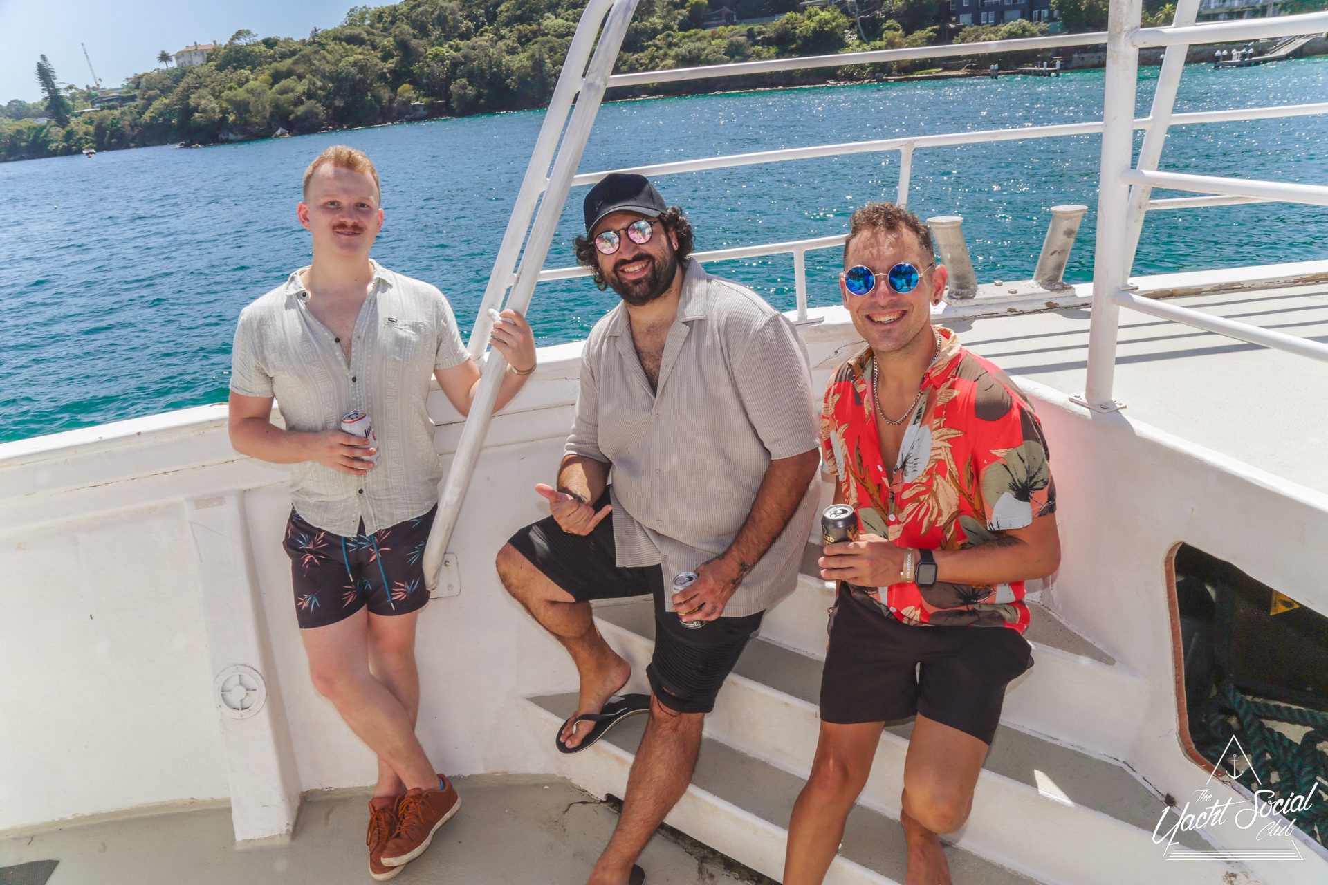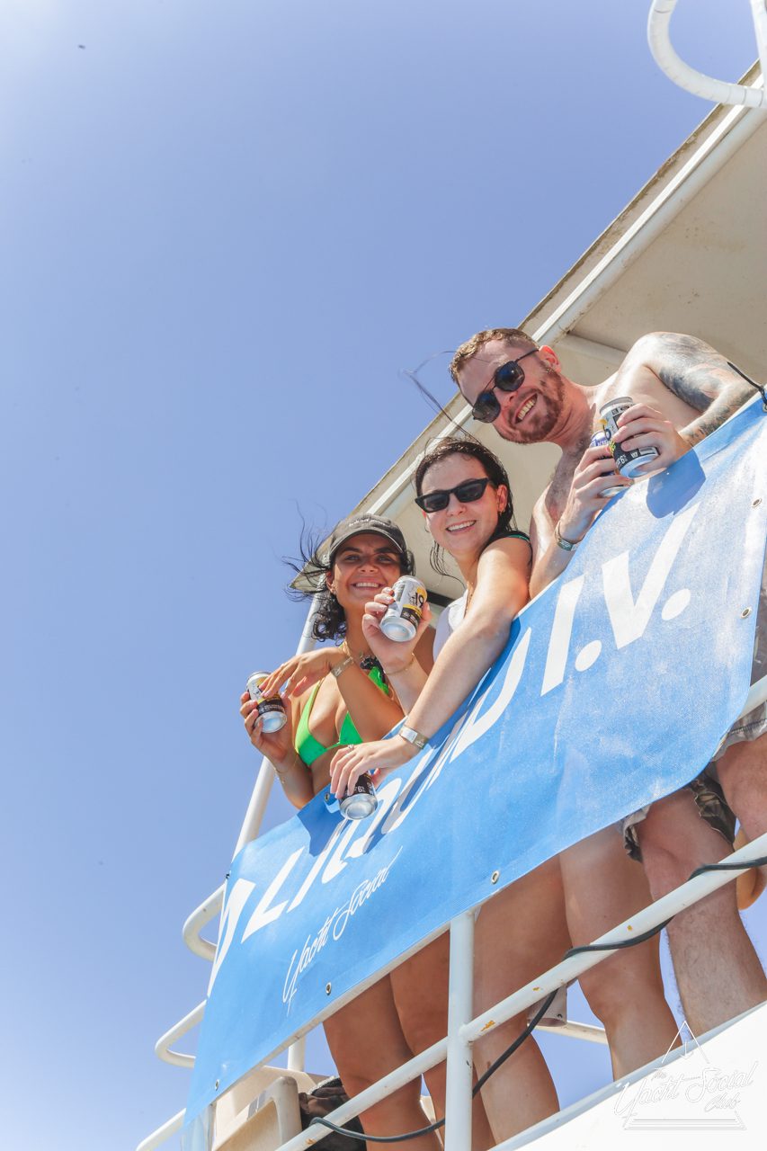Three people in swimsuits smile and hold drinks while standing on a boat deck, looking down at the camera. A blue banner with white text is displayed on the railing. The sky is clear and sunny.
