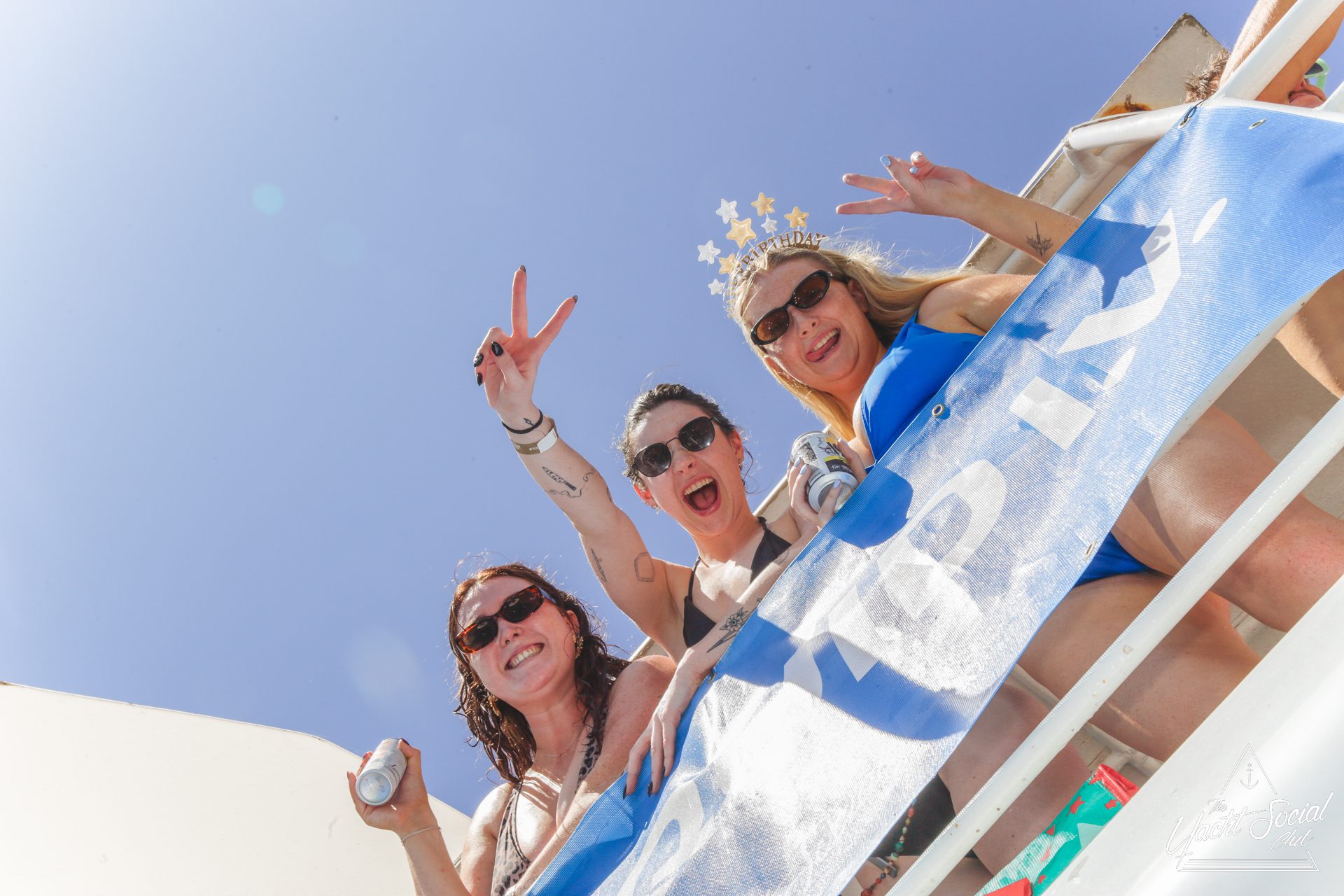 Three women in blue bikinis smile and pose with drinks on a boat, arms raised in celebration, with blue water and other boats in the background on a sunny day.
