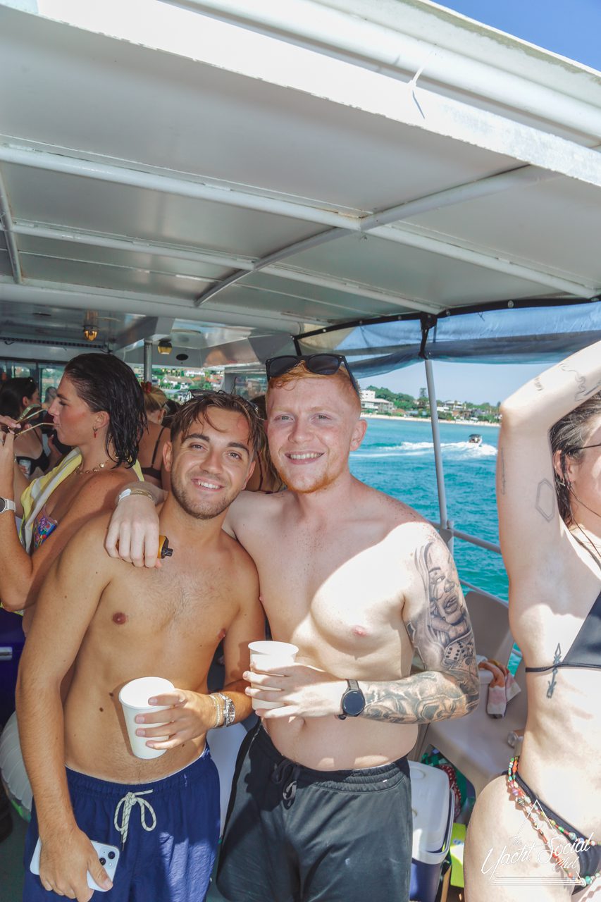 Two smiling men in swim trunks pose together on a crowded boat, each holding a drink. Sunlight shines on them and the blue ocean and coastline are visible in the background.
