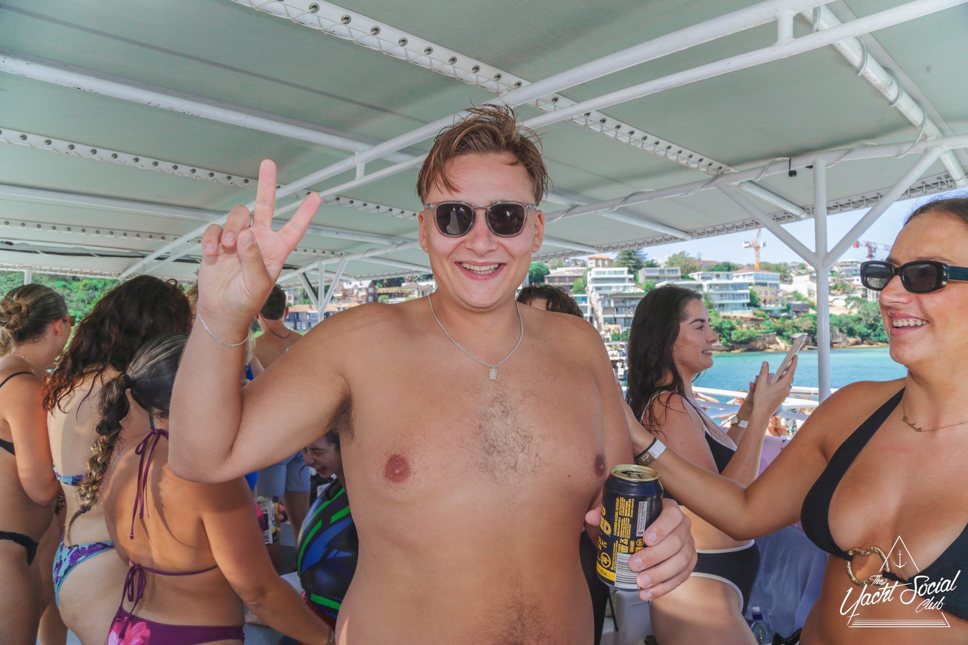 A shirtless man wearing sunglasses smiles and flashes a peace sign while holding a can of drink on a boat crowded with people in swimwear, with water and buildings visible in the background.