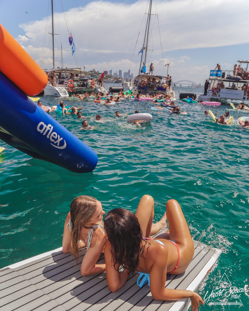 Two women in swimsuits smile and pose on a boat deck at a lively boat party with people swimming and relaxing on floats in the water. Several boats are anchored nearby under a sunny sky.