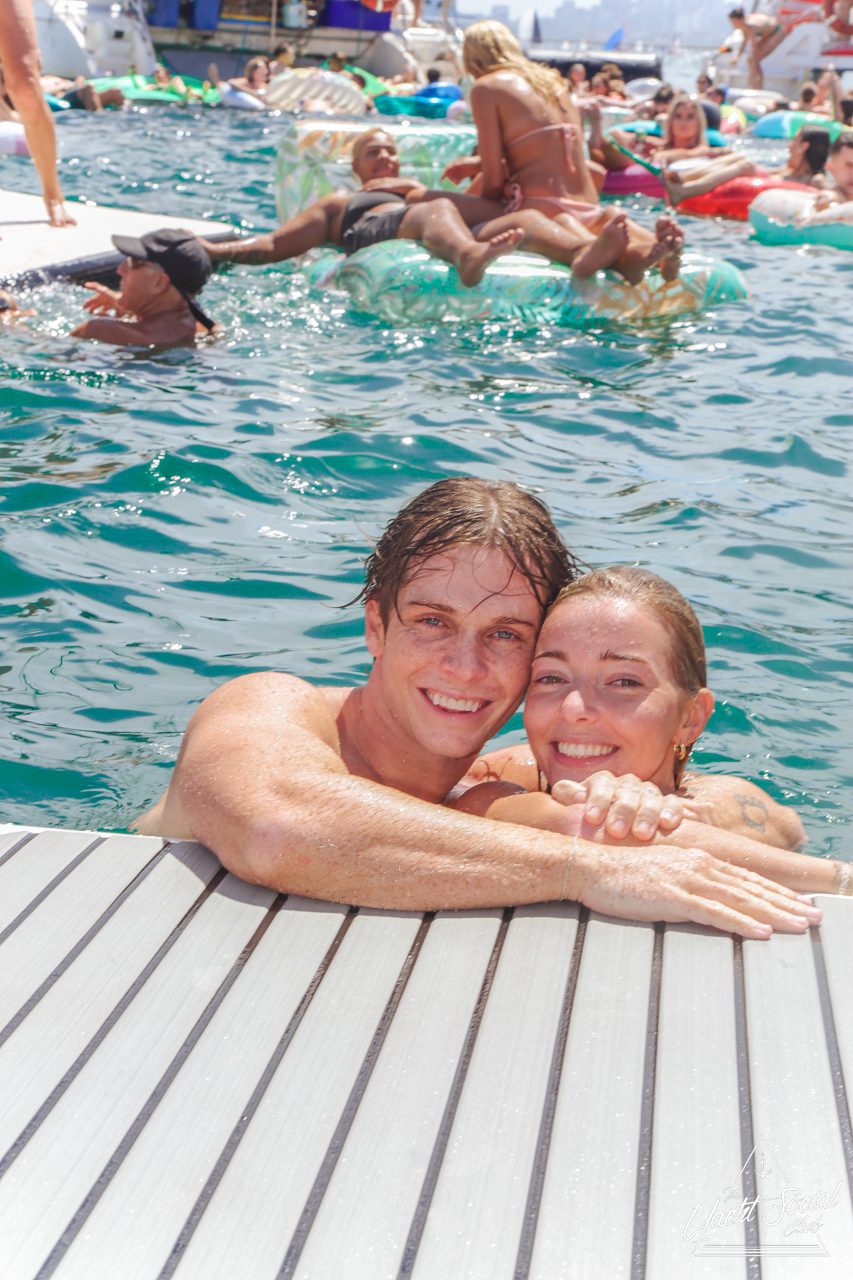 Two people smile at the camera on a boat, with the woman blowing a kiss and the man making a shaka hand sign. The background shows a lively water party with boats and people swimming and relaxing.