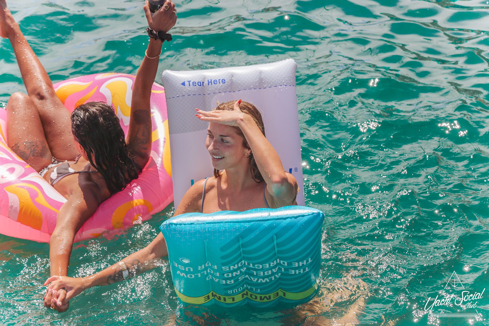 Two women relaxing on inflatable pool floats, smiling and holding drinks, surrounded by other people in the water with boats and a clear blue sky in the background. The scene is lively and summery.