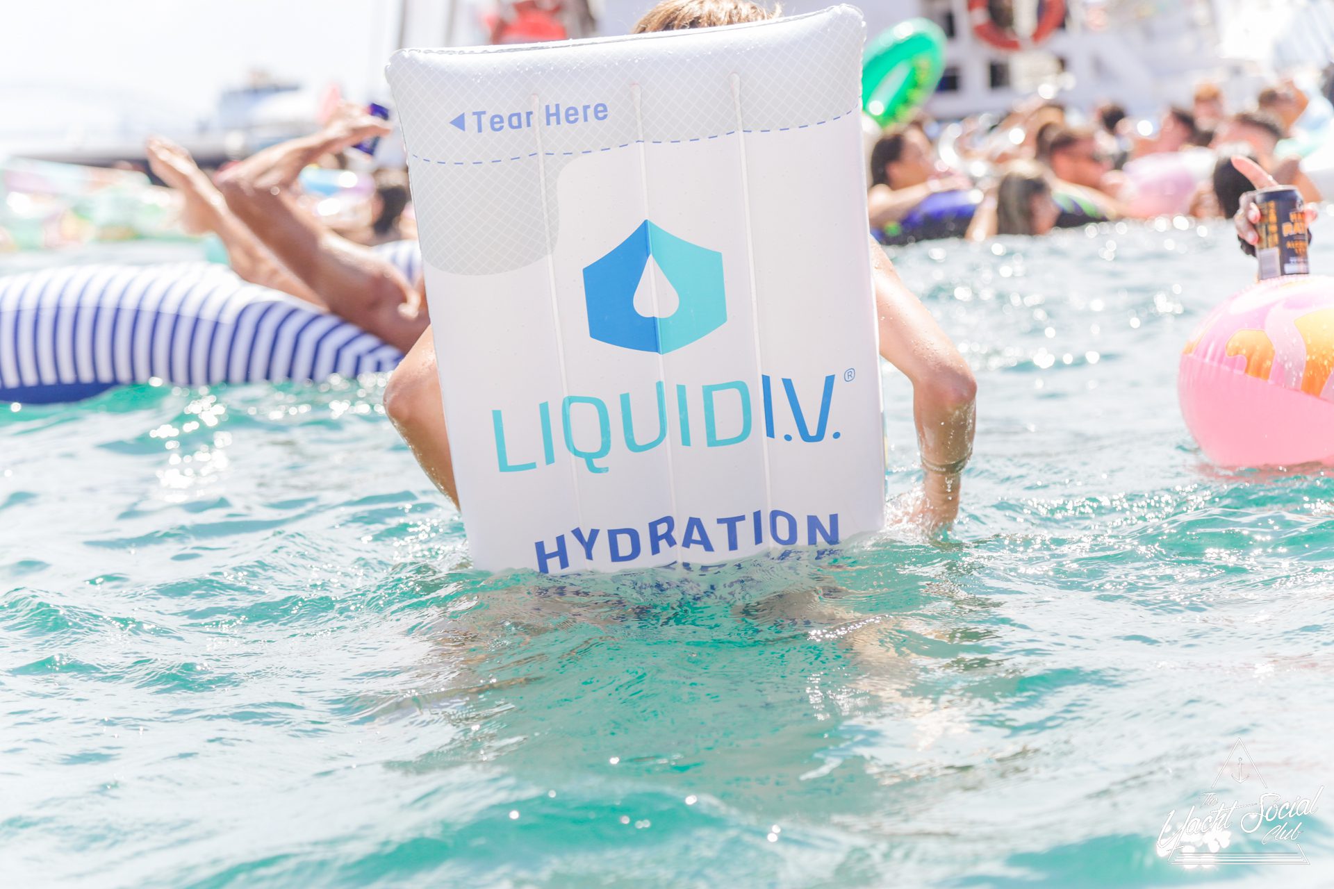 Two women in swimsuits smile at the camera on a boat, with a crowd of people swimming and lounging on inflatables in the ocean behind them, next to a large Liquid I.V. hydration mix display.