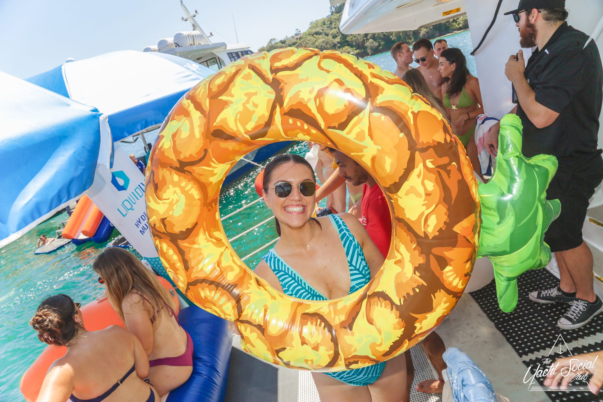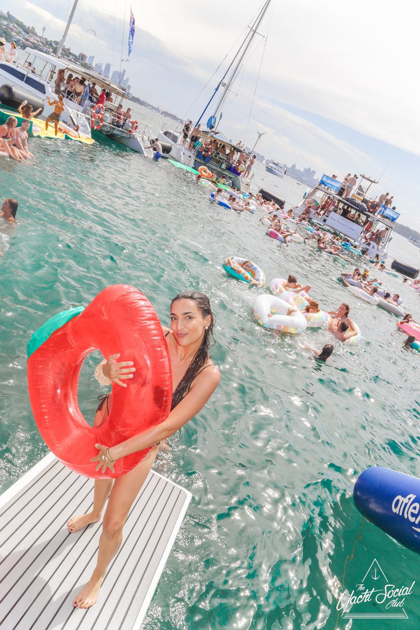 A woman in a swimsuit stands on a boat platform holding a red inflatable ring, smiling at the camera. Behind her, people float on inflatables and gather on boats in a lively, sunny water party scene.