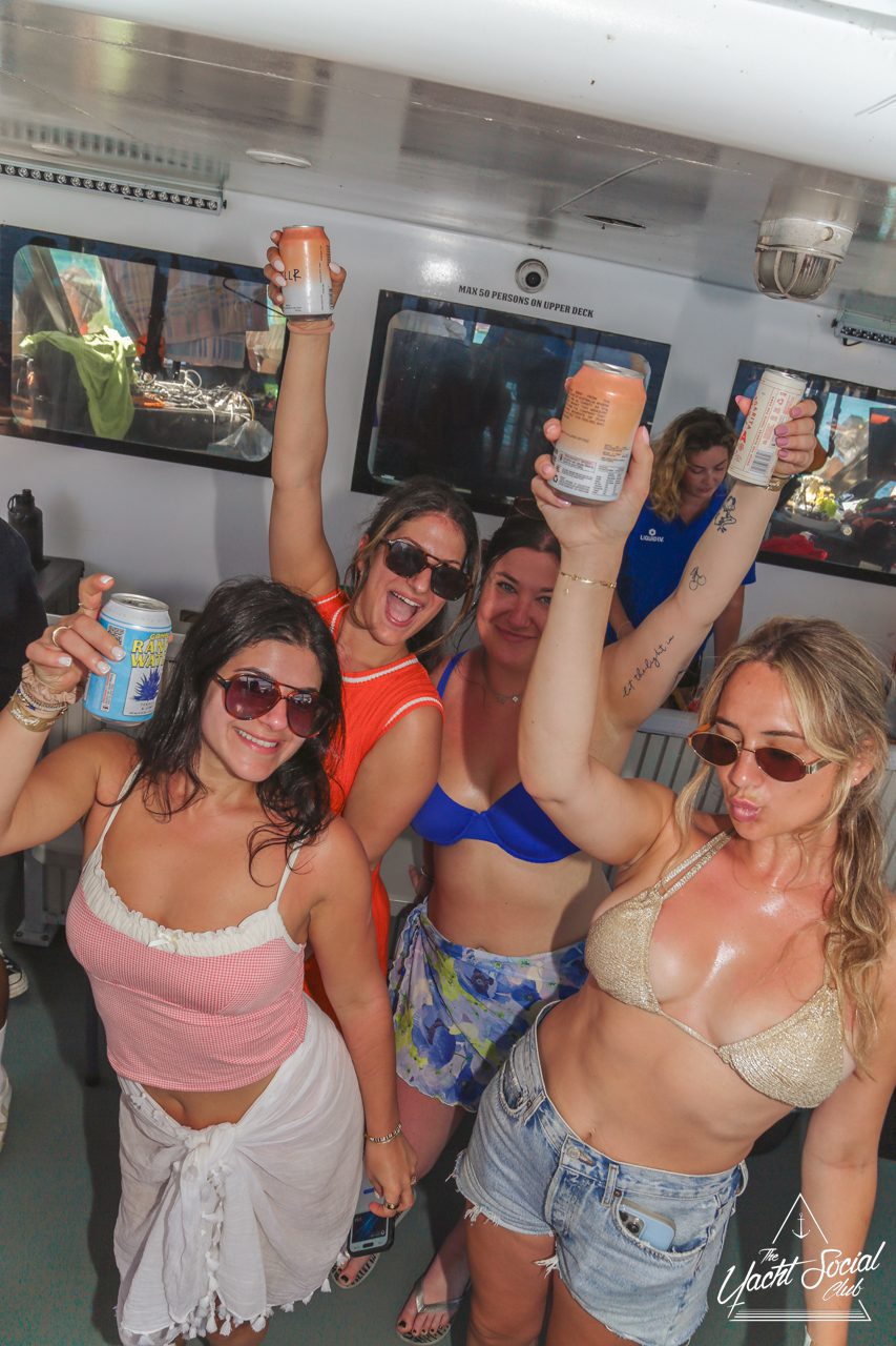 Four women in swimsuits smile and pose together on a boat, each holding a drink, with blue water, other boats, and many people enjoying a sunny day in the background.