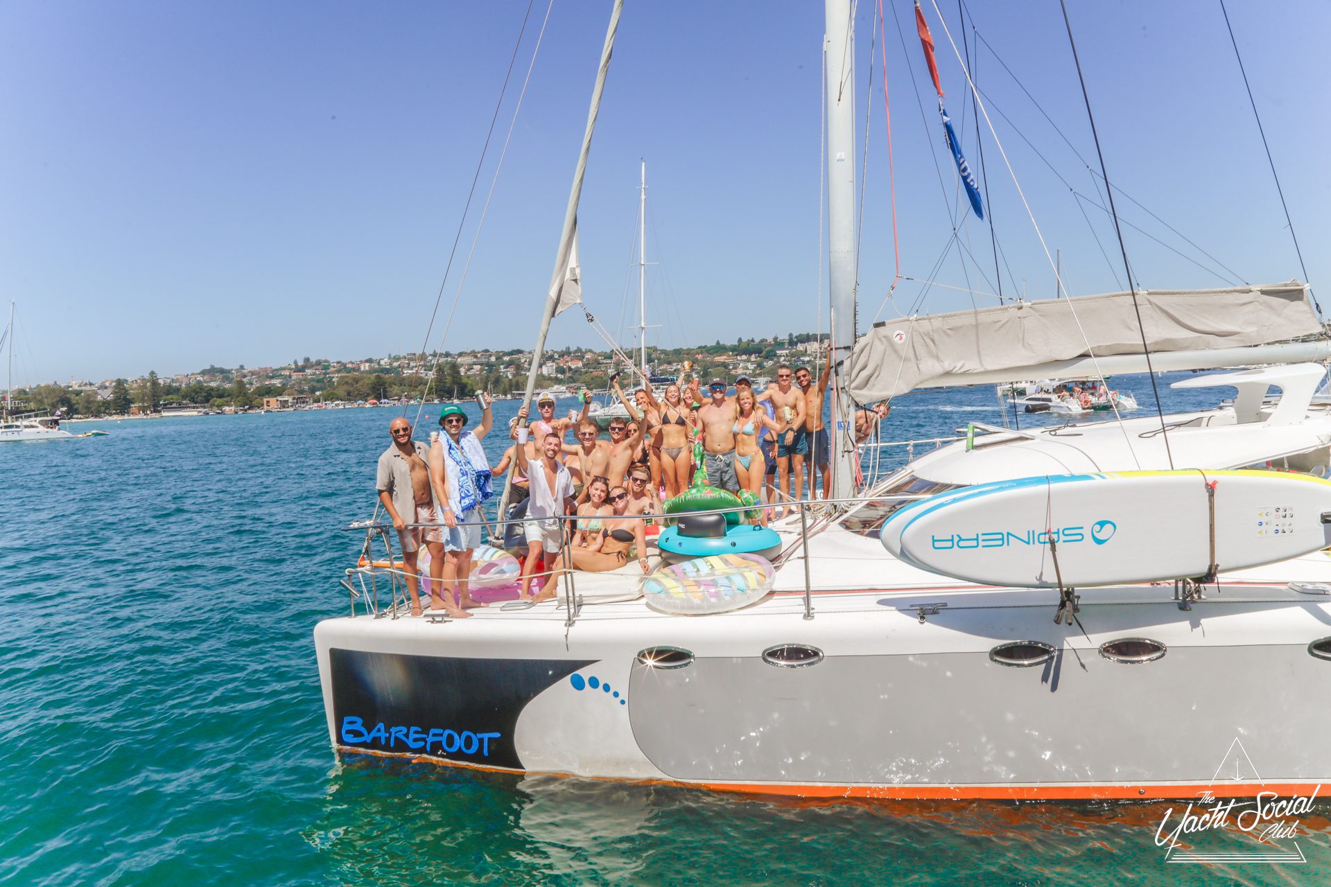 A group of people in swimsuits smile and pose on the deck of a white catamaran named "Barefoot," anchored on blue water with a cityscape and other boats in the background.