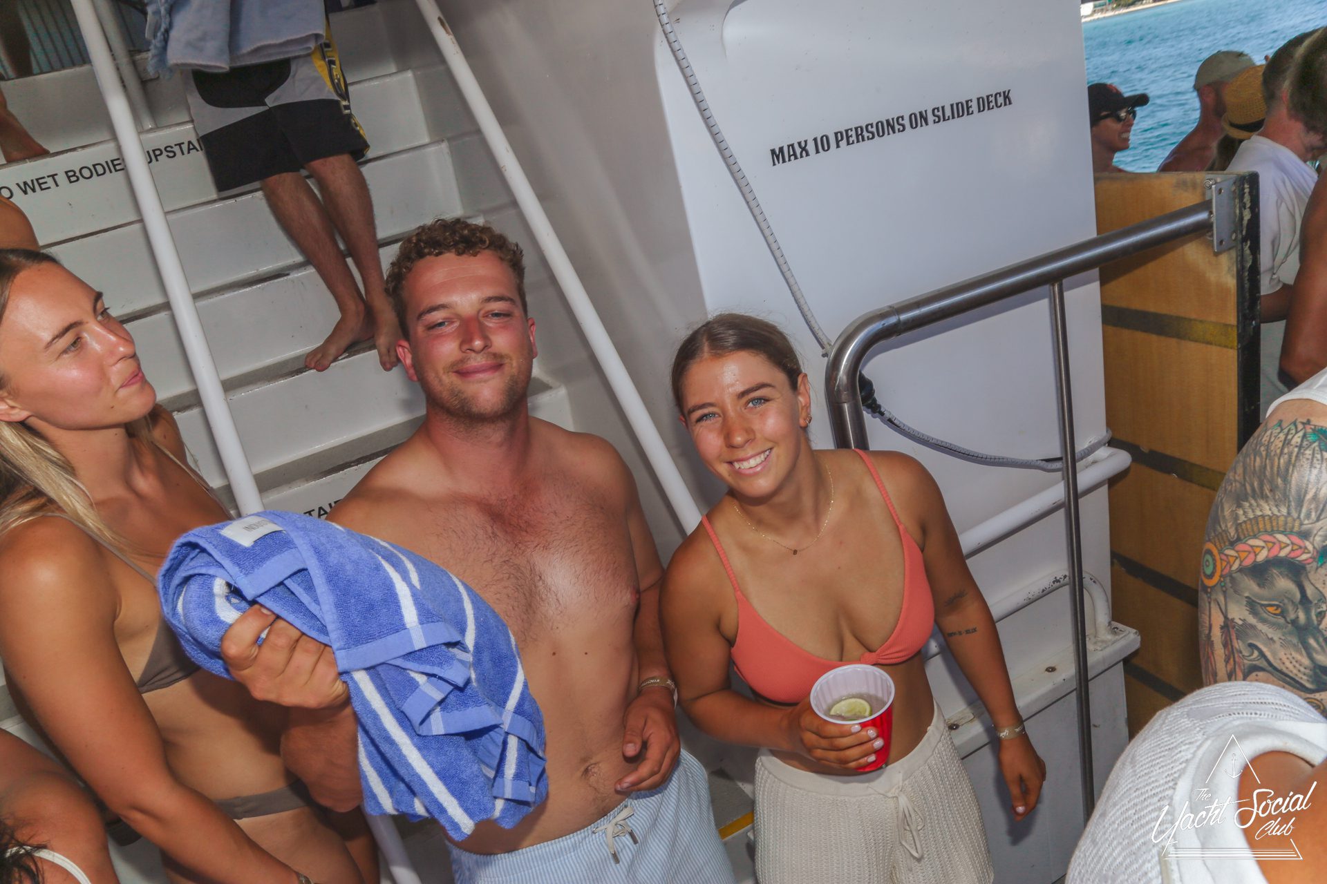 Three young adults in swimwear smile at the camera on a boat. One man holds a blue-striped towel, and a woman holds a red cup. A staircase and a sign saying “MAX 10 PERSONS ON SLIDE DECK” are visible in the background.