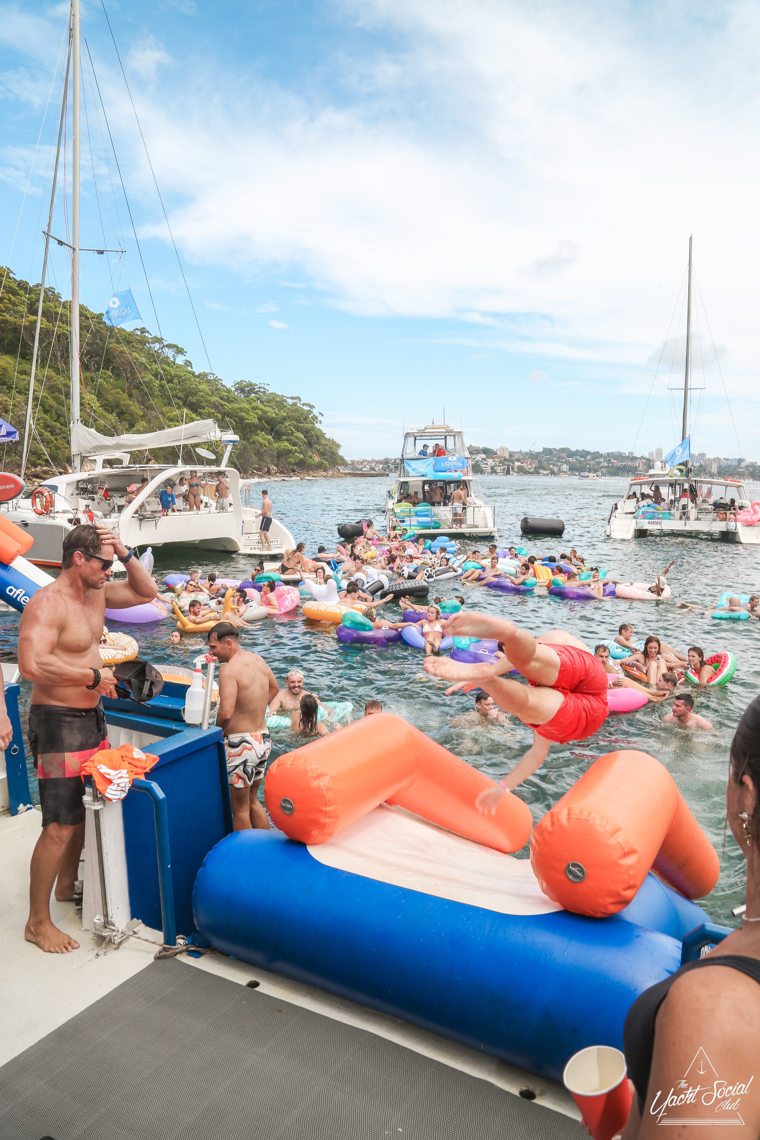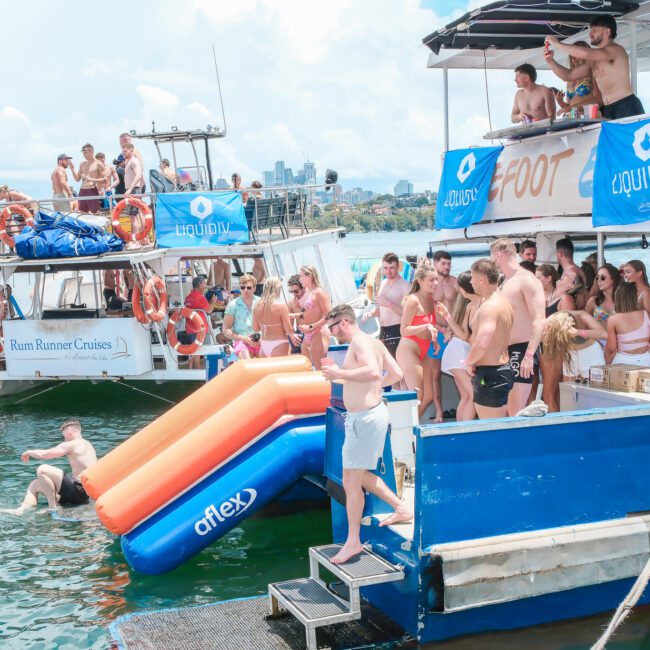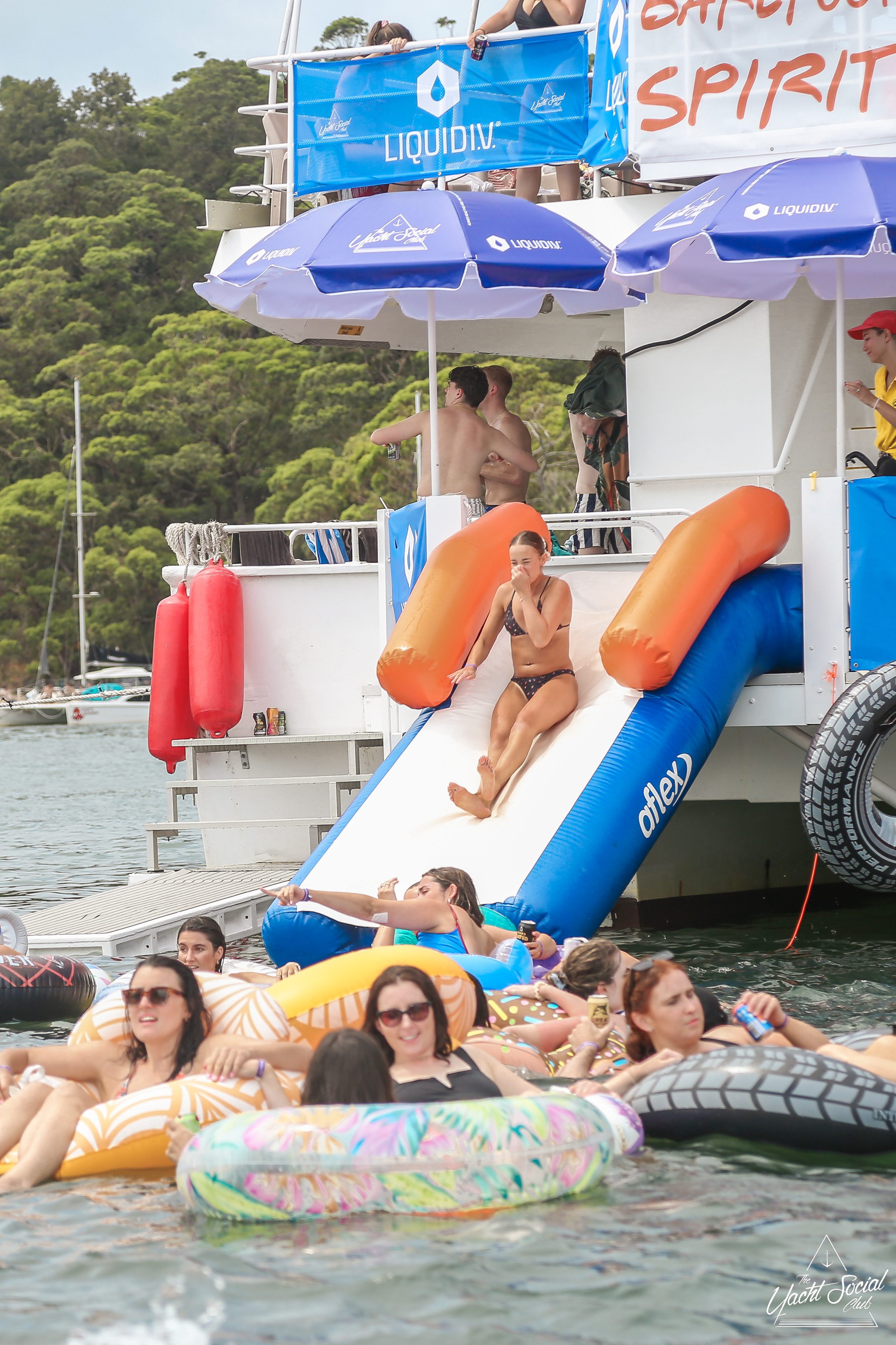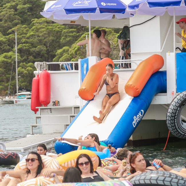 A lively boat party featuring people in swimsuits enjoying a sunny day. Some are on inflatable floats in the water, while others use a slide from the boat. Trees and boats in the background add to the festive atmosphere.