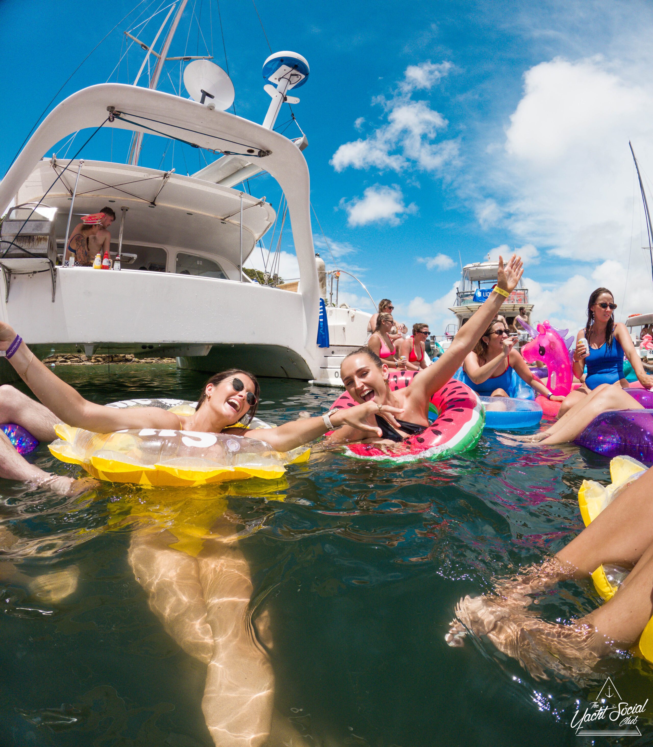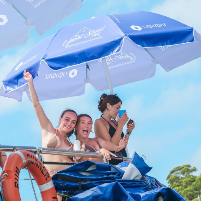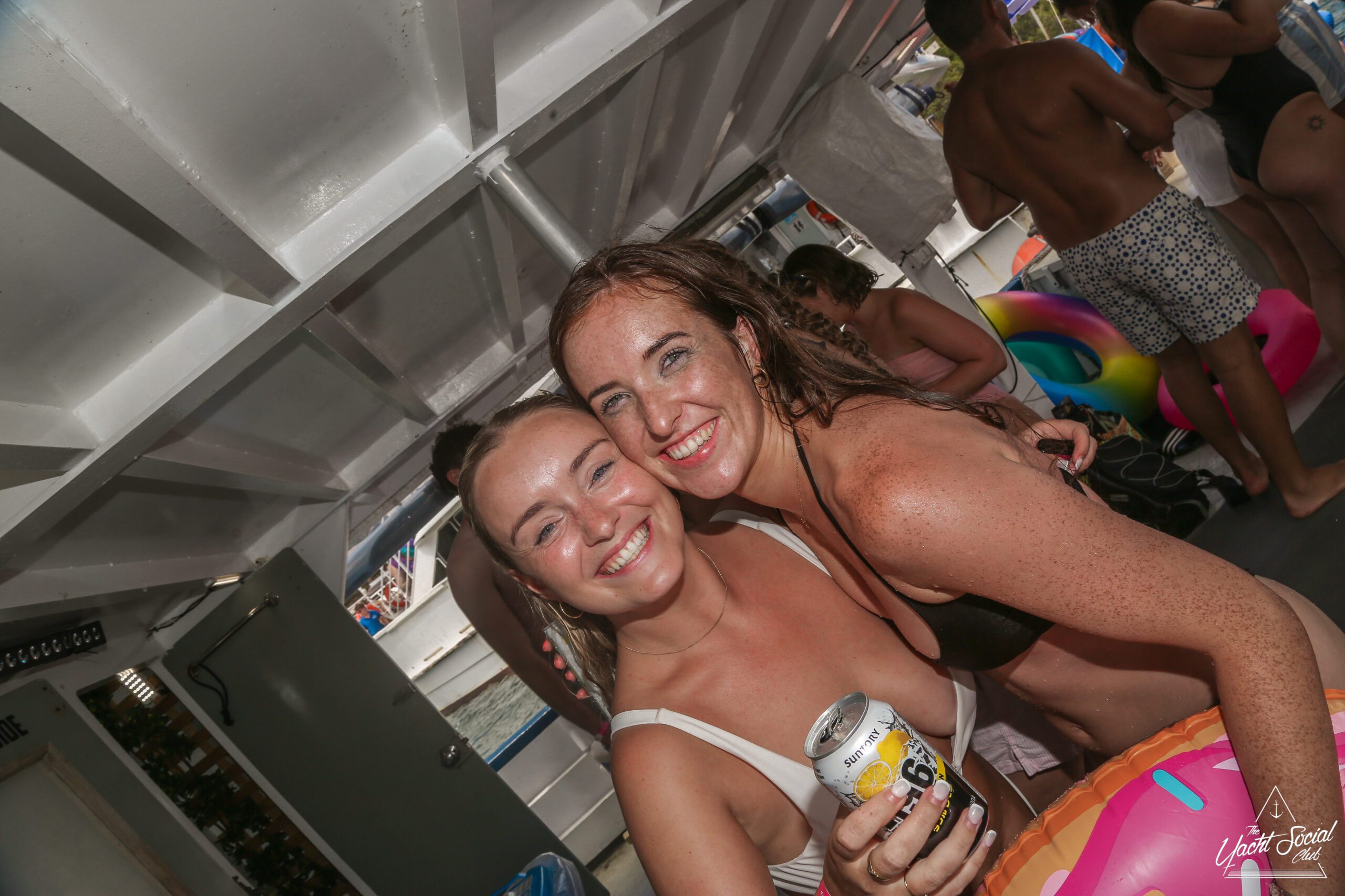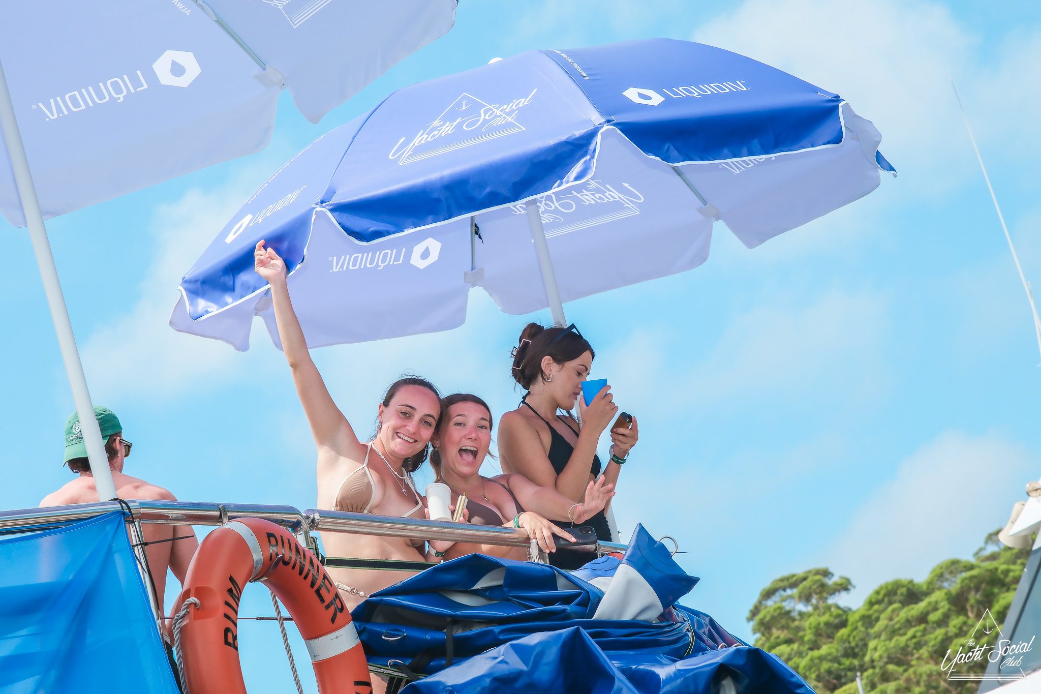 Two women enjoy a yacht party, smiling and holding drinks. They're surrounded by blue umbrellas with "Yacht Social Club" branding. In the background, people swim and relax on nearby boats under a clear sky.