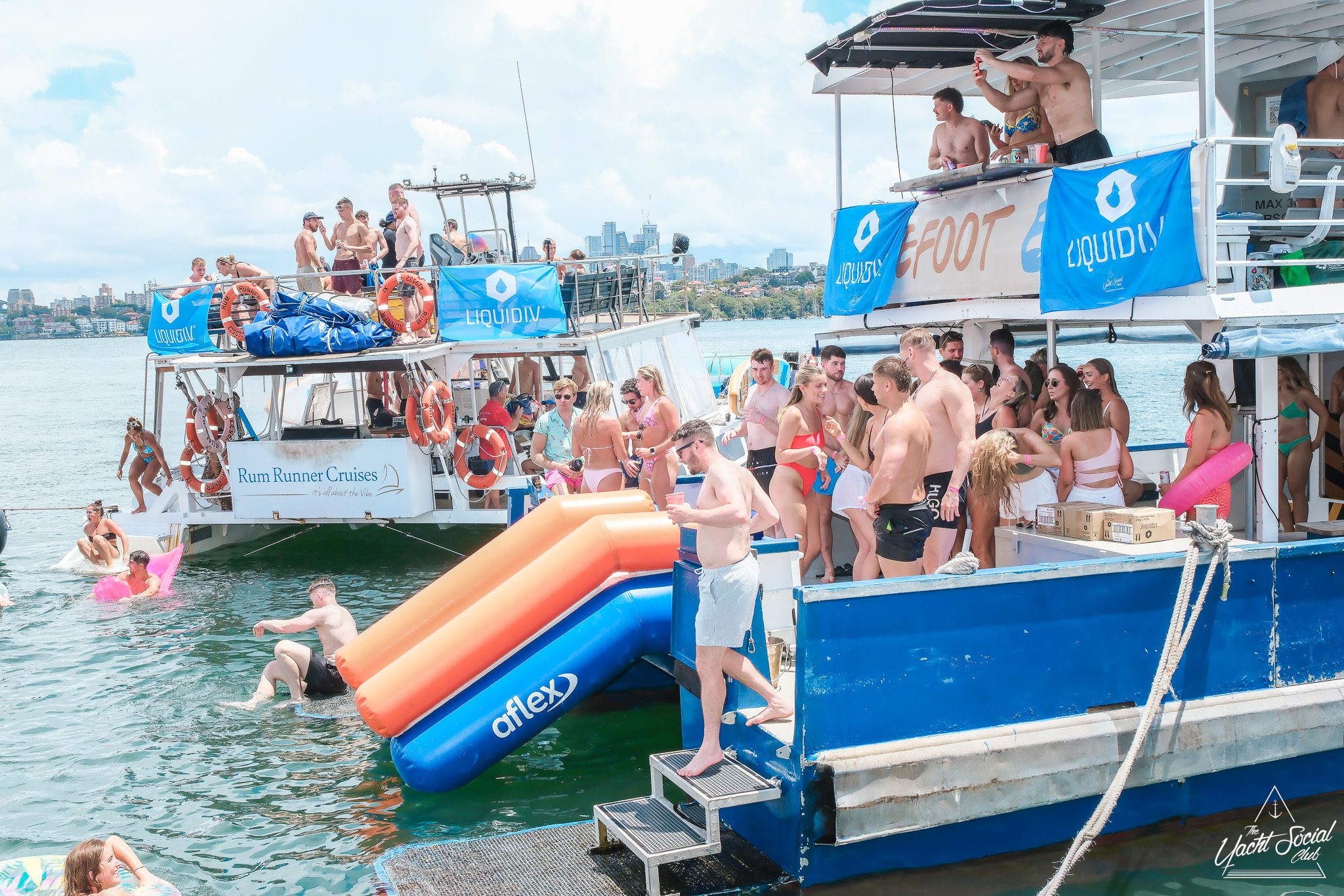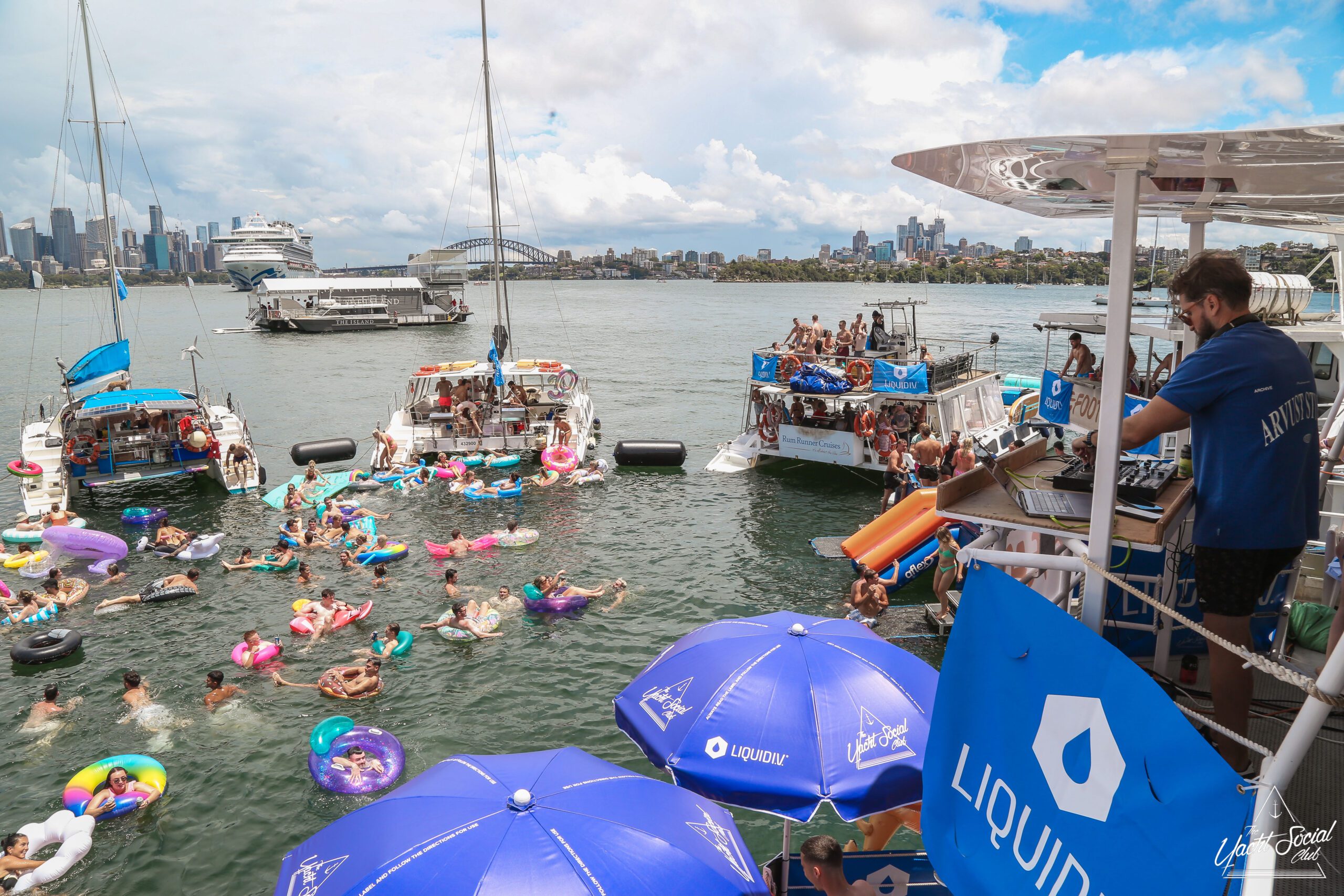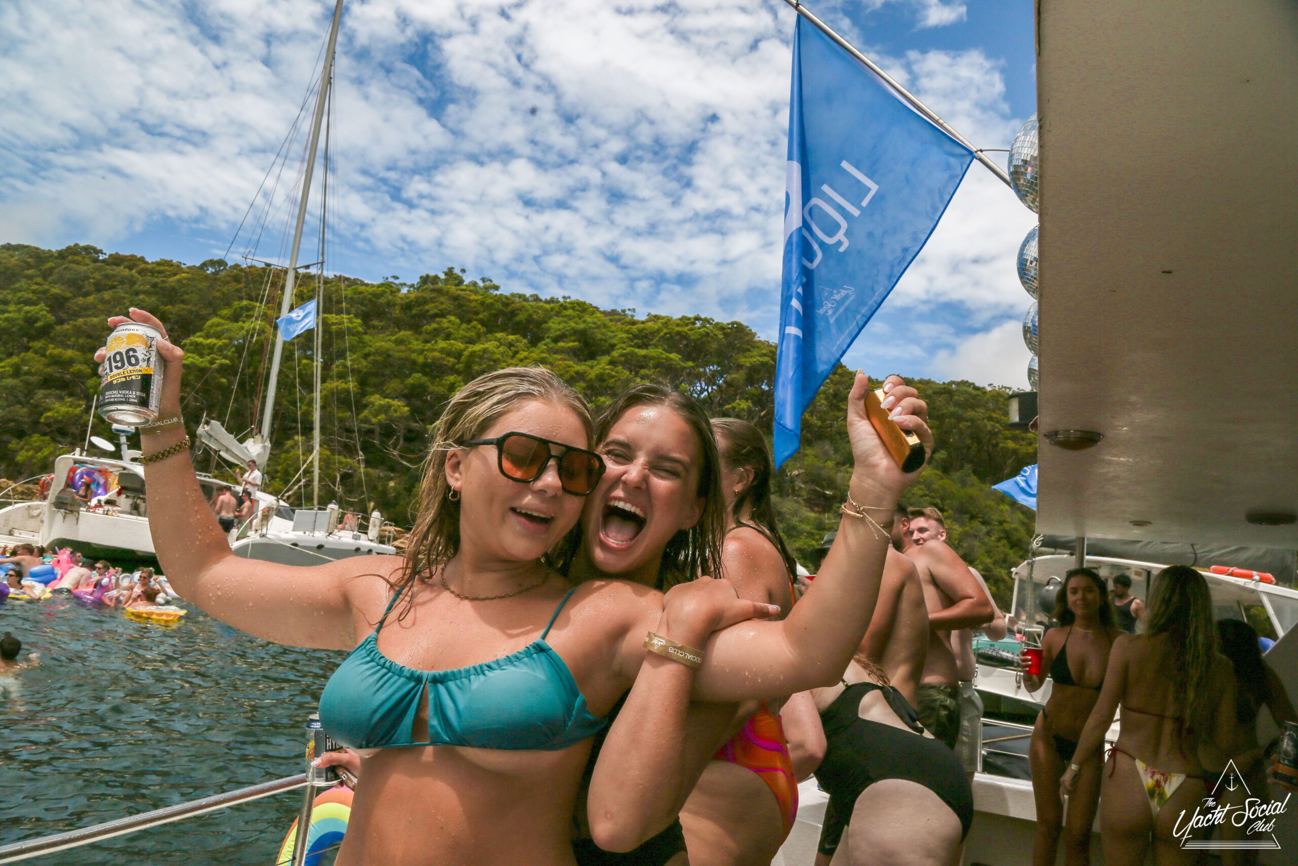 Two women enjoy a yacht party, smiling and holding drinks. They're surrounded by blue umbrellas with "Yacht Social Club" branding. In the background, people swim and relax on nearby boats under a clear sky.