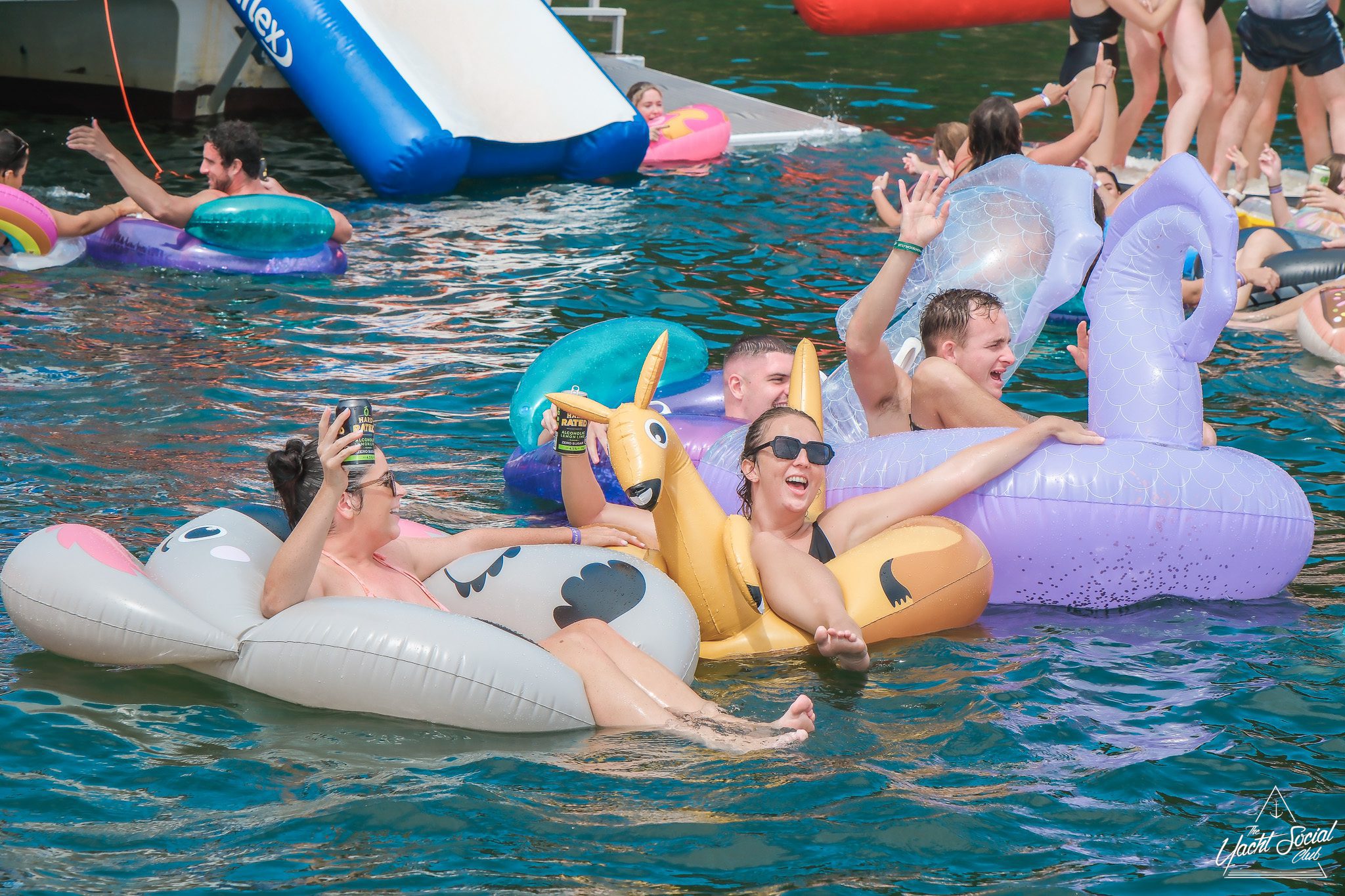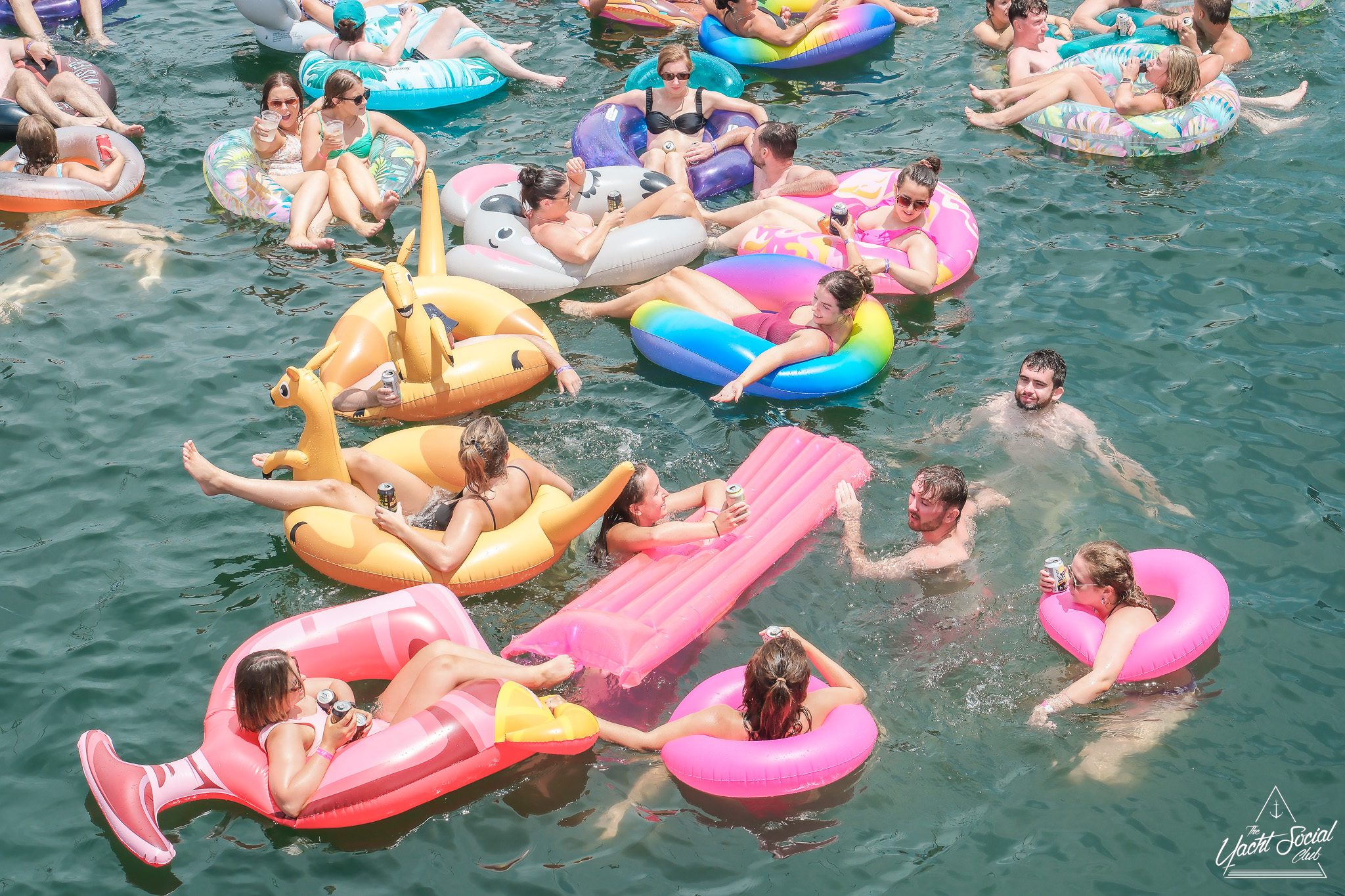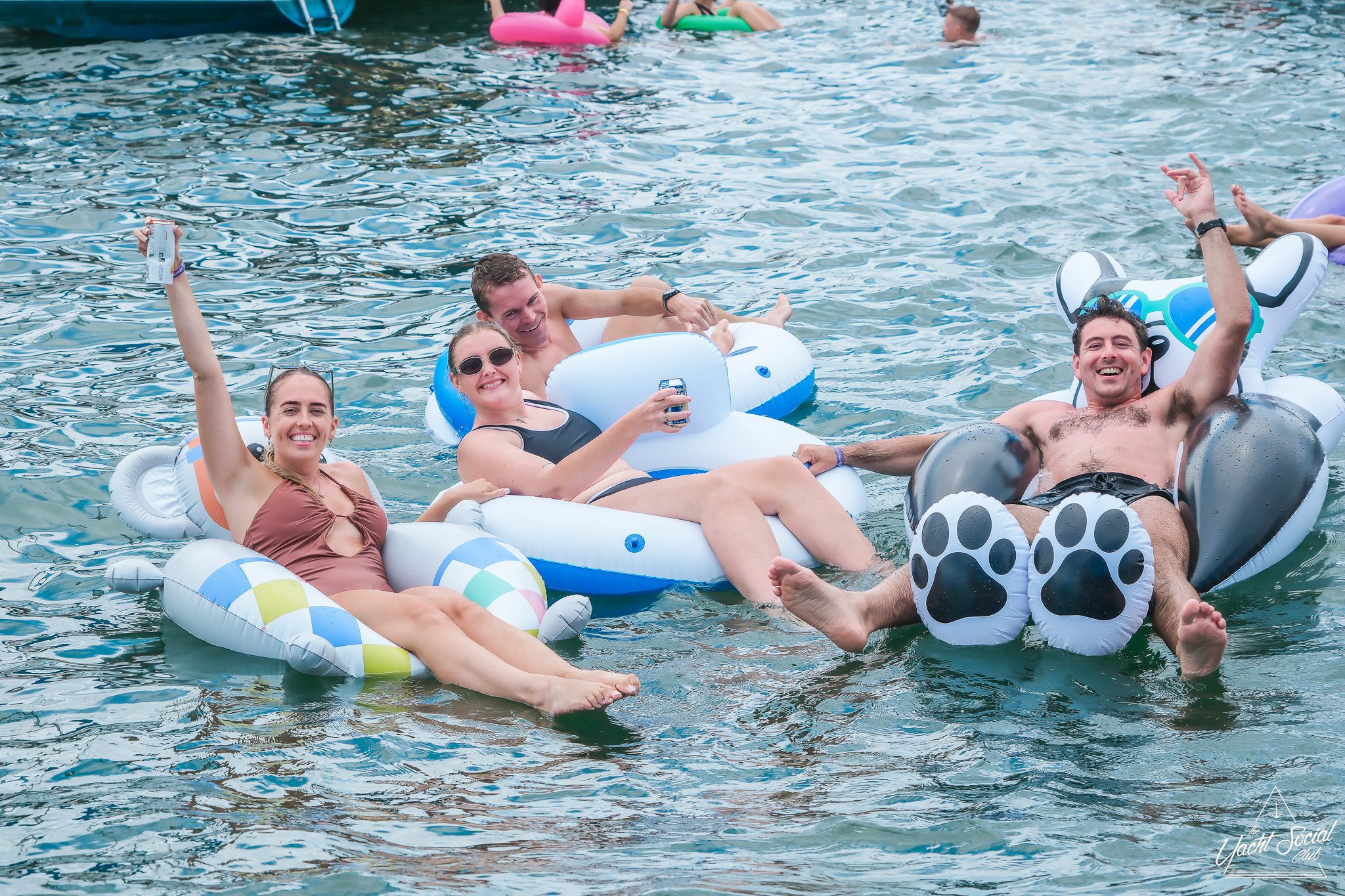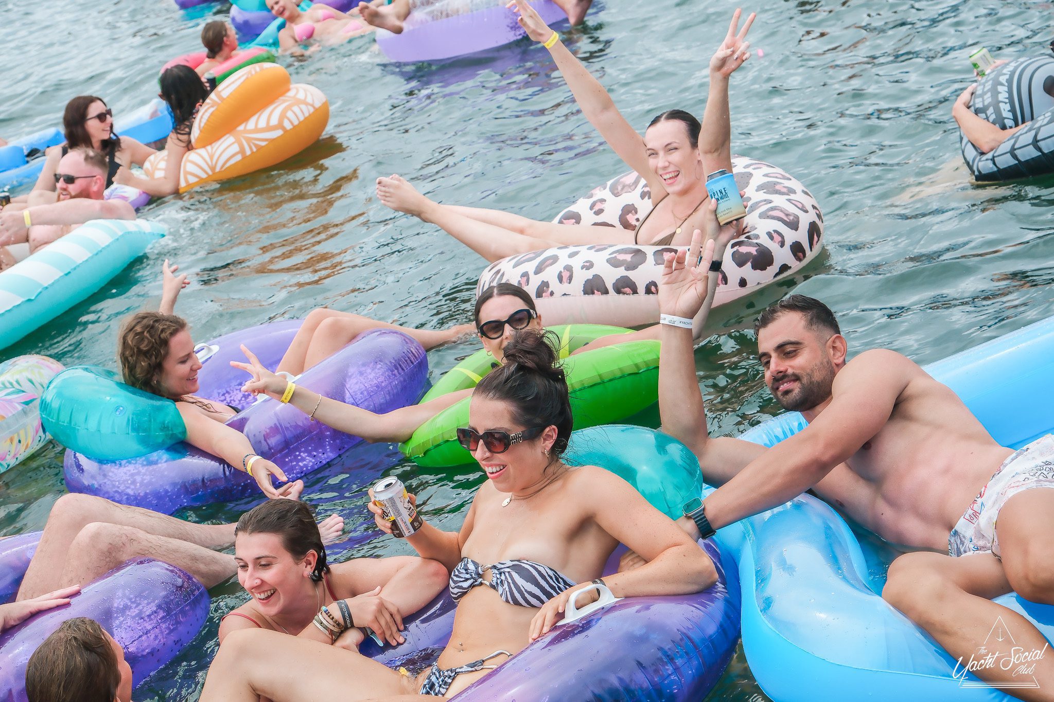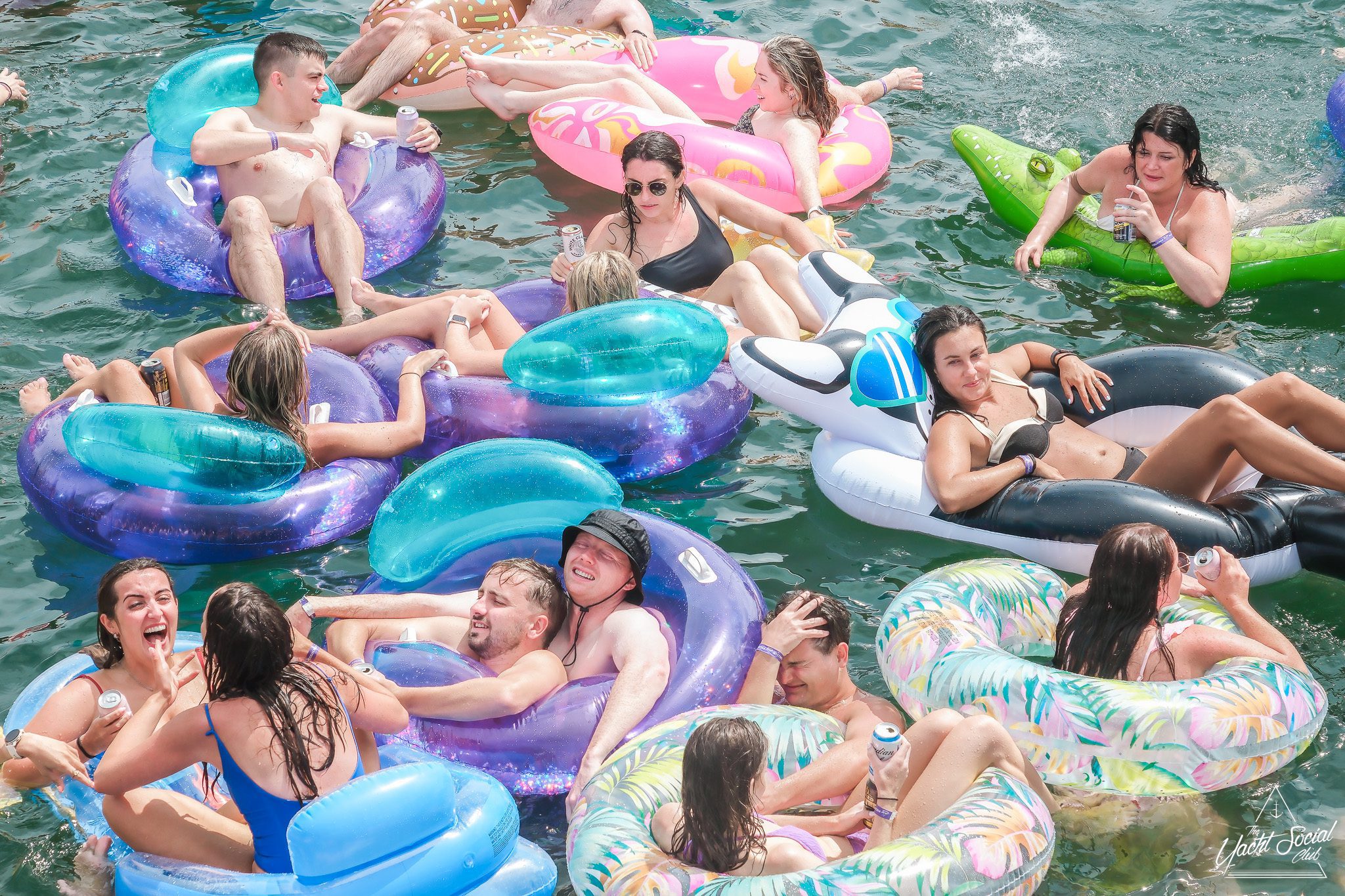 Two people in swimsuits enjoy lounging on inflatable floaties in the water, holding drinks. In the background, a lively crowd is seen on a boat, with more inflatable toys and lively decorations.