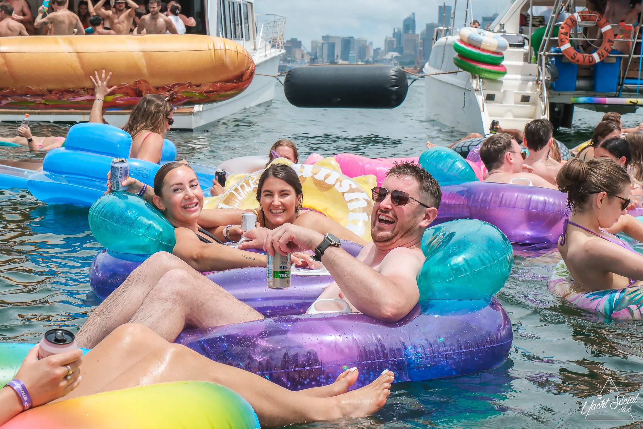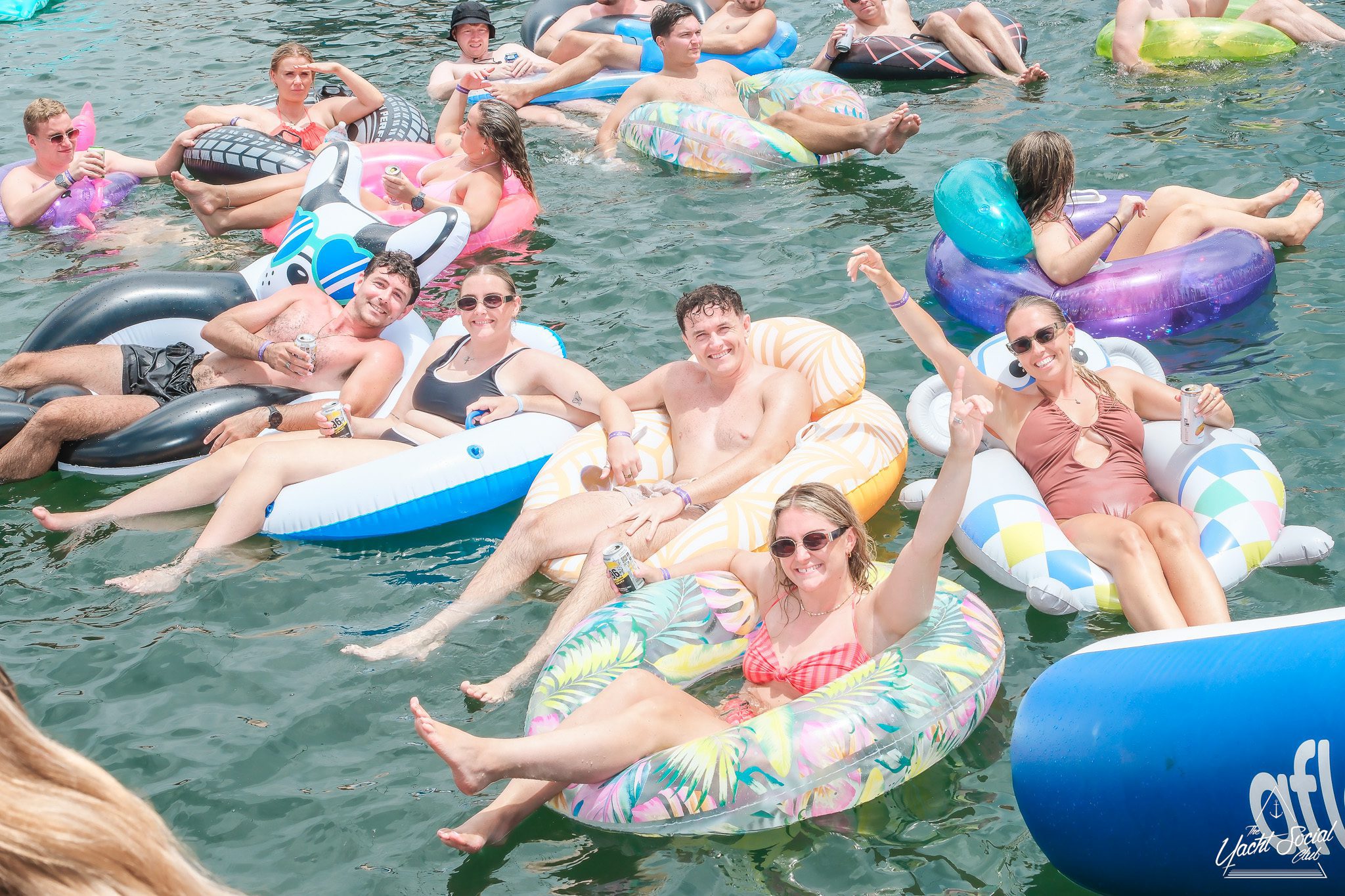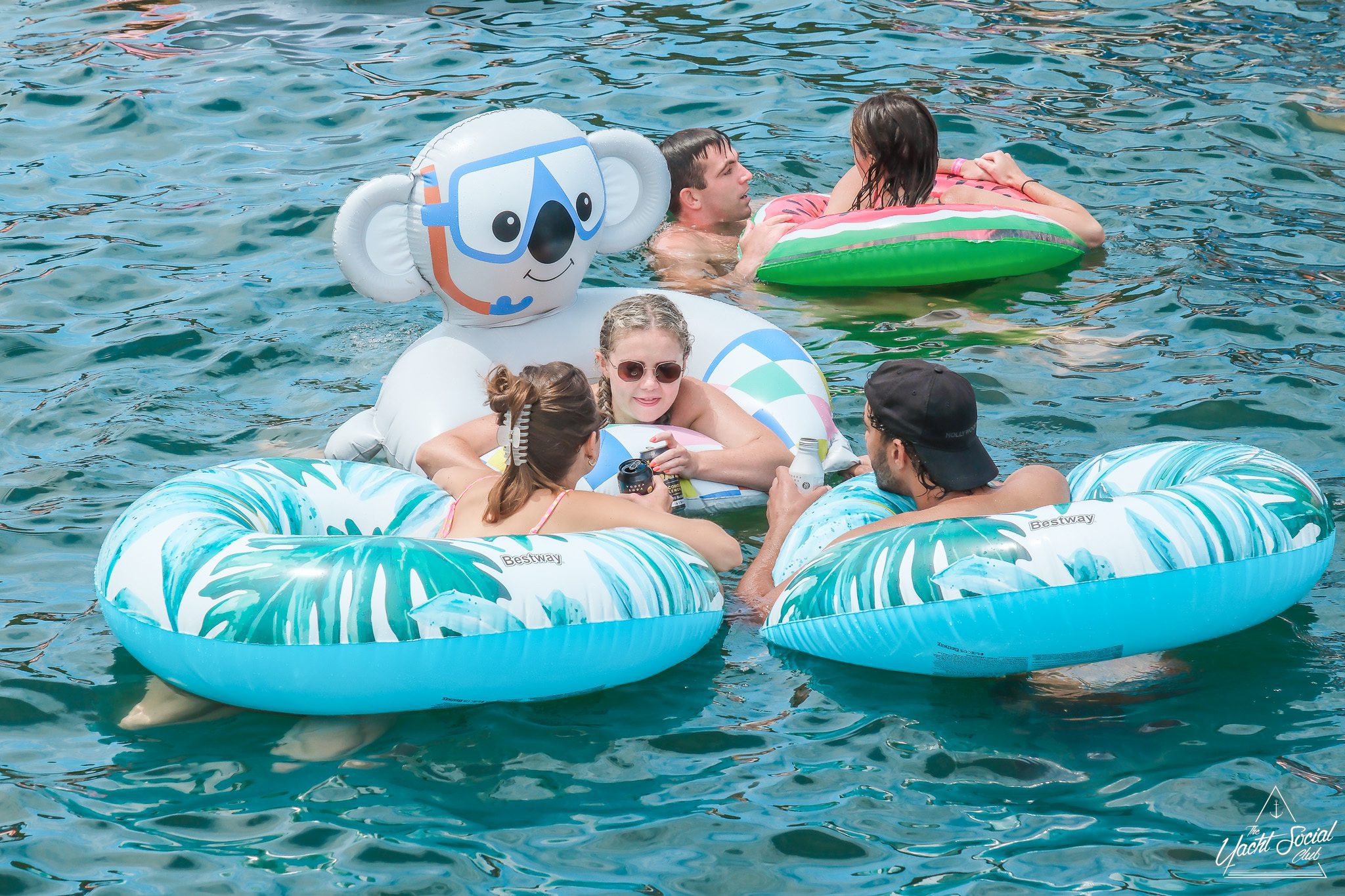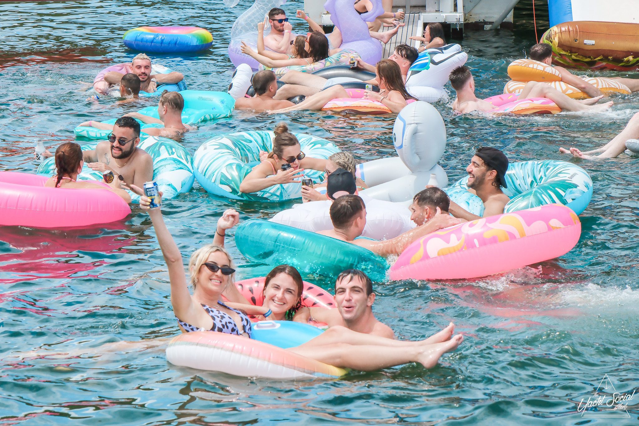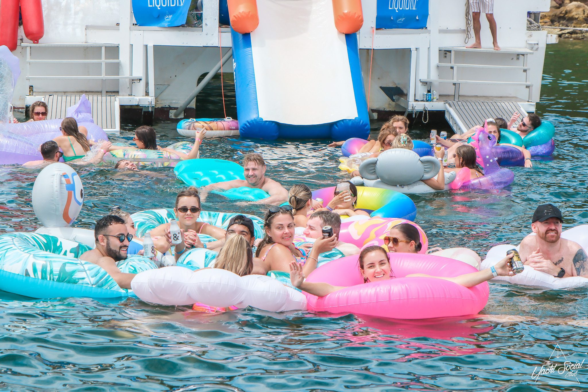 Two people in swimsuits enjoy lounging on inflatable floaties in the water, holding drinks. In the background, a lively crowd is seen on a boat, with more inflatable toys and lively decorations.