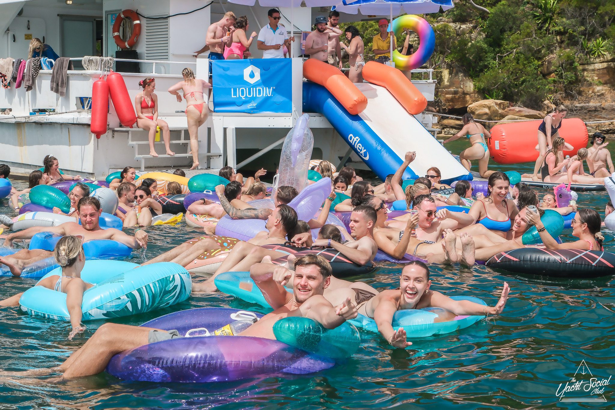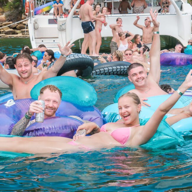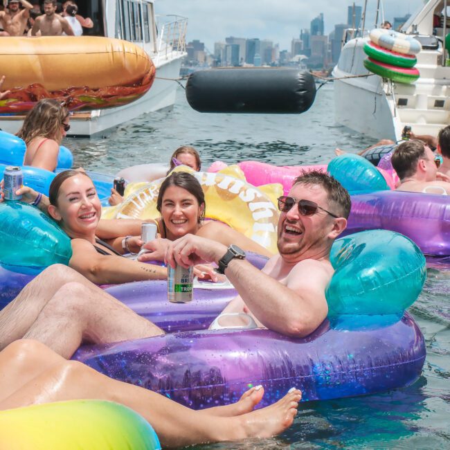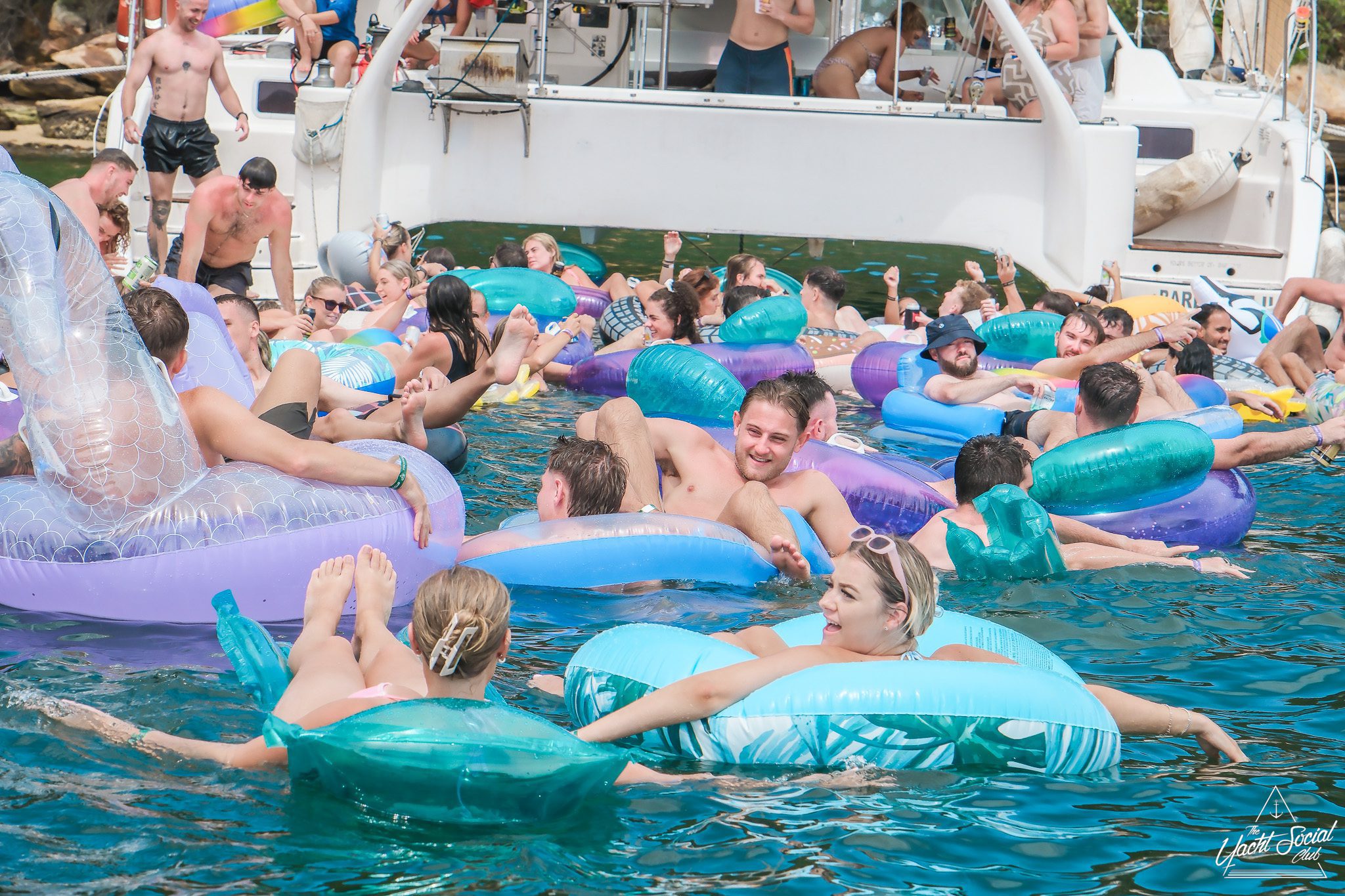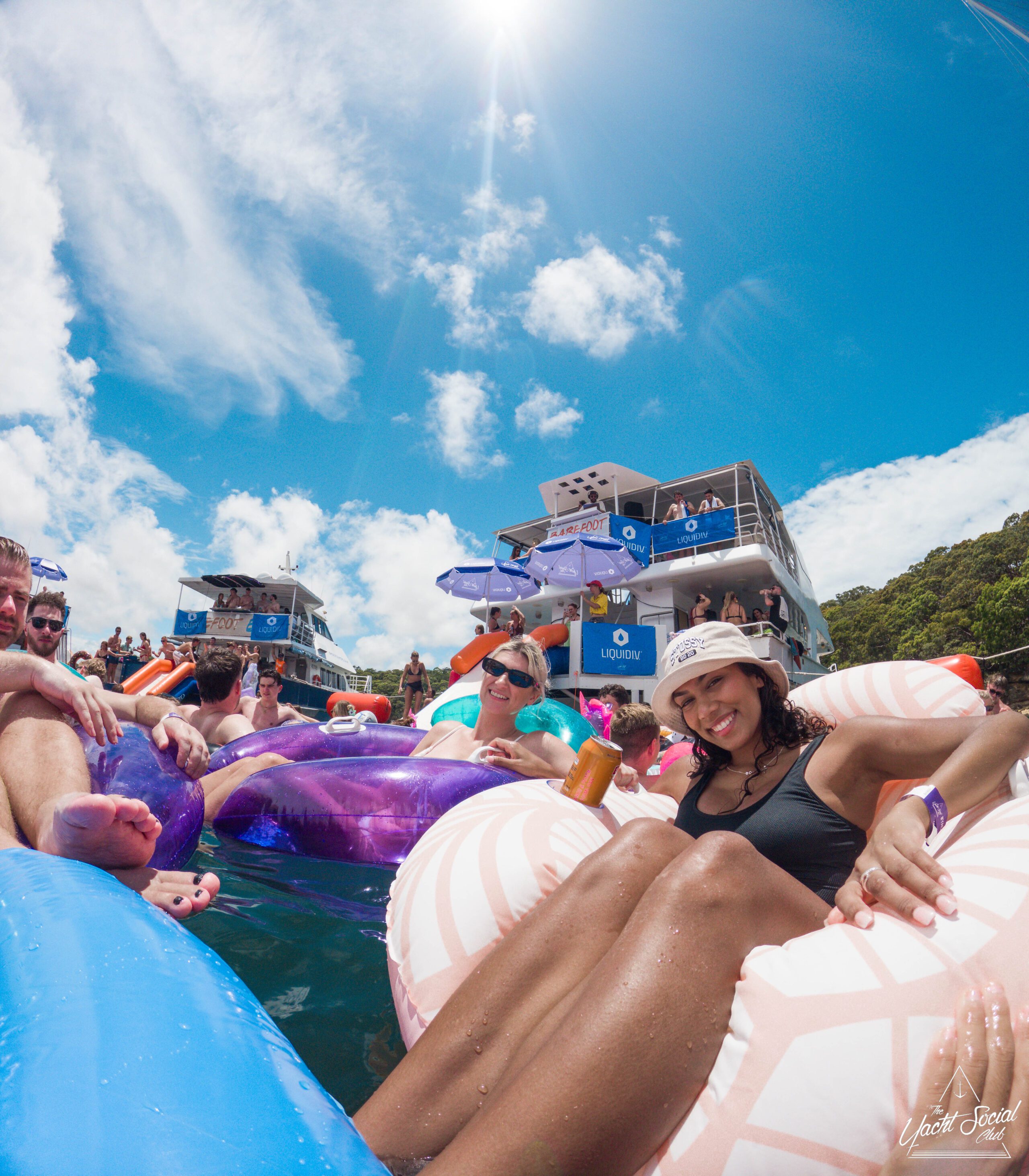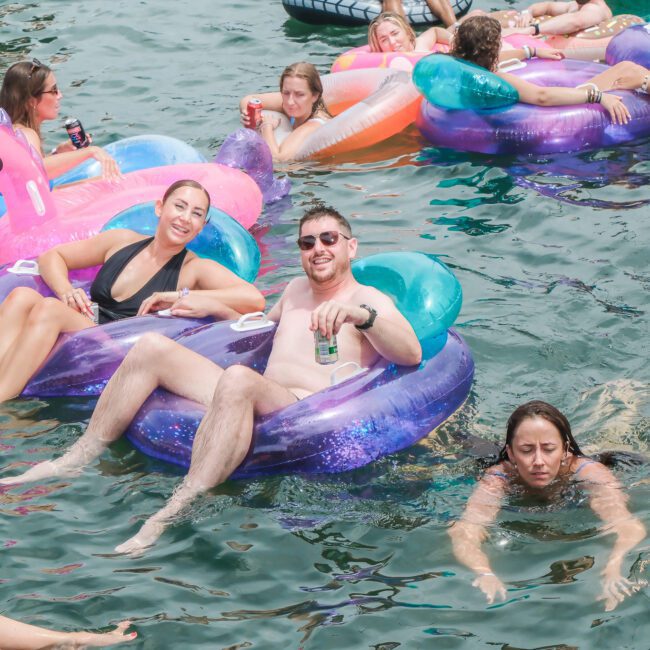 Two people in swimsuits enjoy lounging on inflatable floaties in the water, holding drinks. In the background, a lively crowd is seen on a boat, with more inflatable toys and lively decorations.