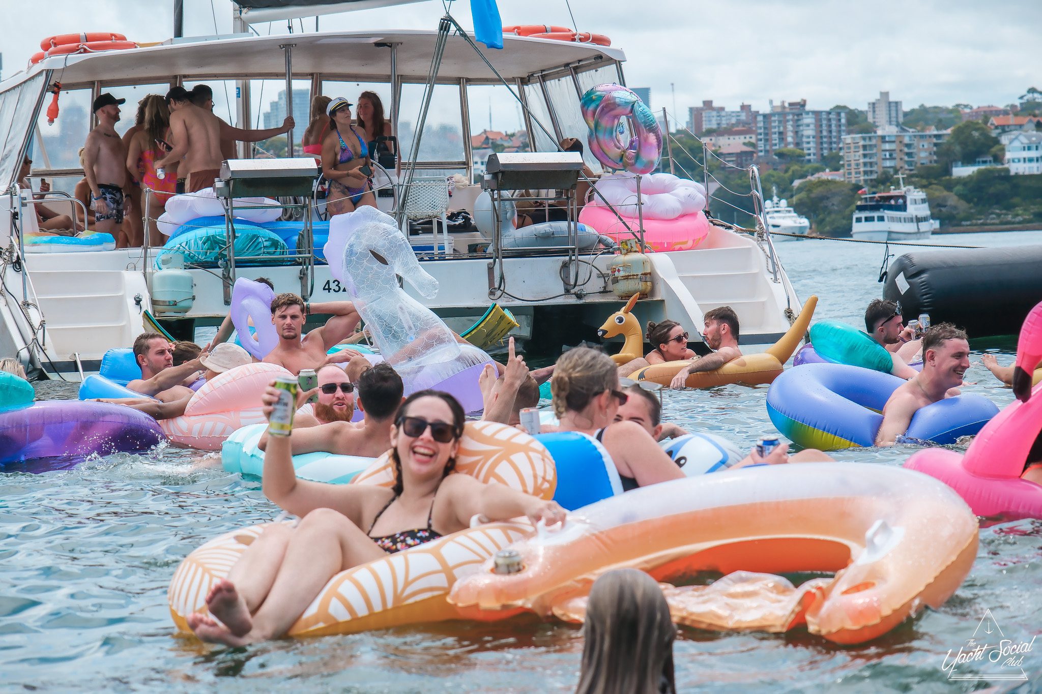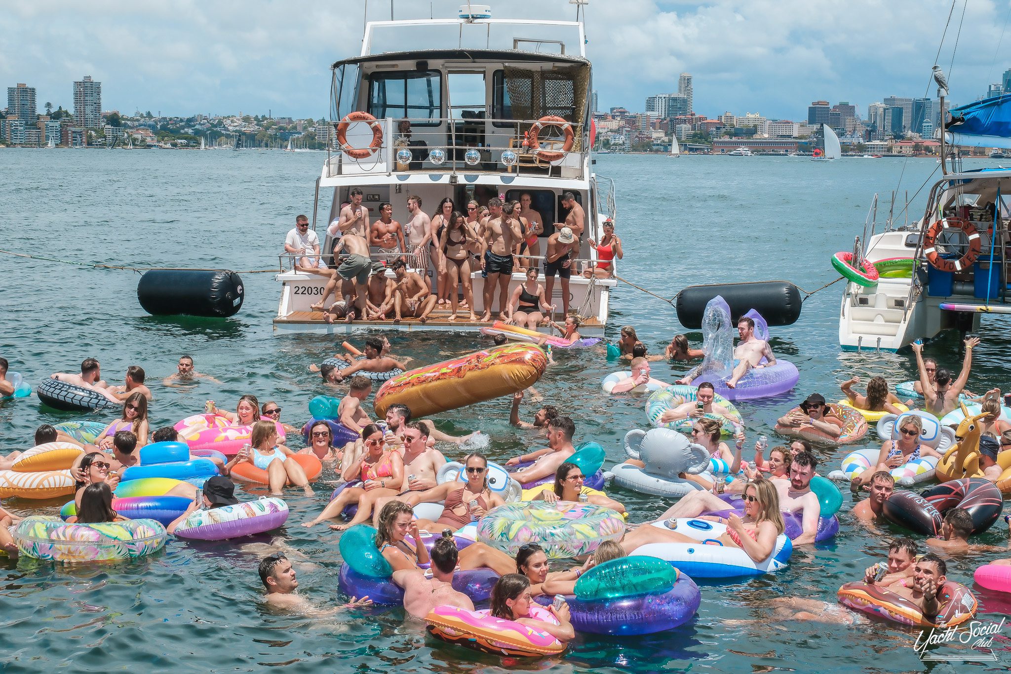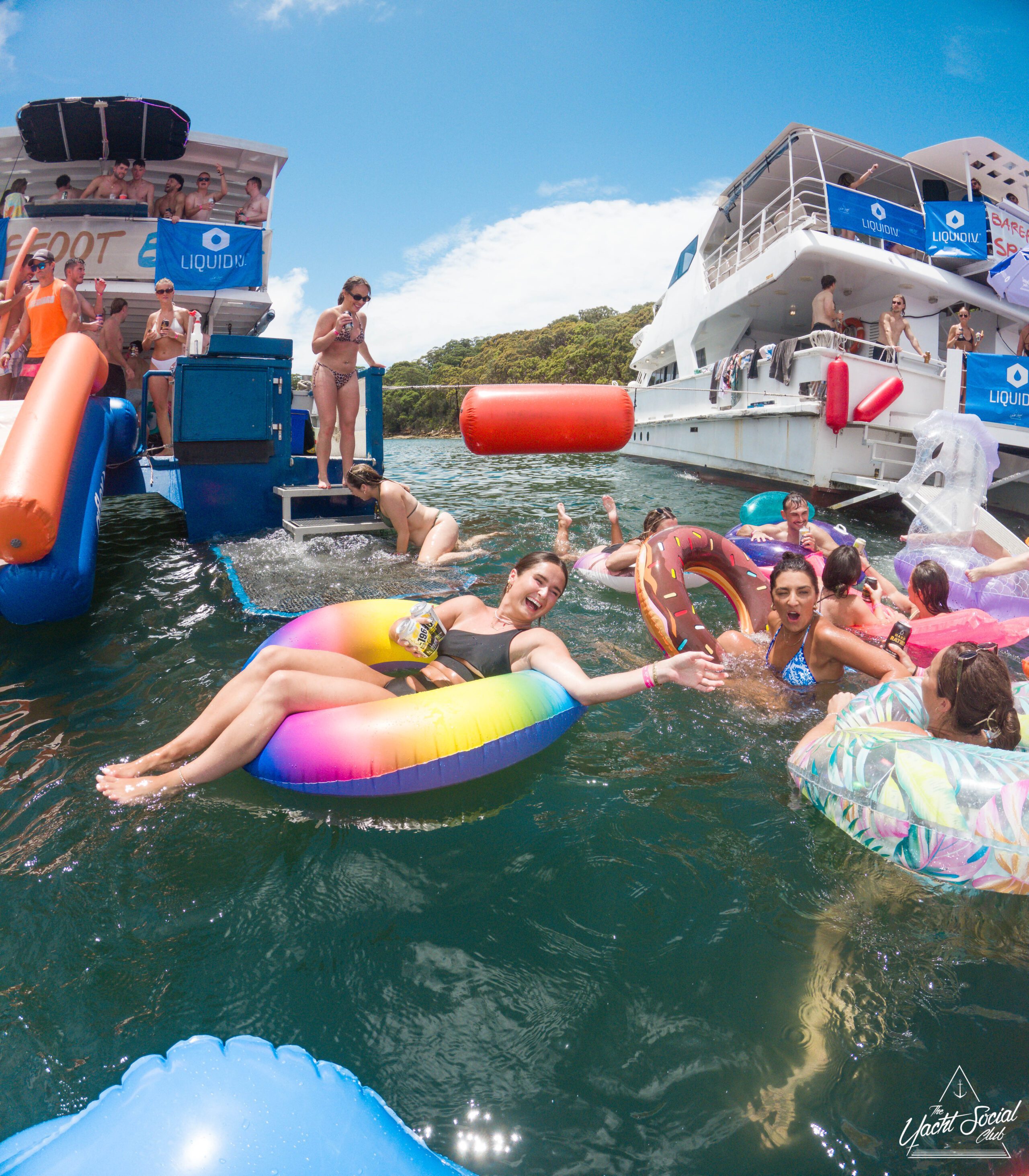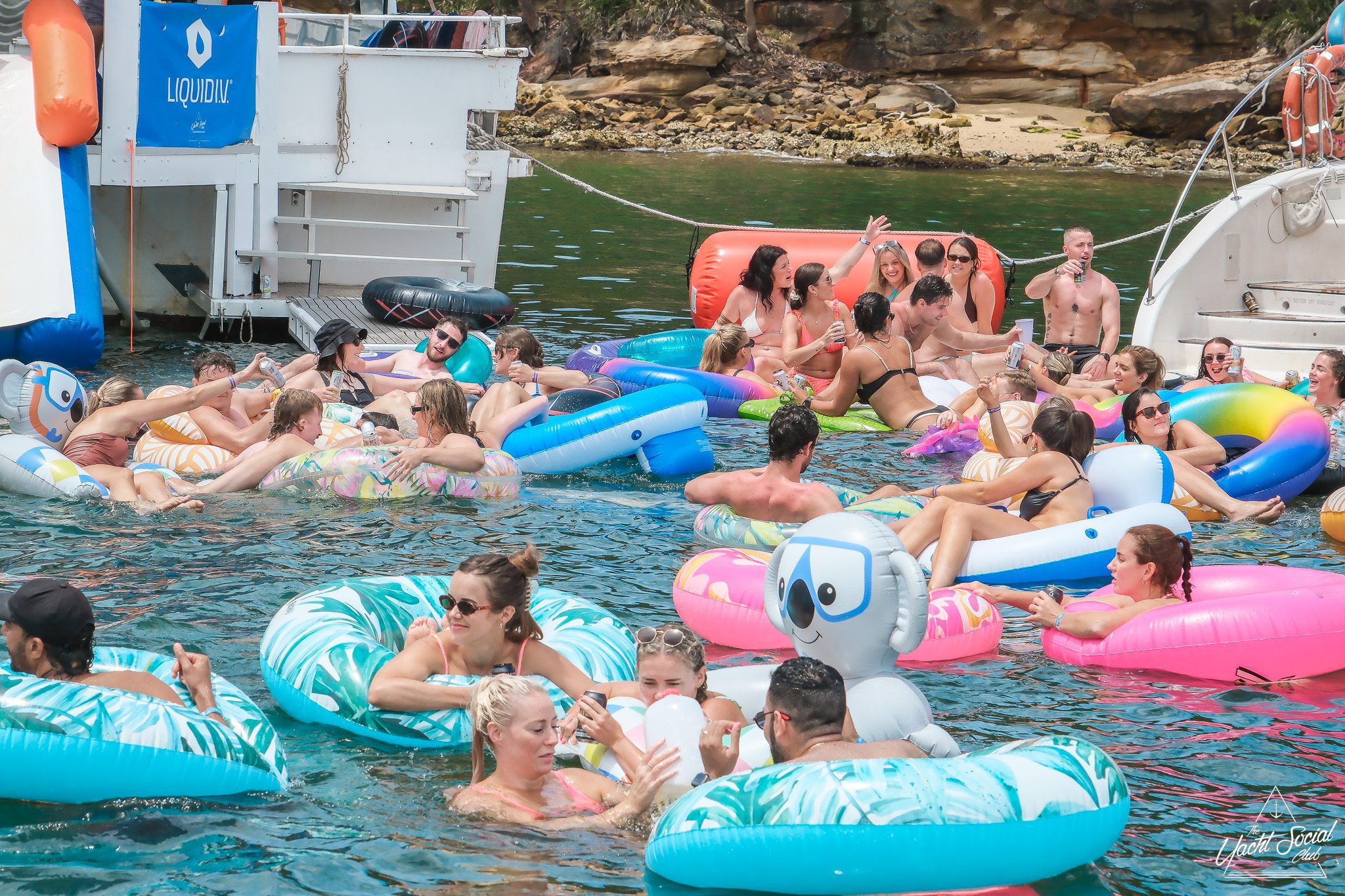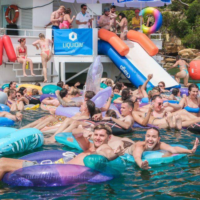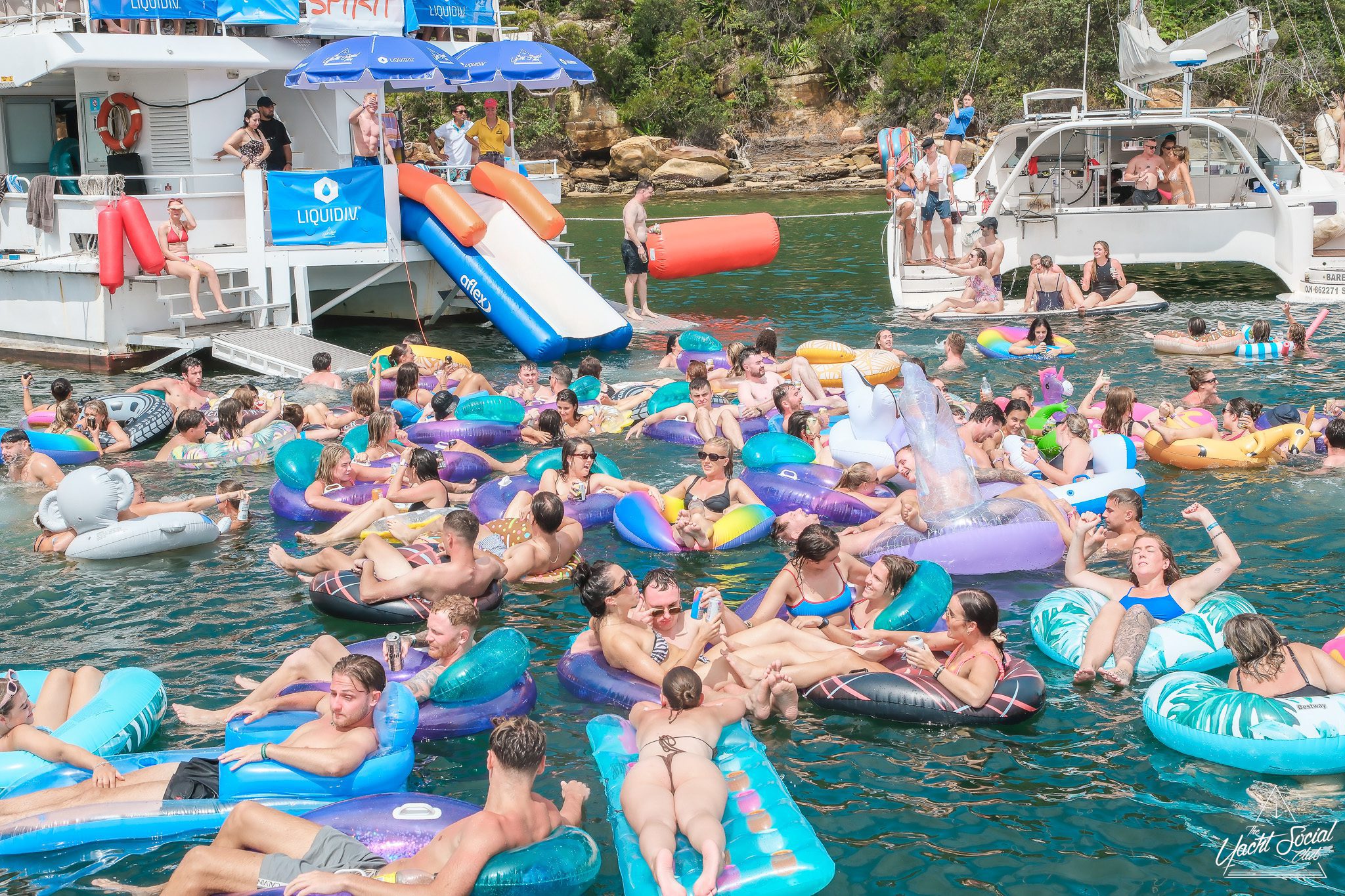 Two people in swimsuits enjoy lounging on inflatable floaties in the water, holding drinks. In the background, a lively crowd is seen on a boat, with more inflatable toys and lively decorations.