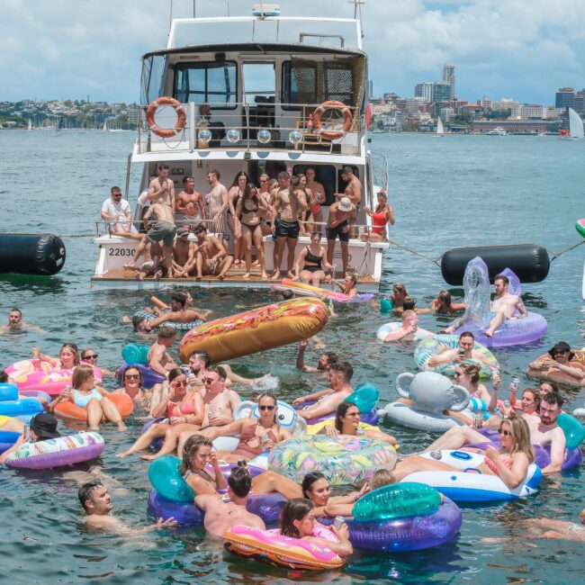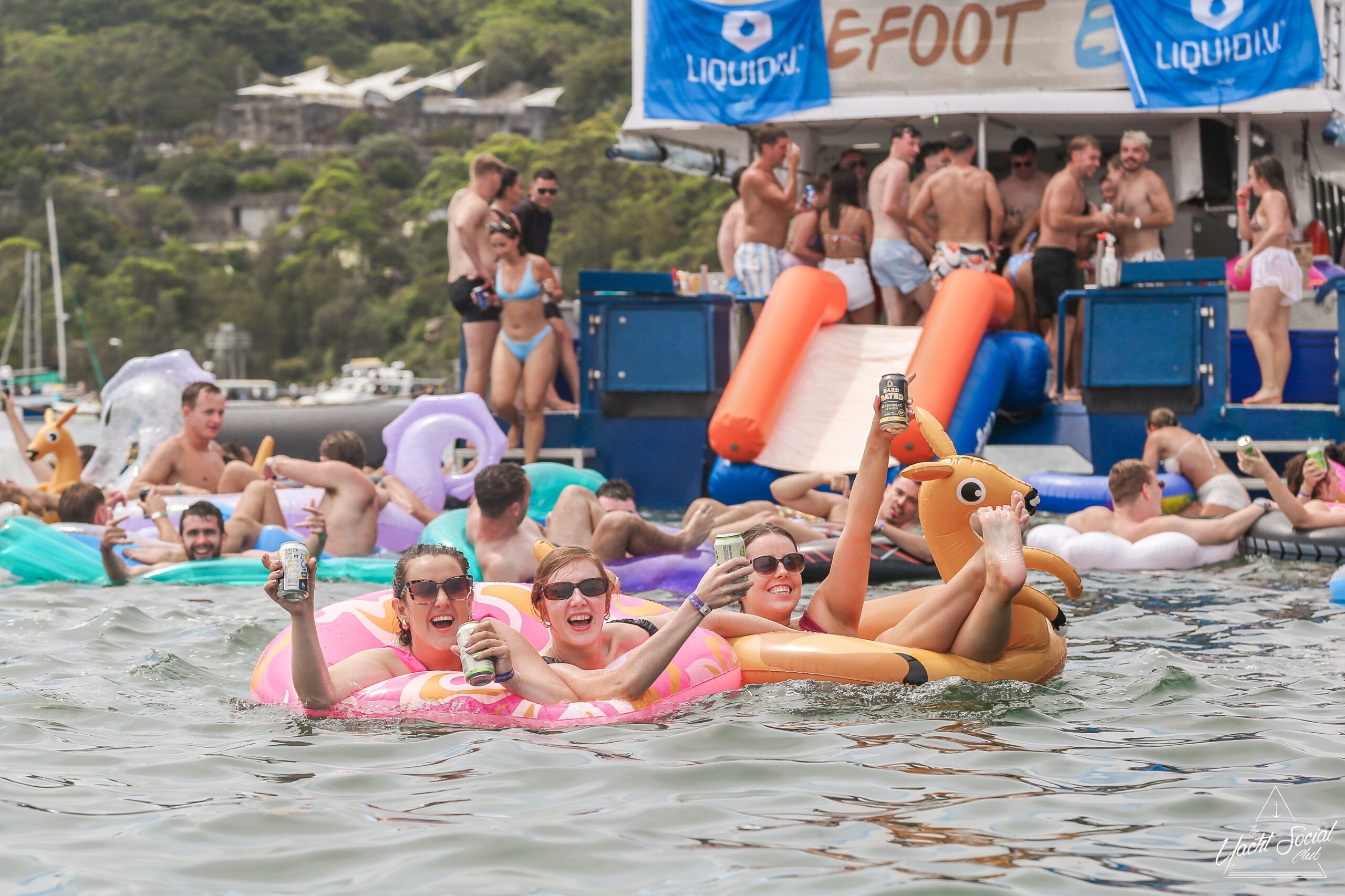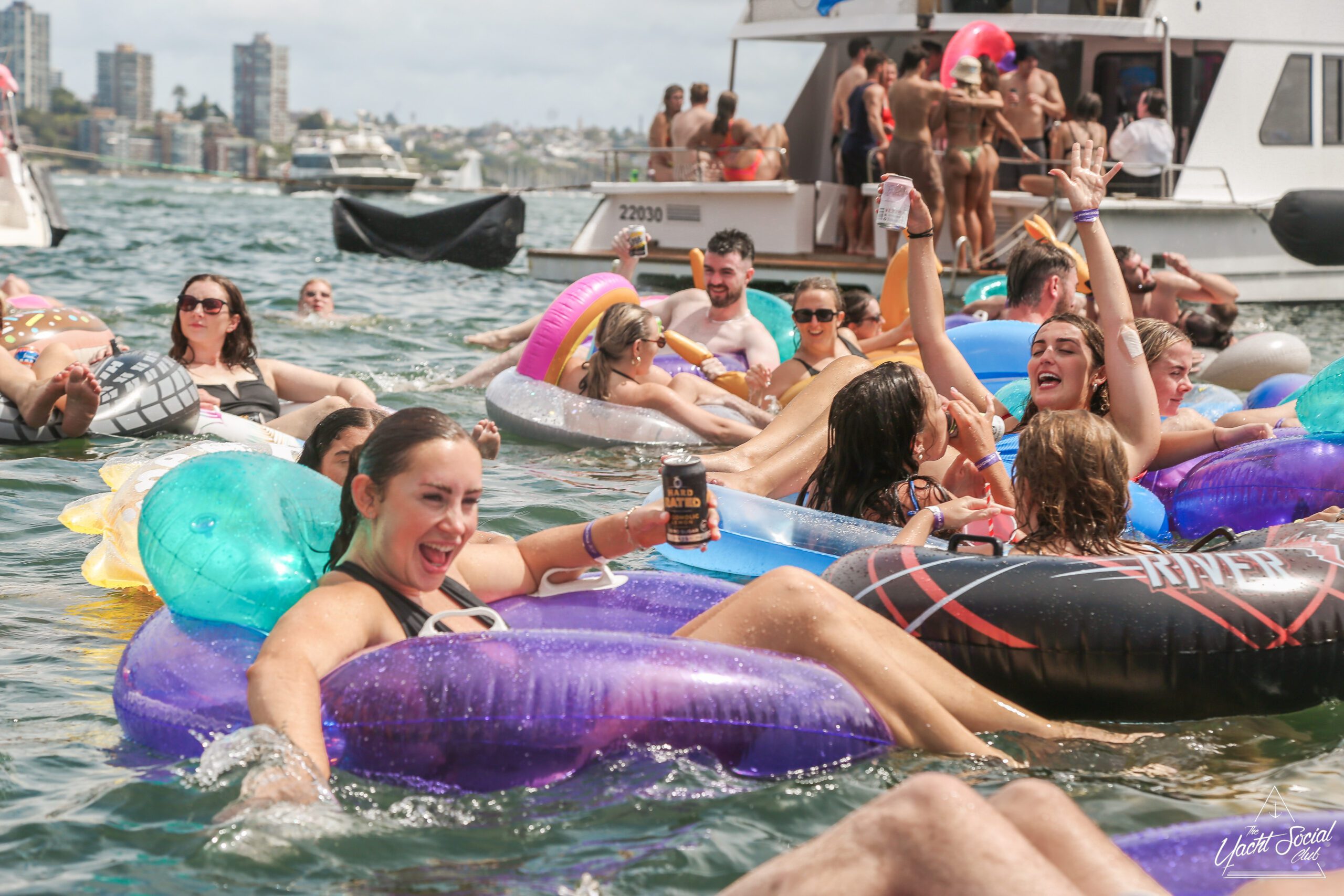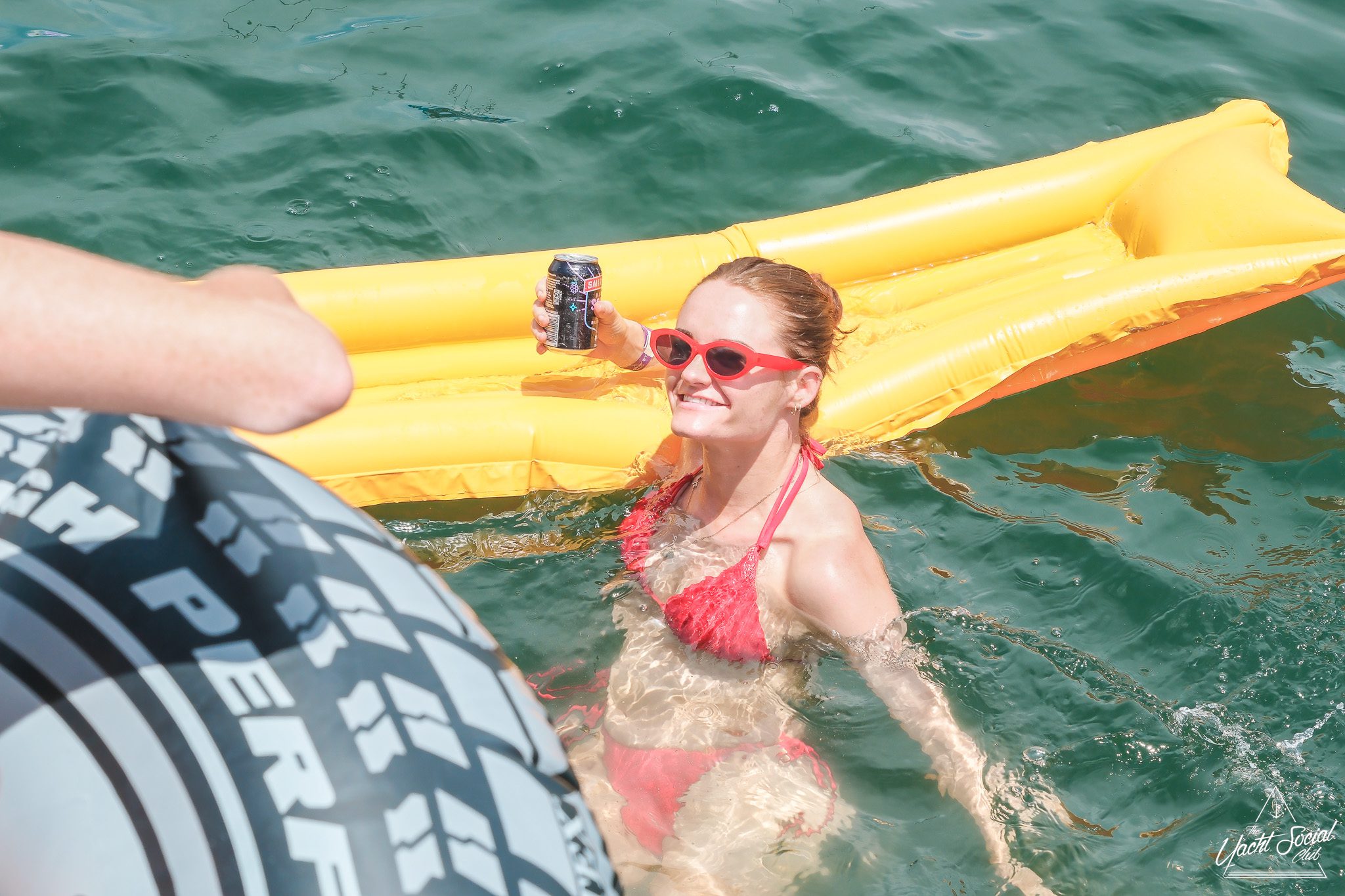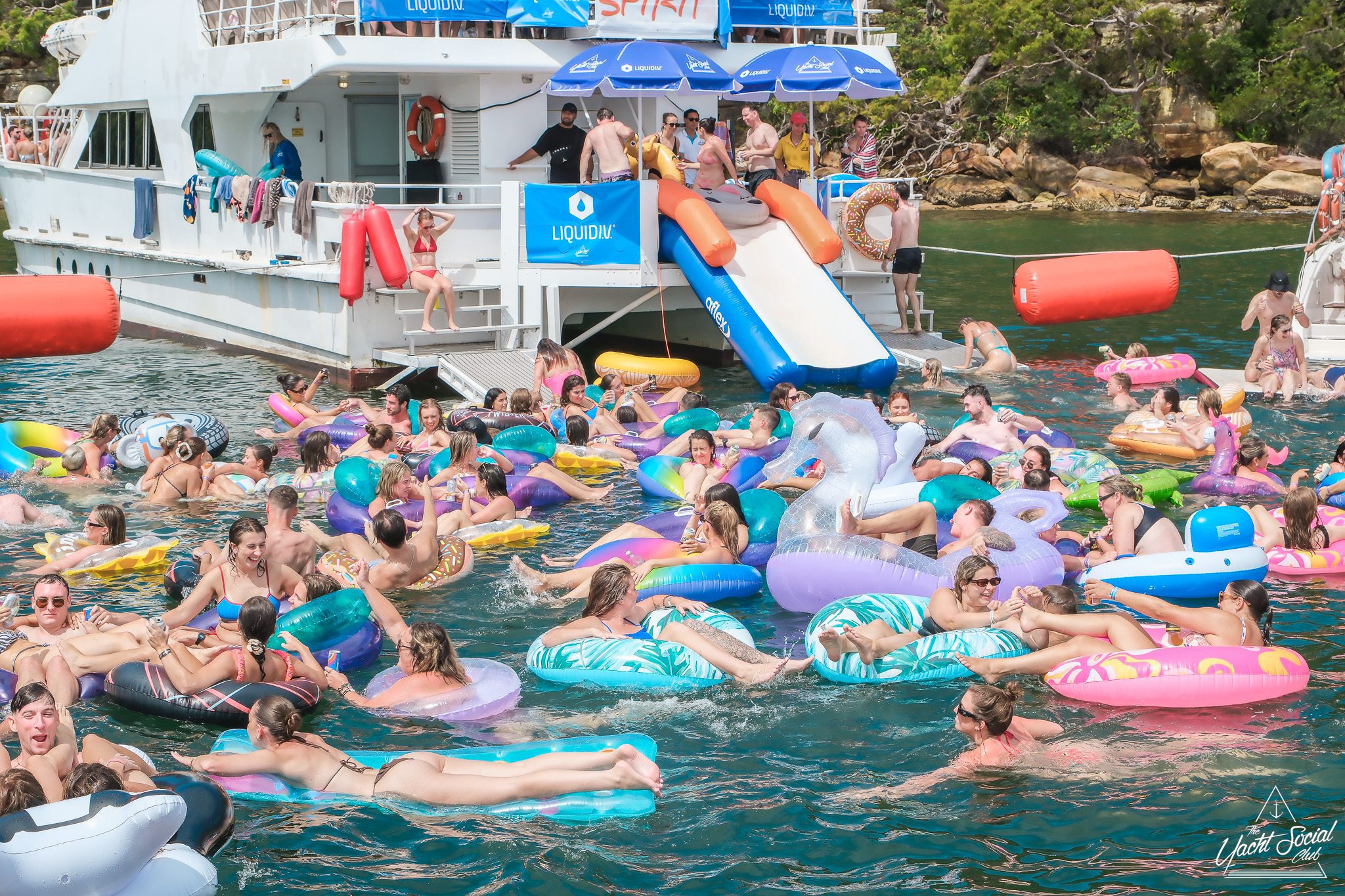 Two people in swimsuits enjoy lounging on inflatable floaties in the water, holding drinks. In the background, a lively crowd is seen on a boat, with more inflatable toys and lively decorations.