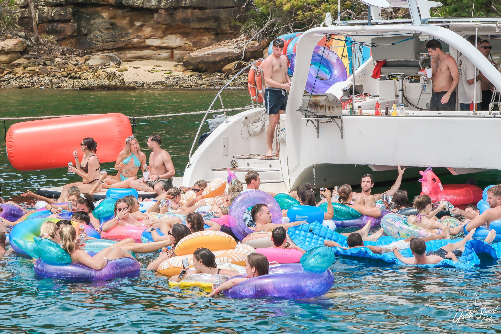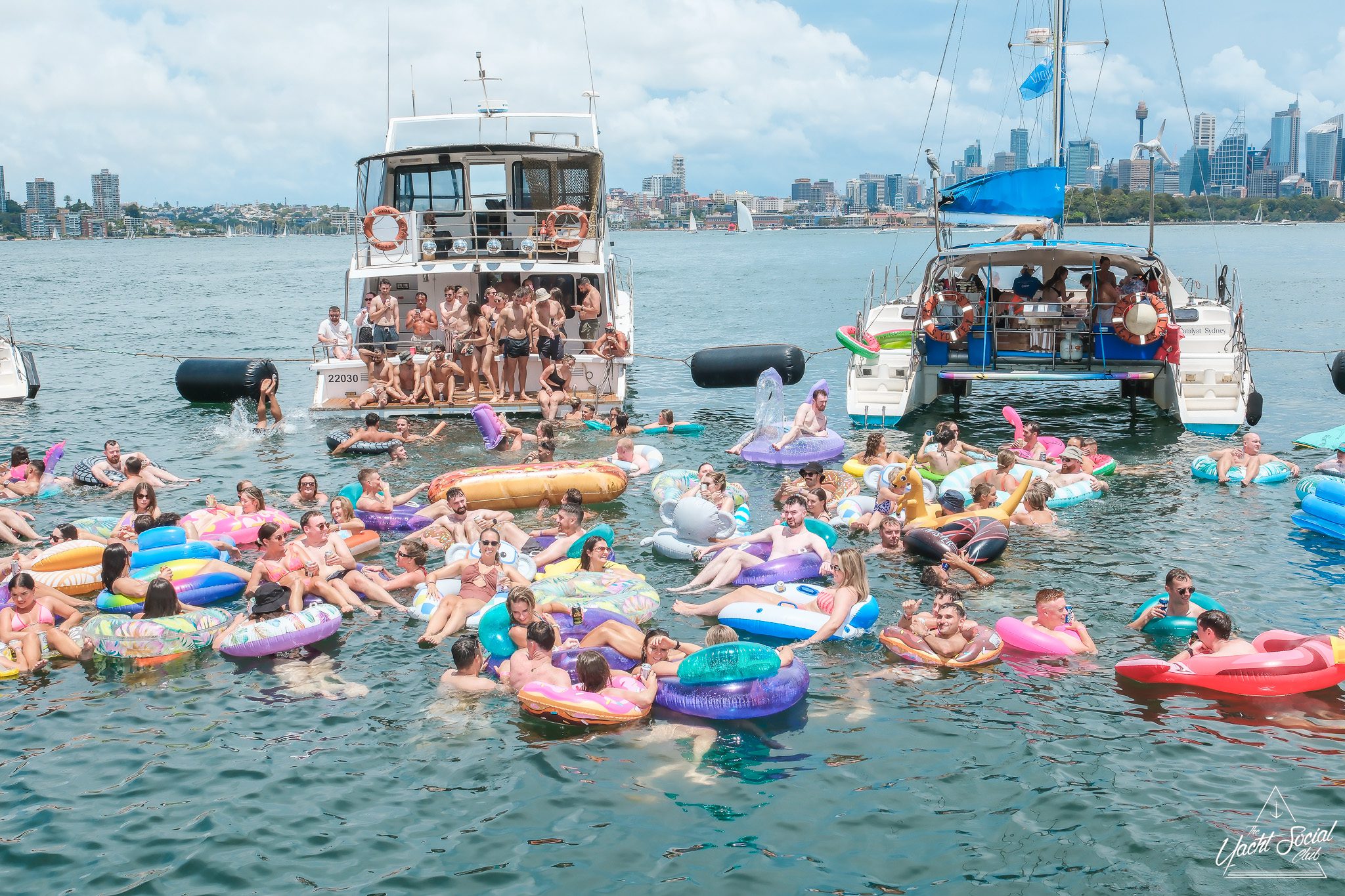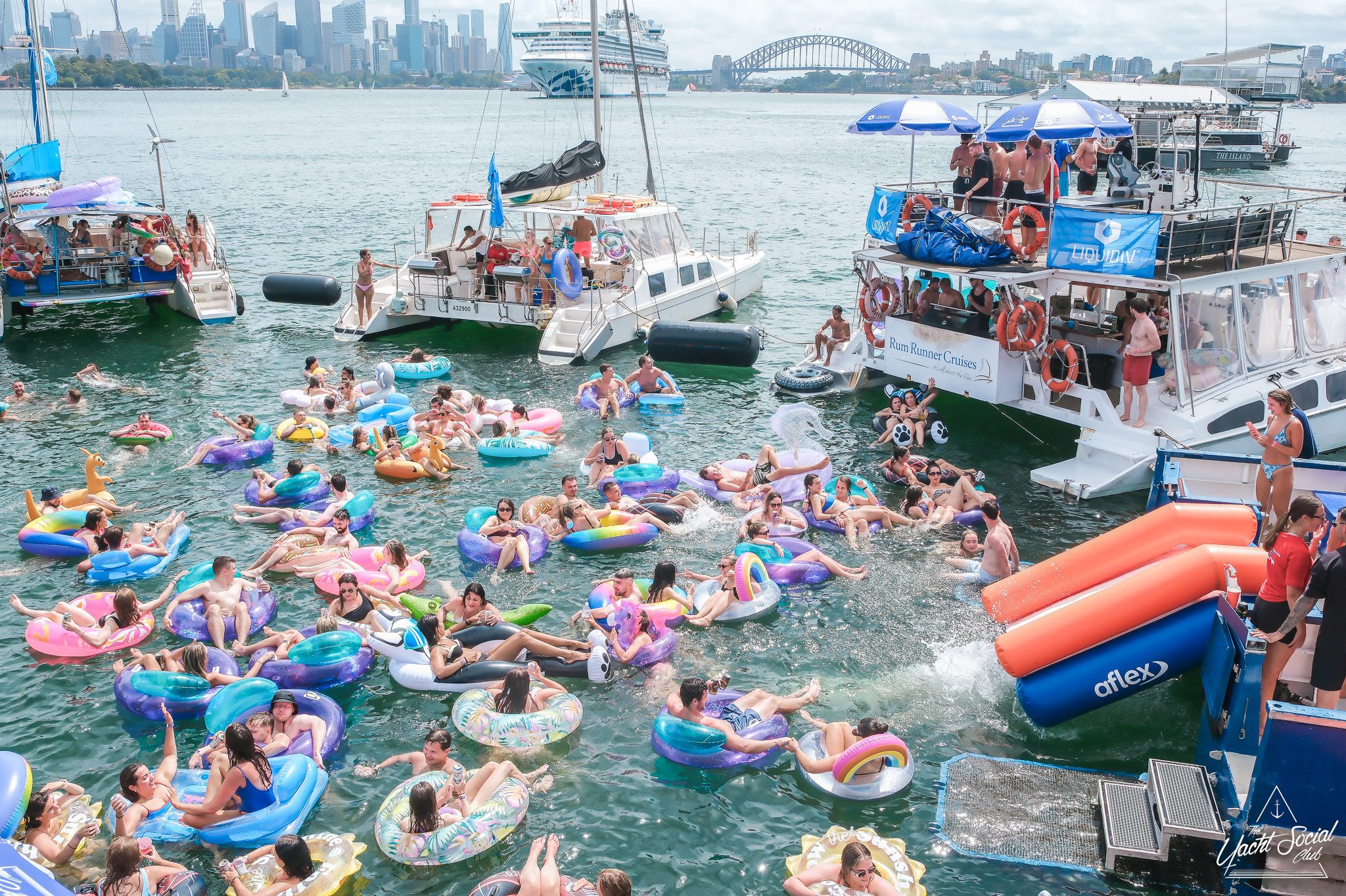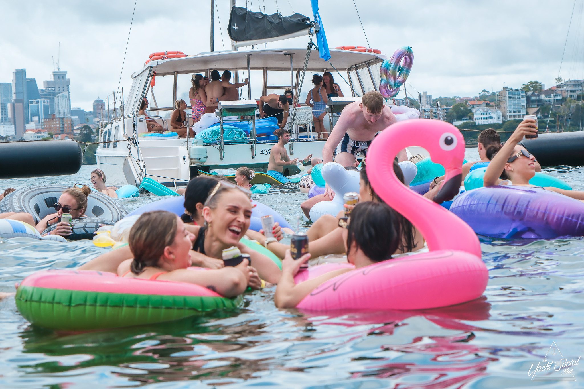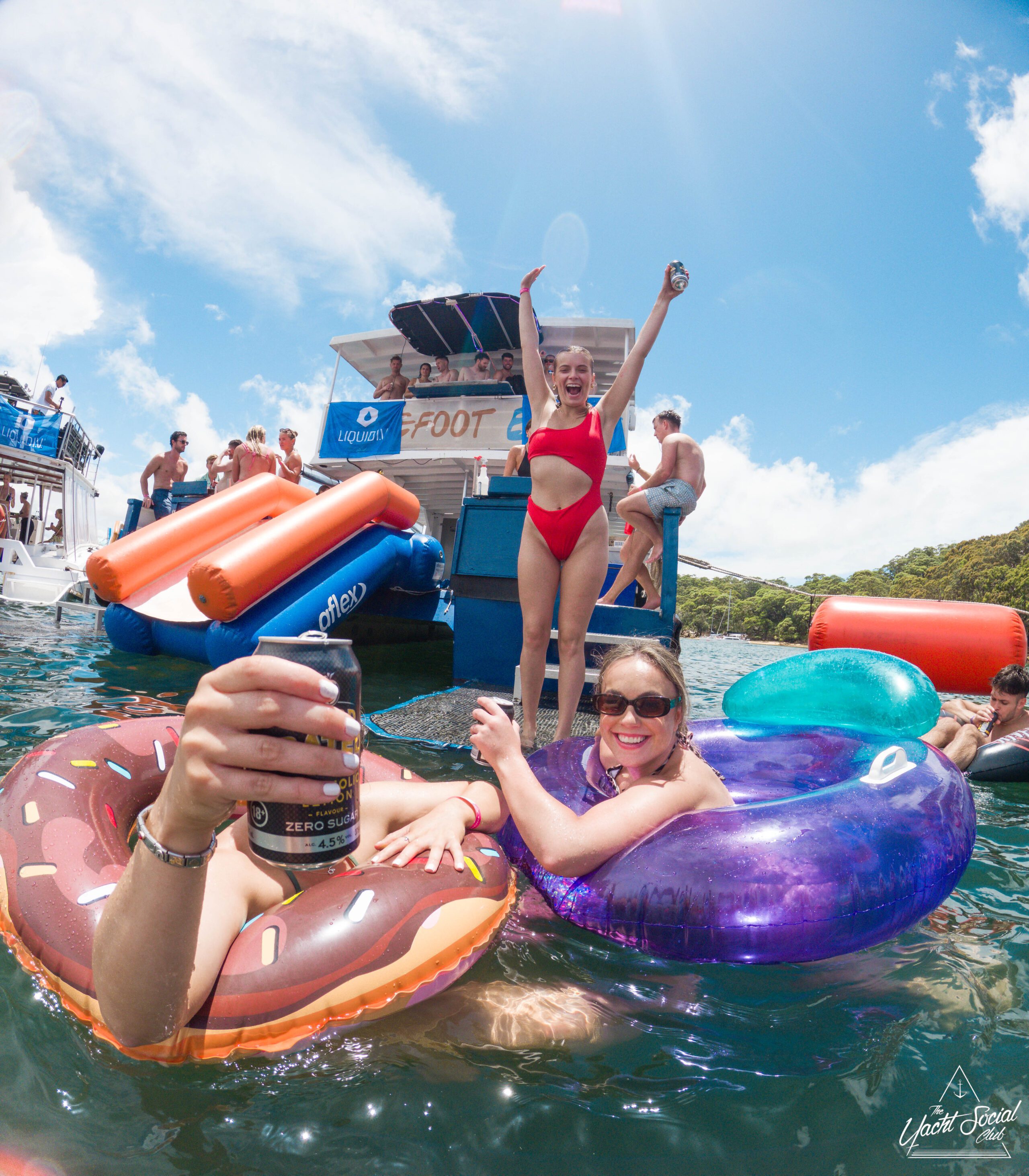 Two people in swimsuits enjoy lounging on inflatable floaties in the water, holding drinks. In the background, a lively crowd is seen on a boat, with more inflatable toys and lively decorations.