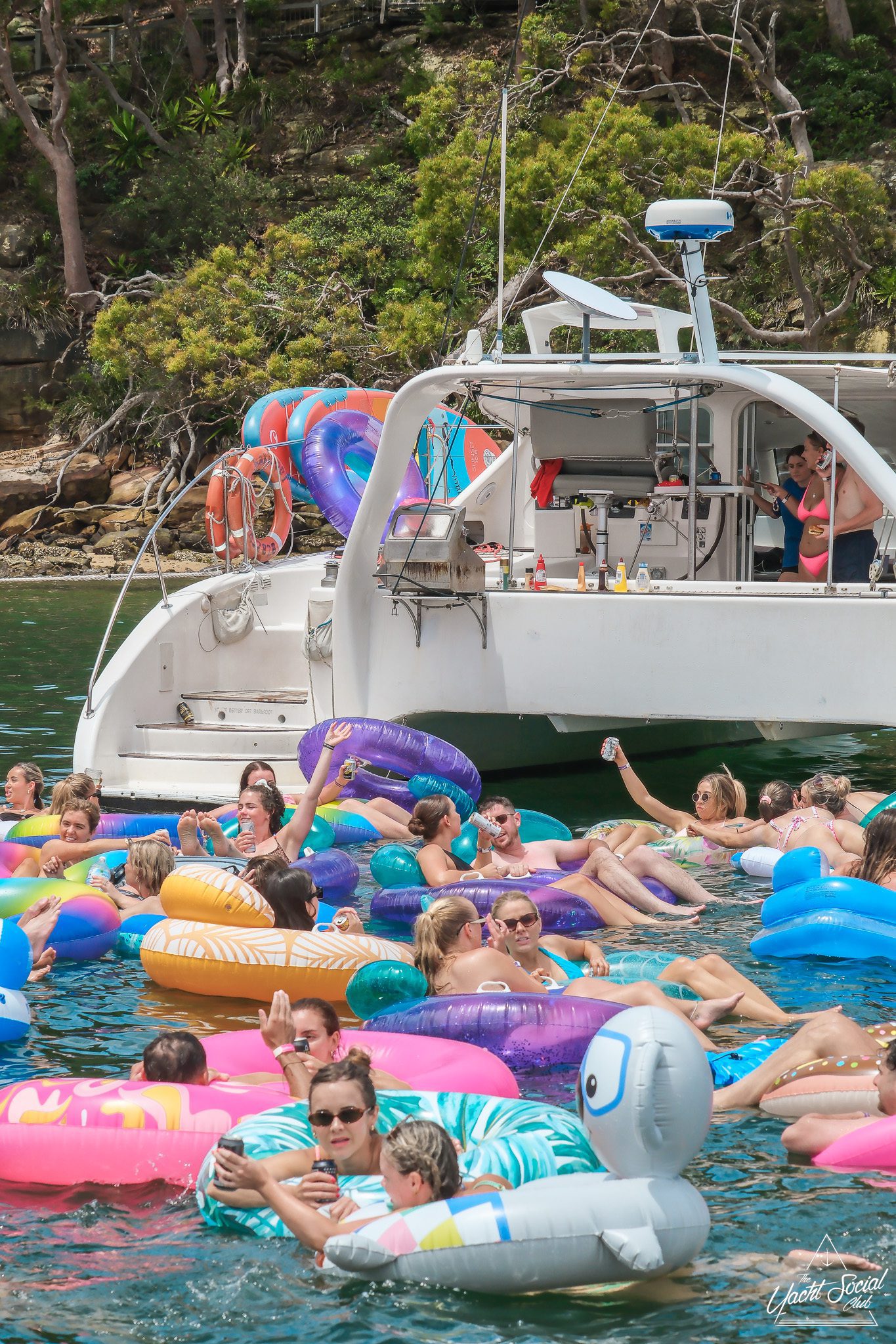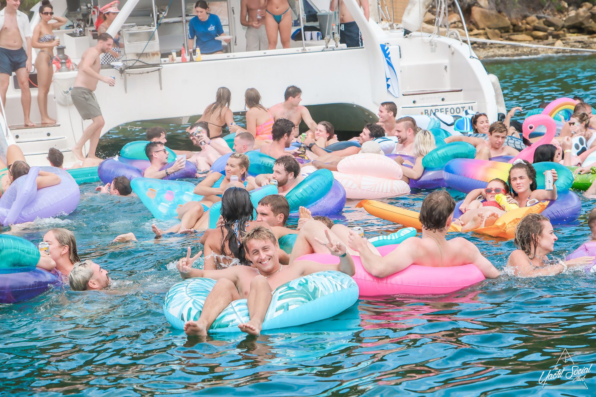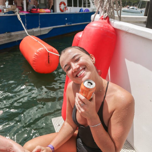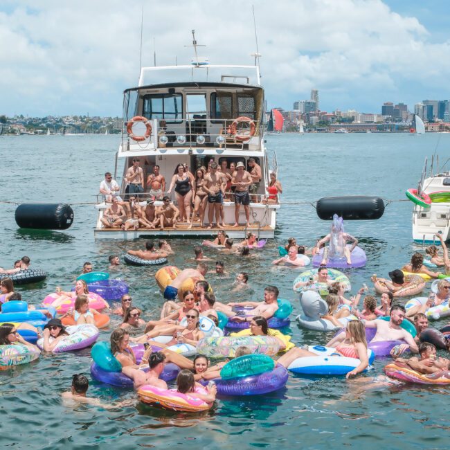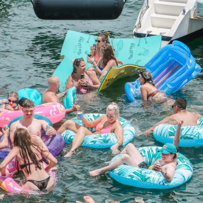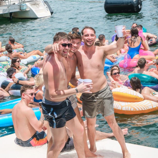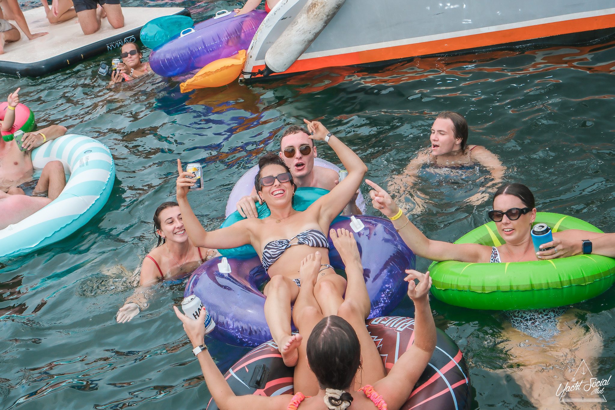 A group of people enjoying a sunny day on a boat, holding drinks and wearing swimwear. Some people are floating on inflatable rings, and everyone appears to be smiling and having fun near the water.