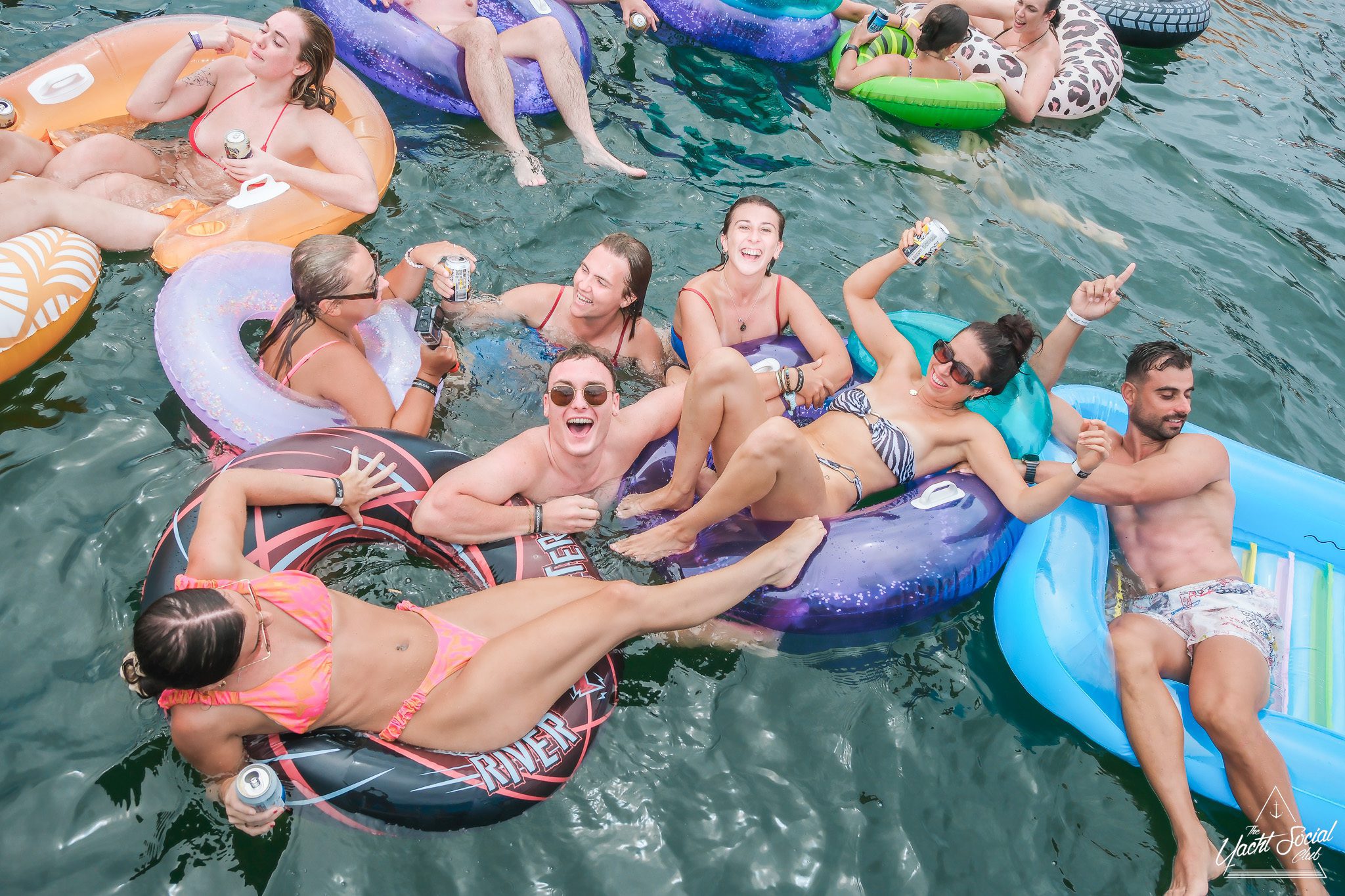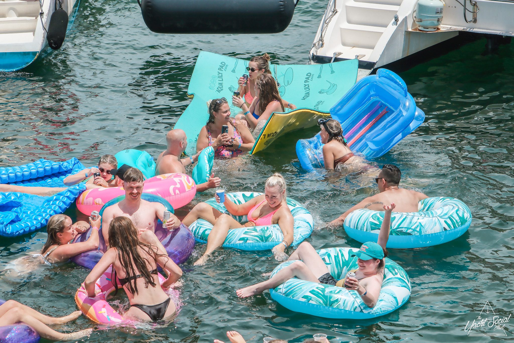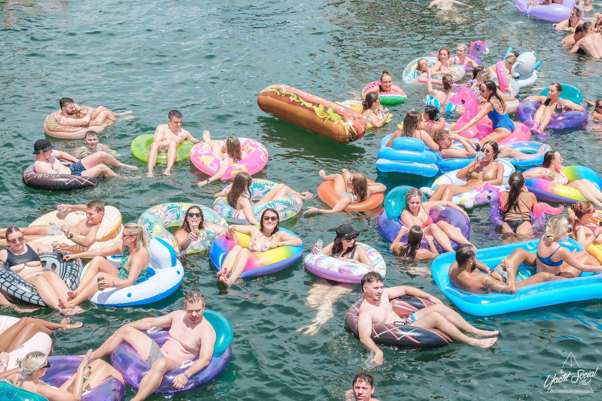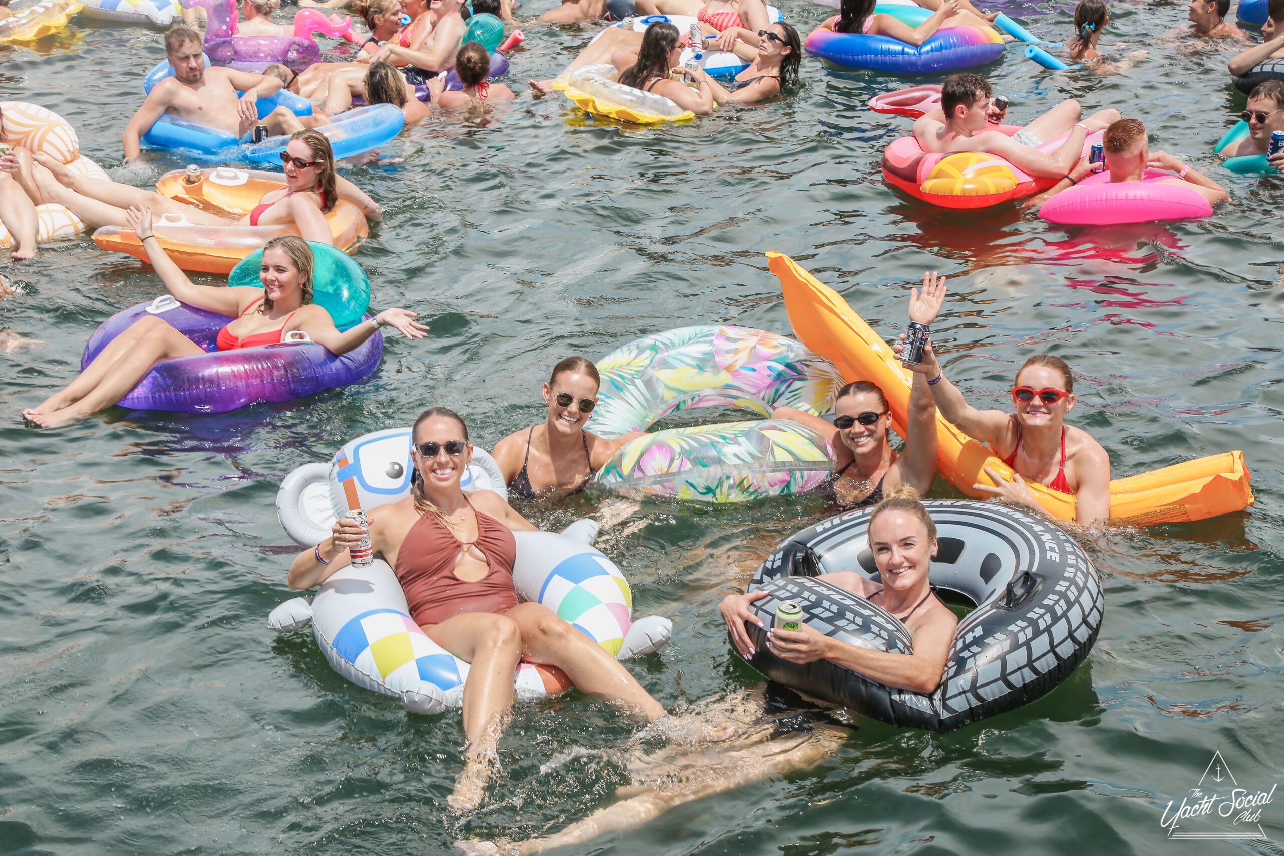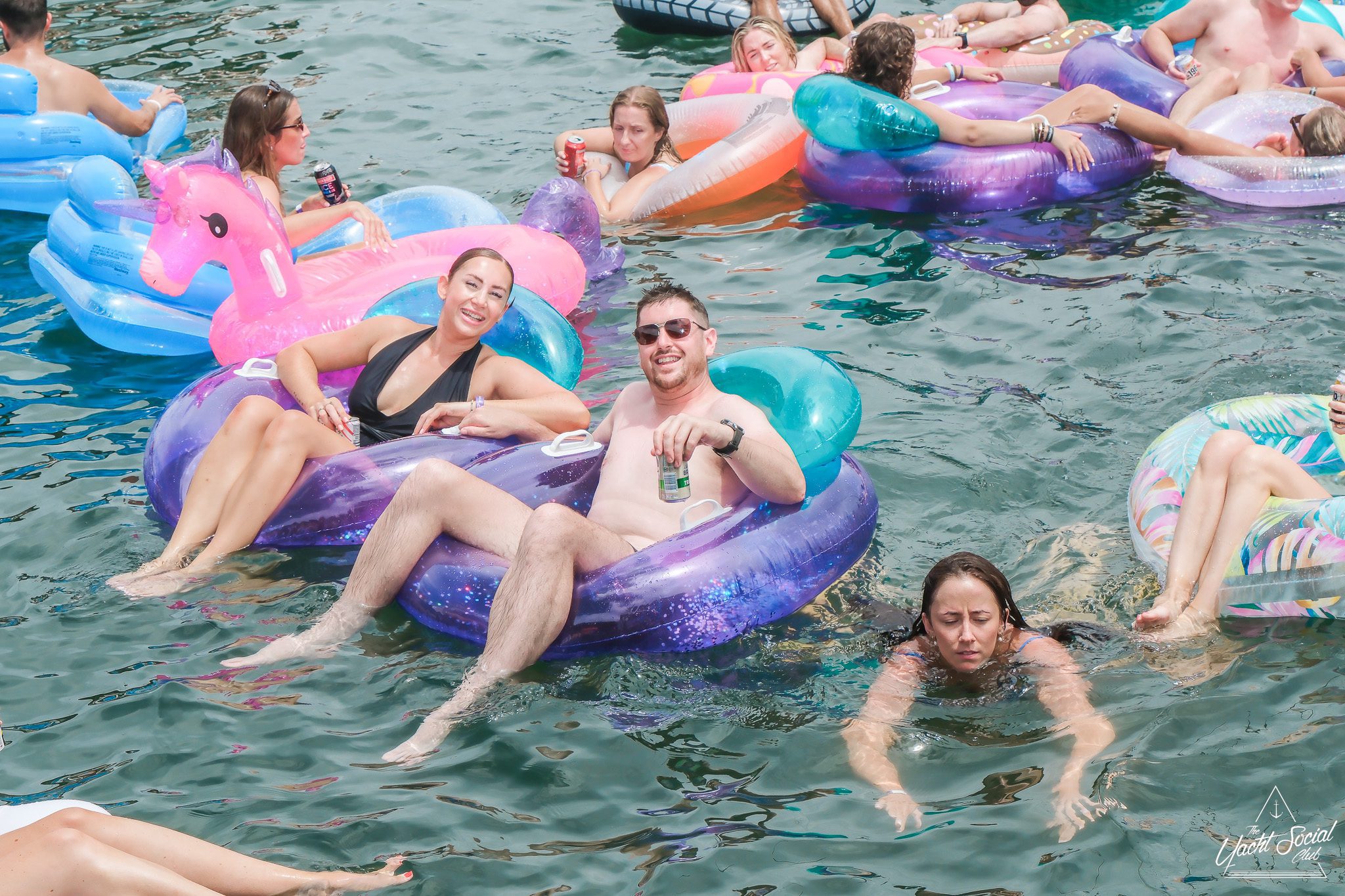 Two people in swimwear smile at the camera, holding drinks, with a lively boat party in the background. Numerous people are floating on colorful inflatables in the water, and boats are docked nearby under a partly cloudy sky.