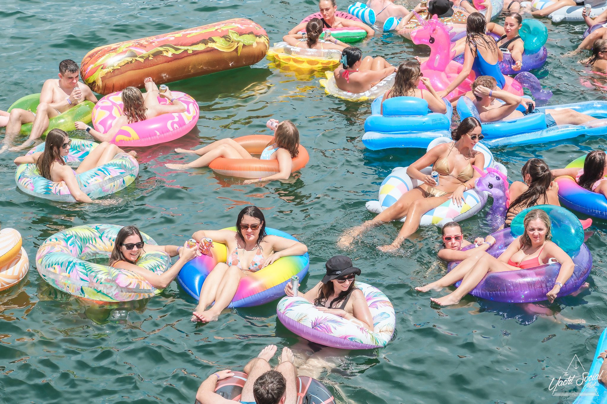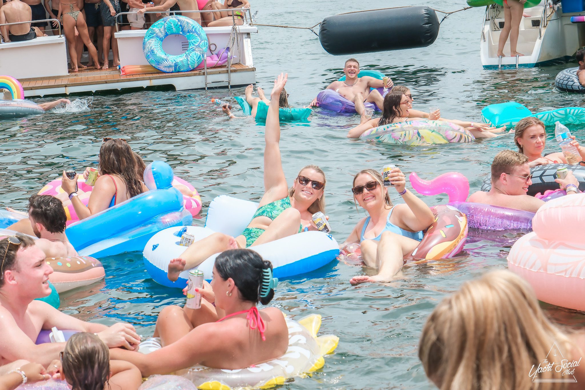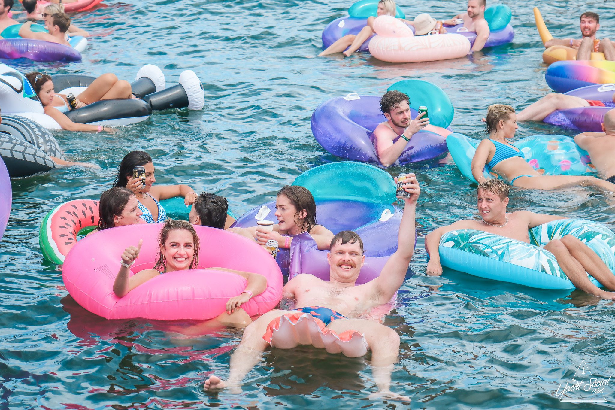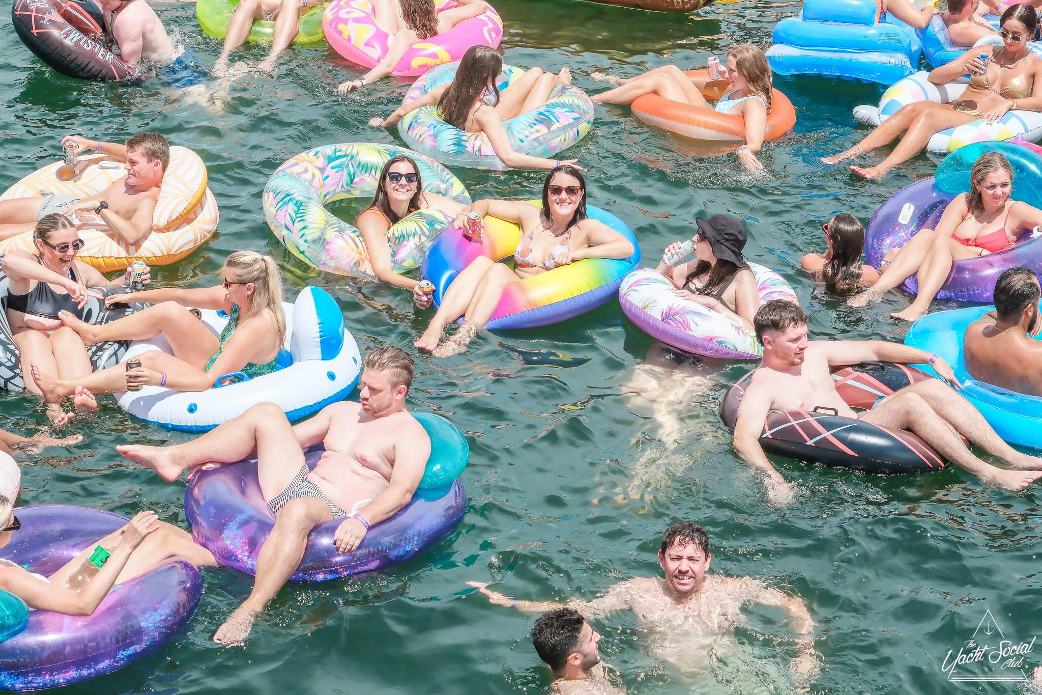 Two people in swimwear smile at the camera, holding drinks, with a lively boat party in the background. Numerous people are floating on colorful inflatables in the water, and boats are docked nearby under a partly cloudy sky.