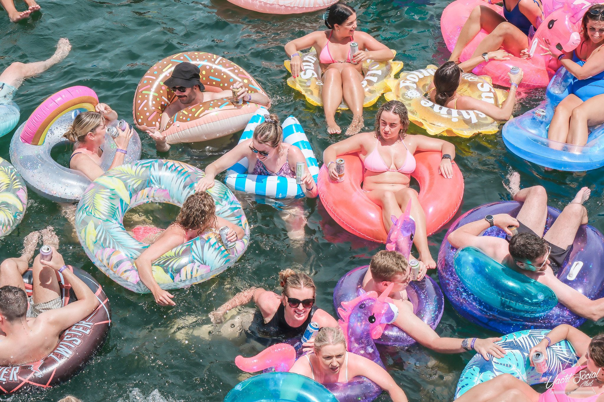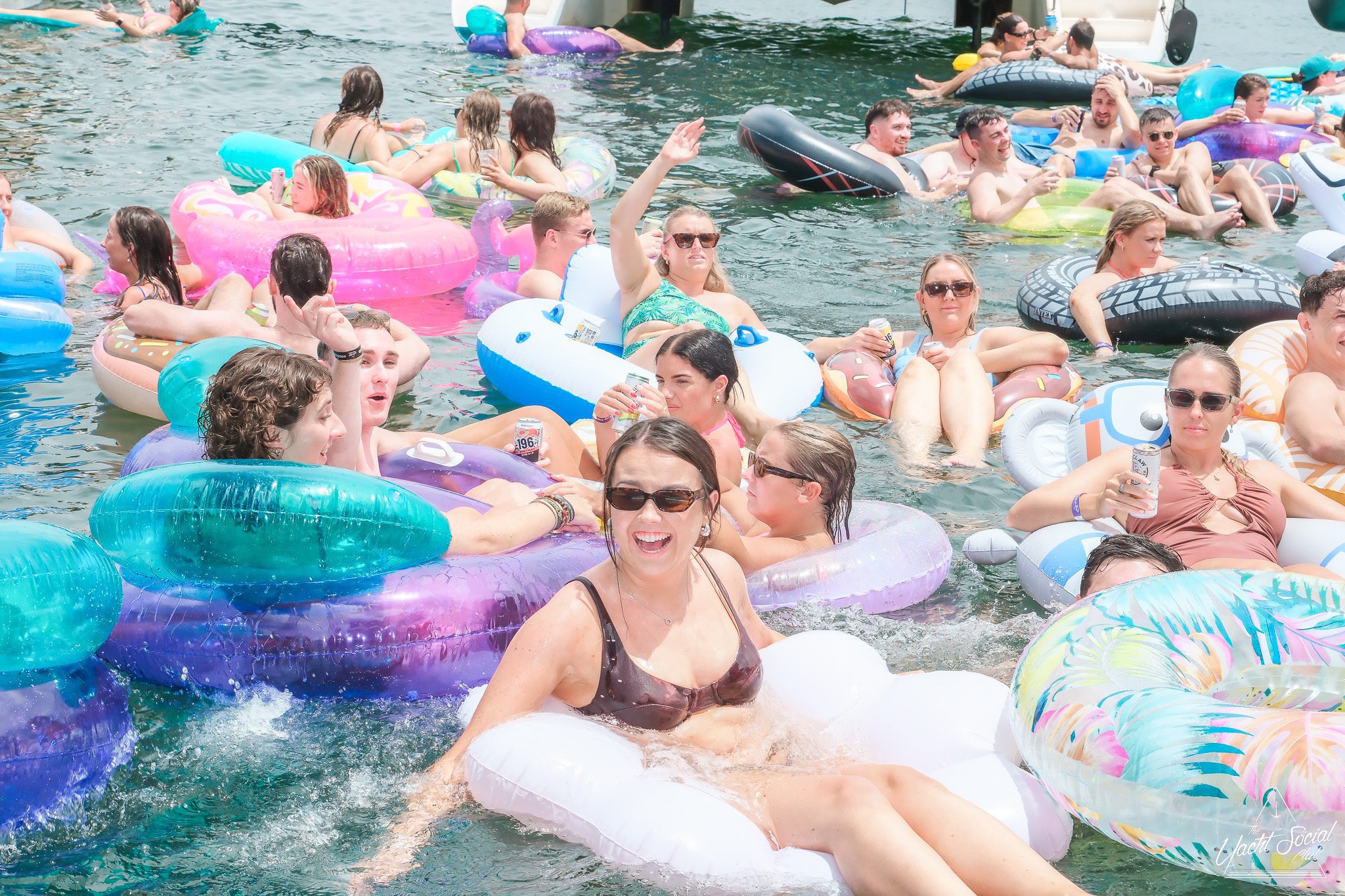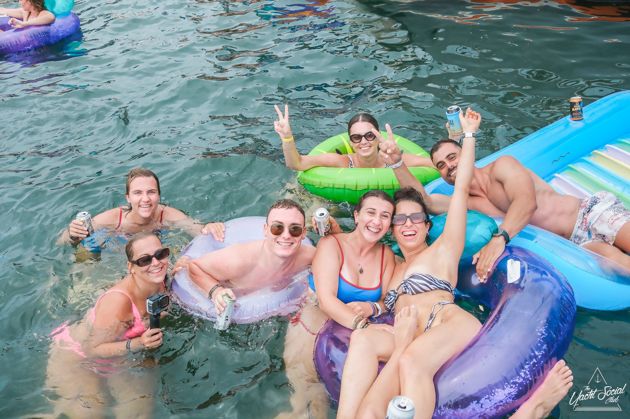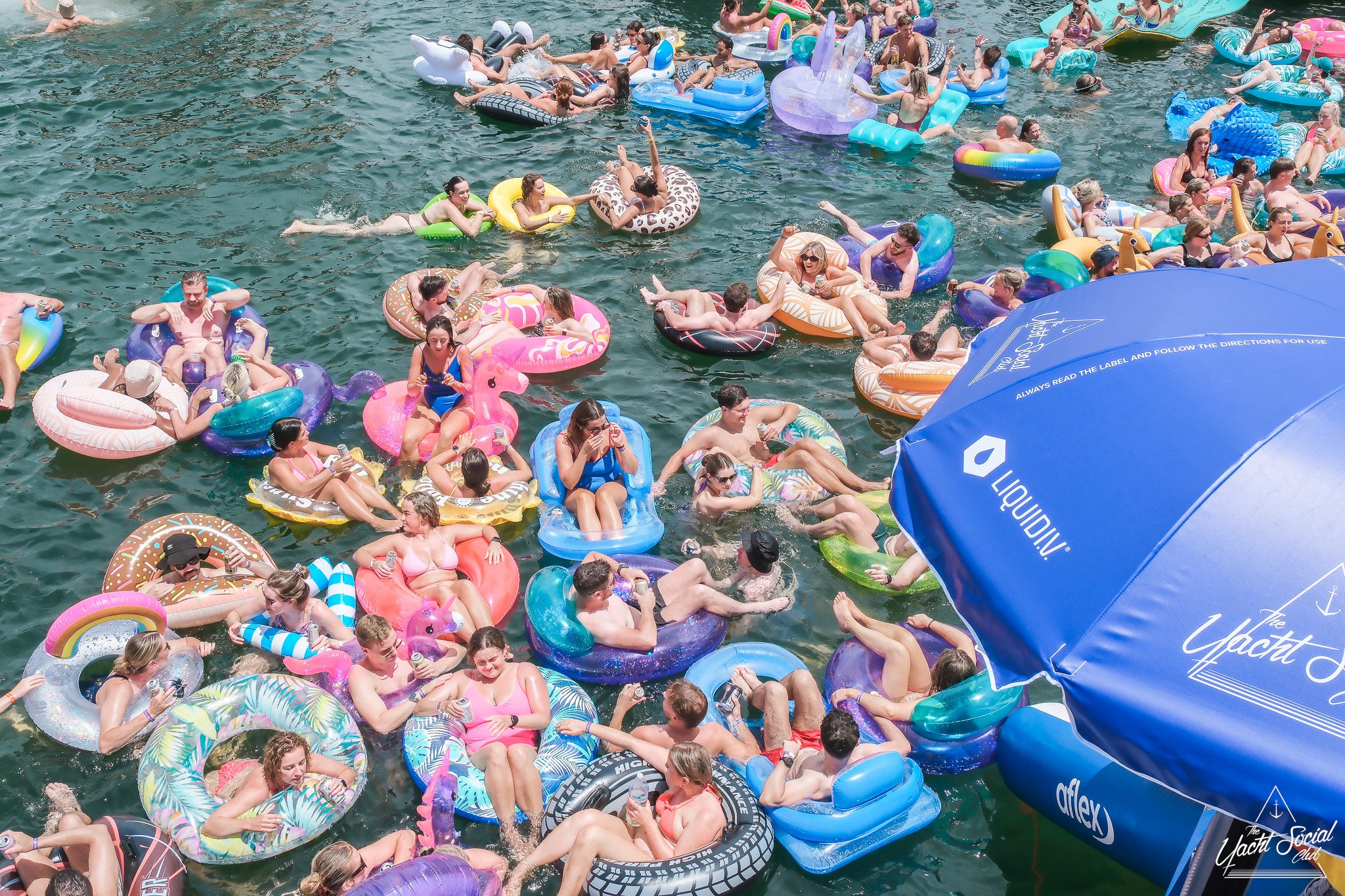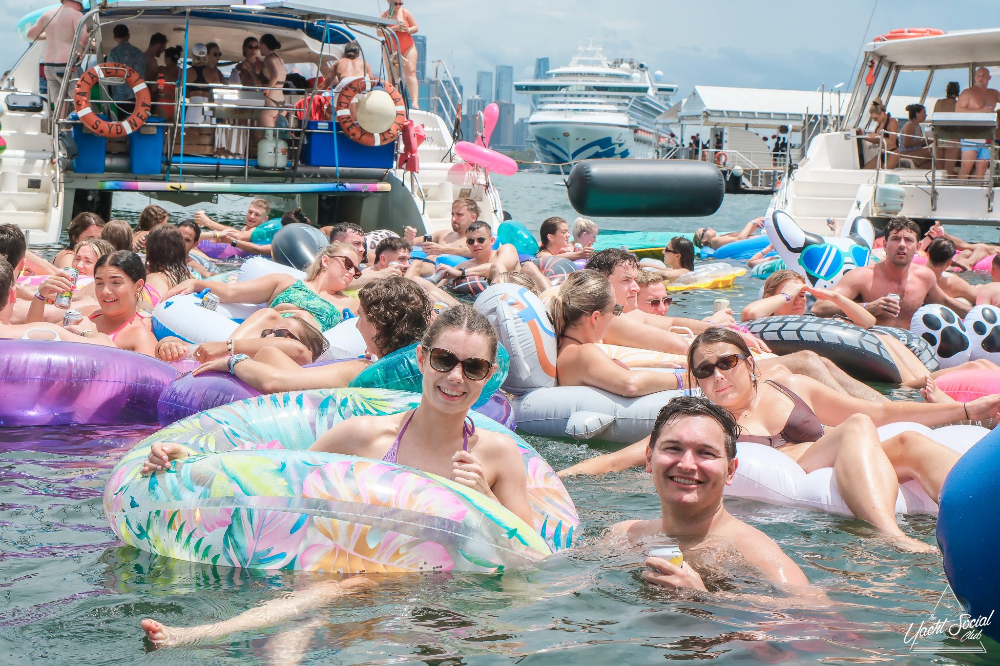 Two people in swimwear smile at the camera, holding drinks, with a lively boat party in the background. Numerous people are floating on colorful inflatables in the water, and boats are docked nearby under a partly cloudy sky.