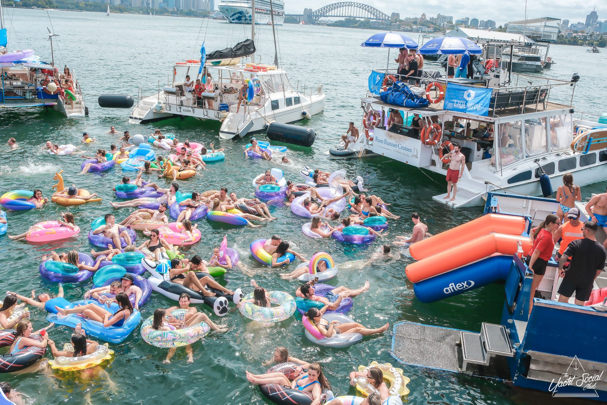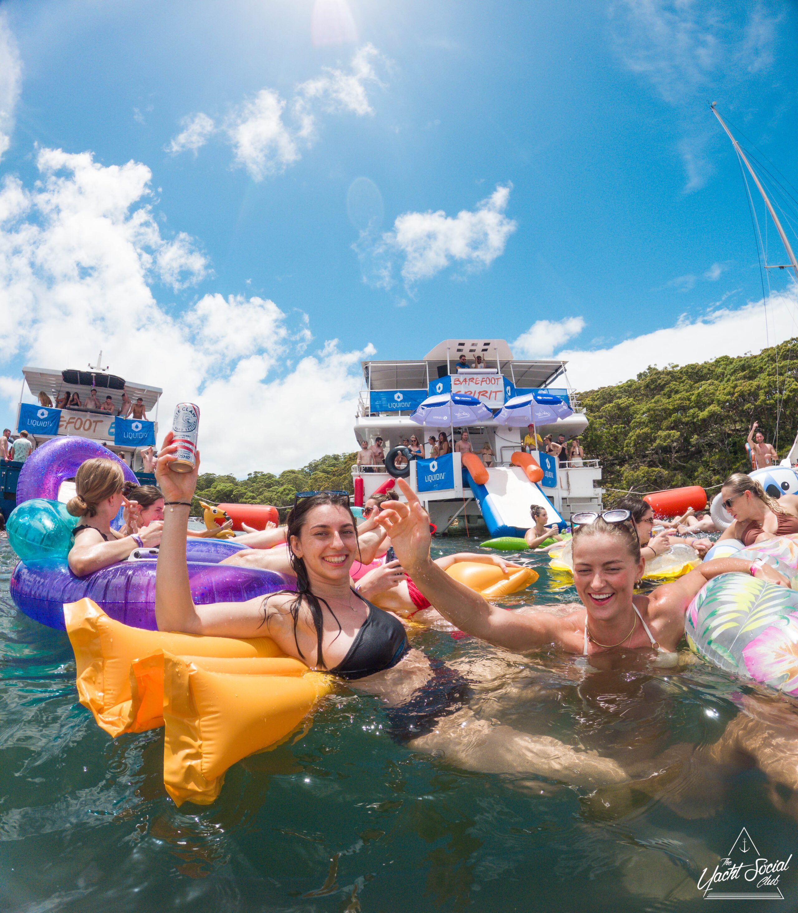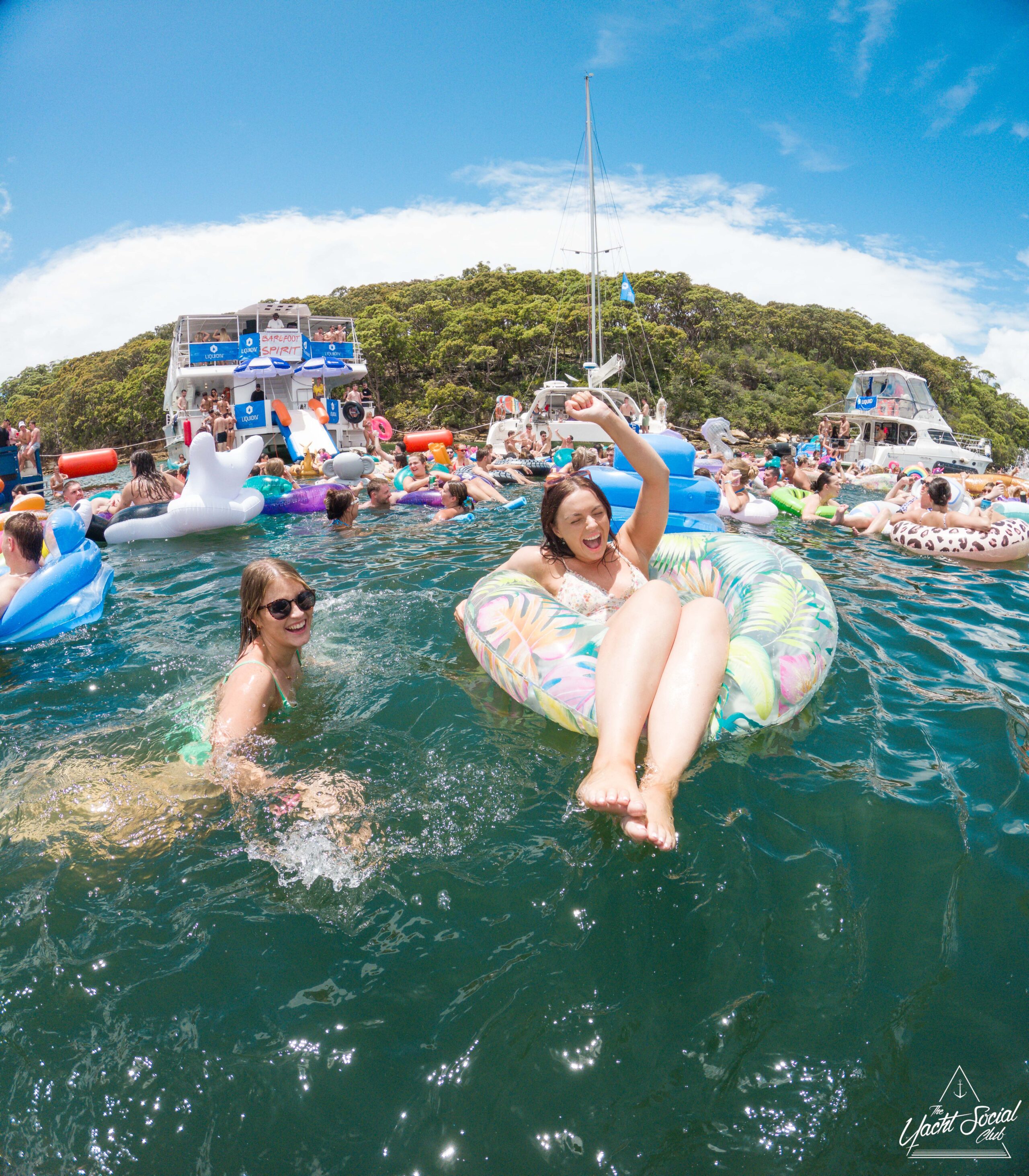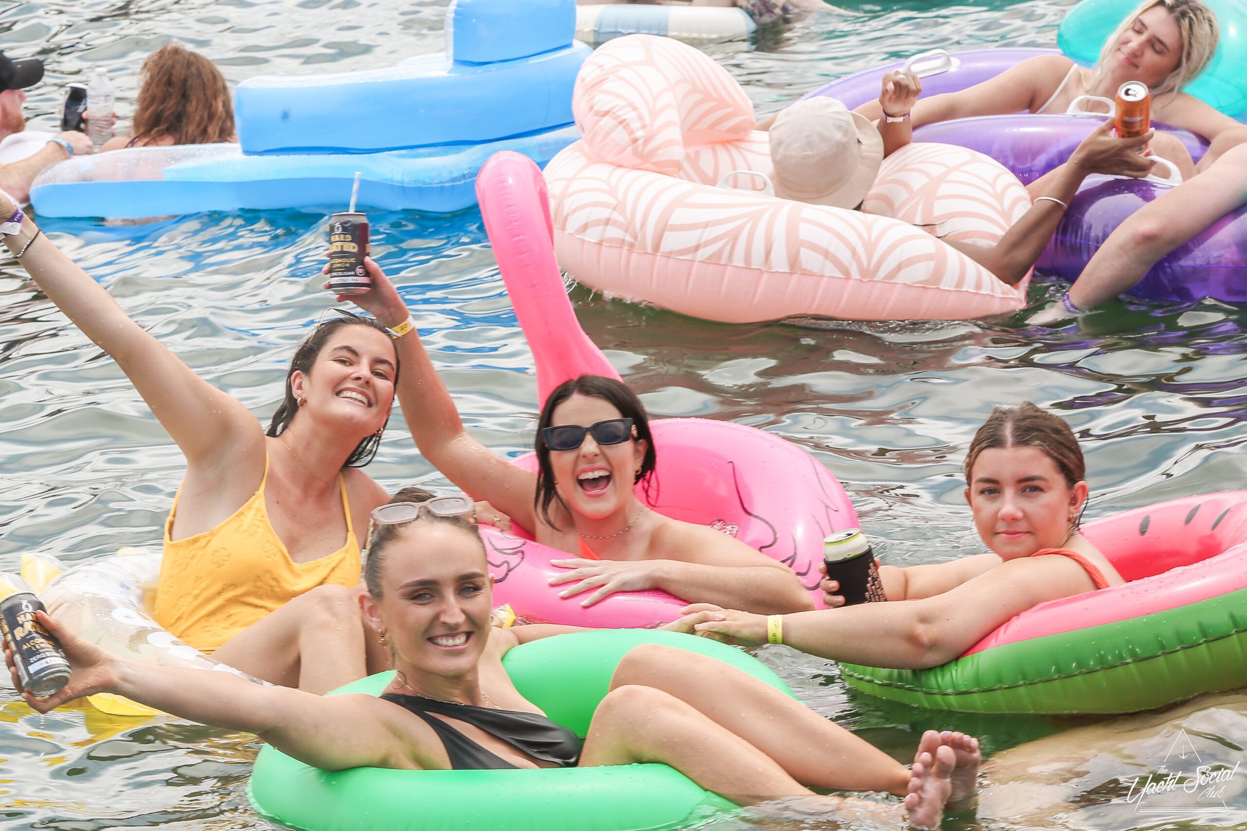 Two people in swimwear smile at the camera, holding drinks, with a lively boat party in the background. Numerous people are floating on colorful inflatables in the water, and boats are docked nearby under a partly cloudy sky.