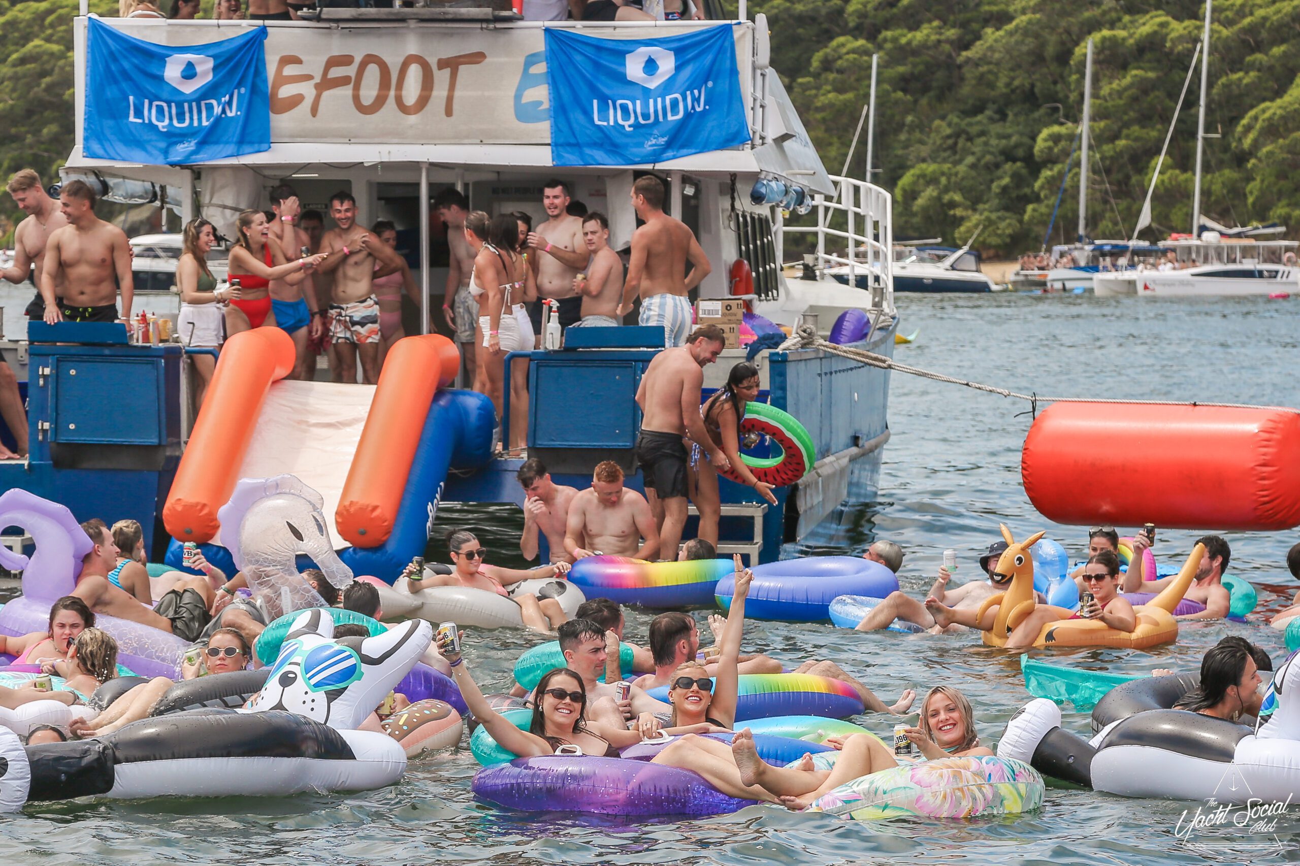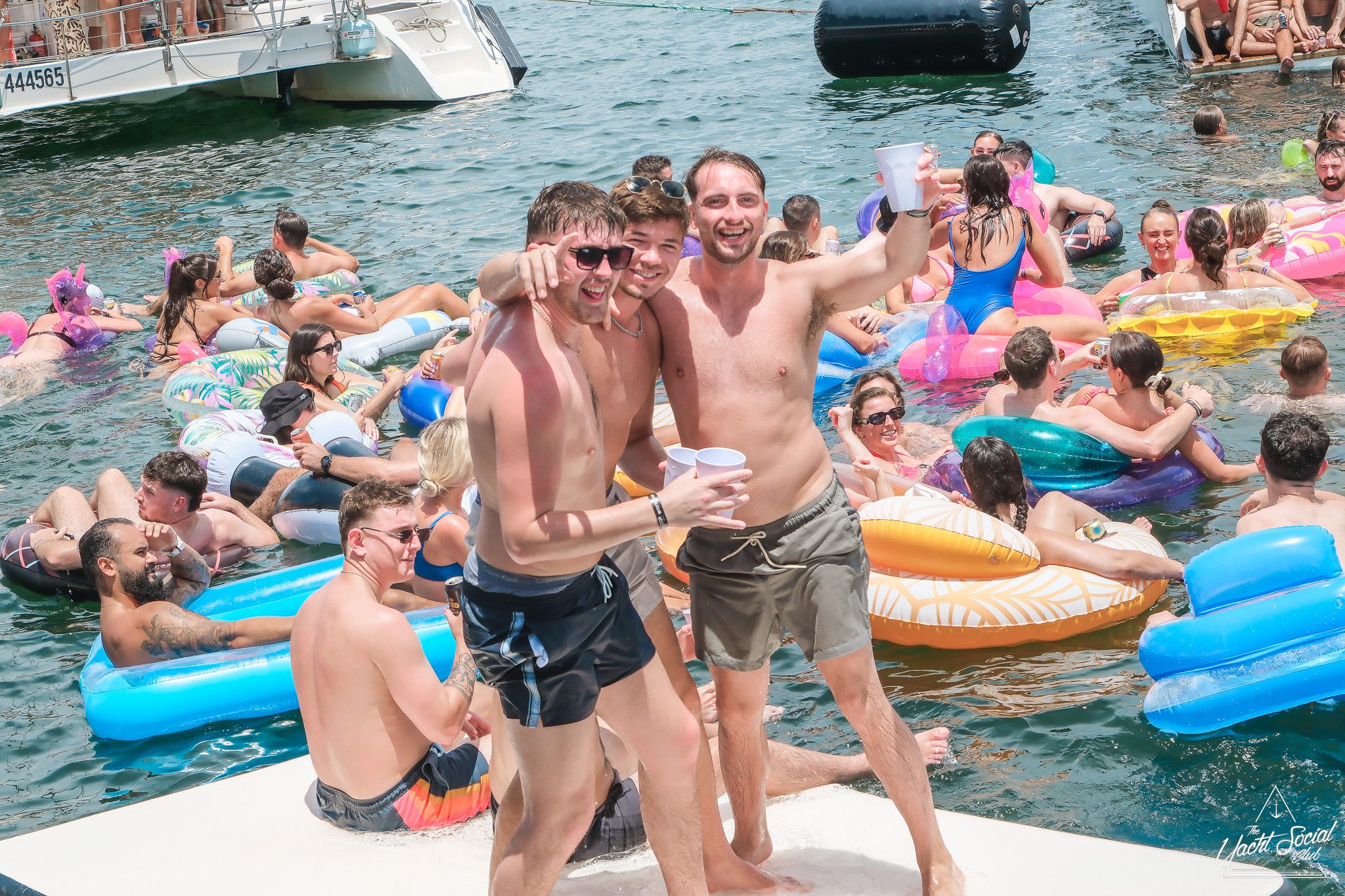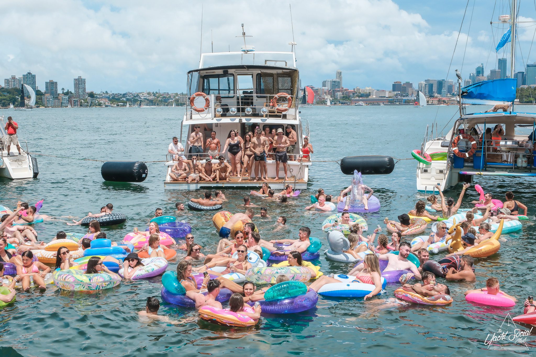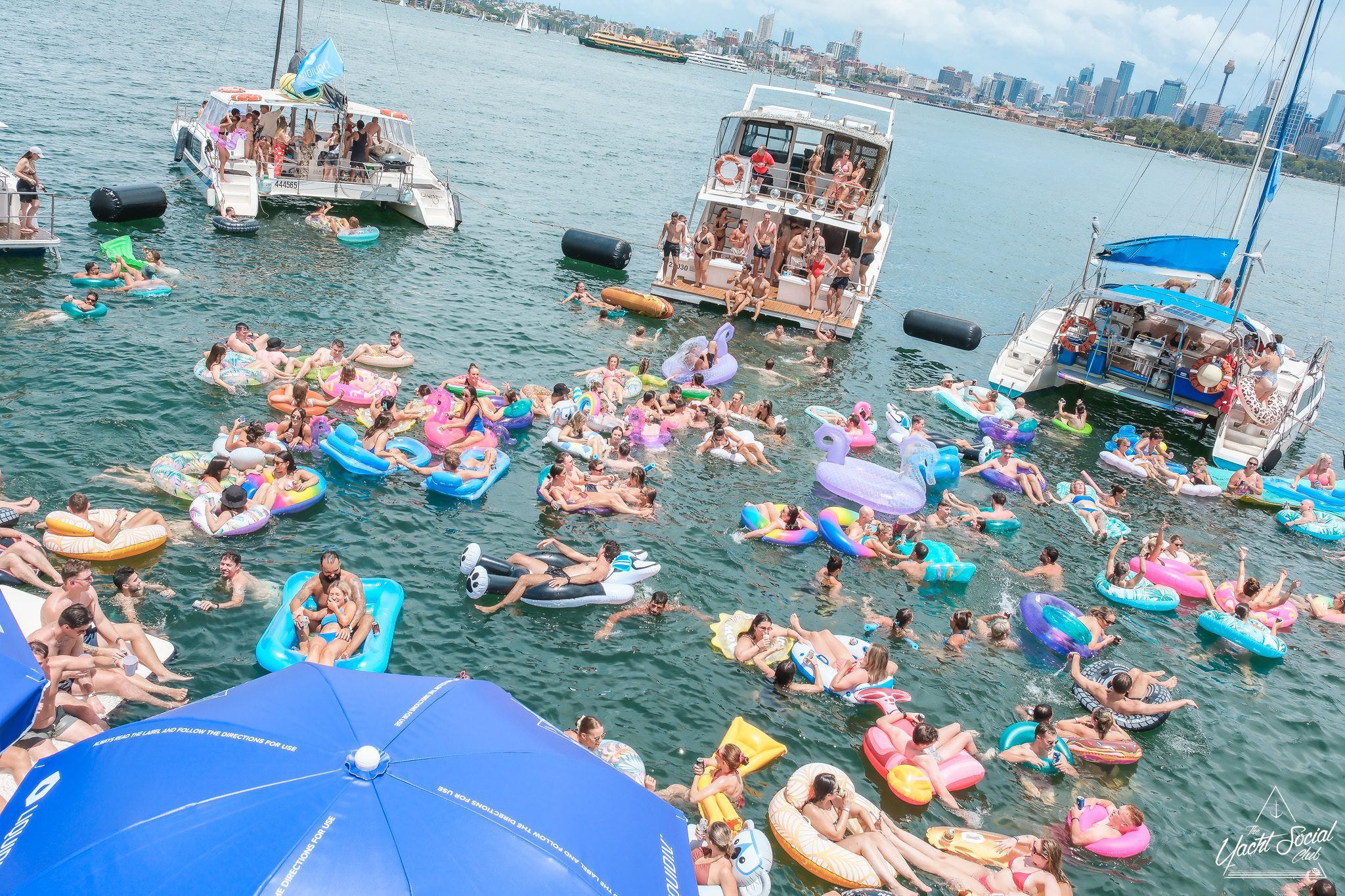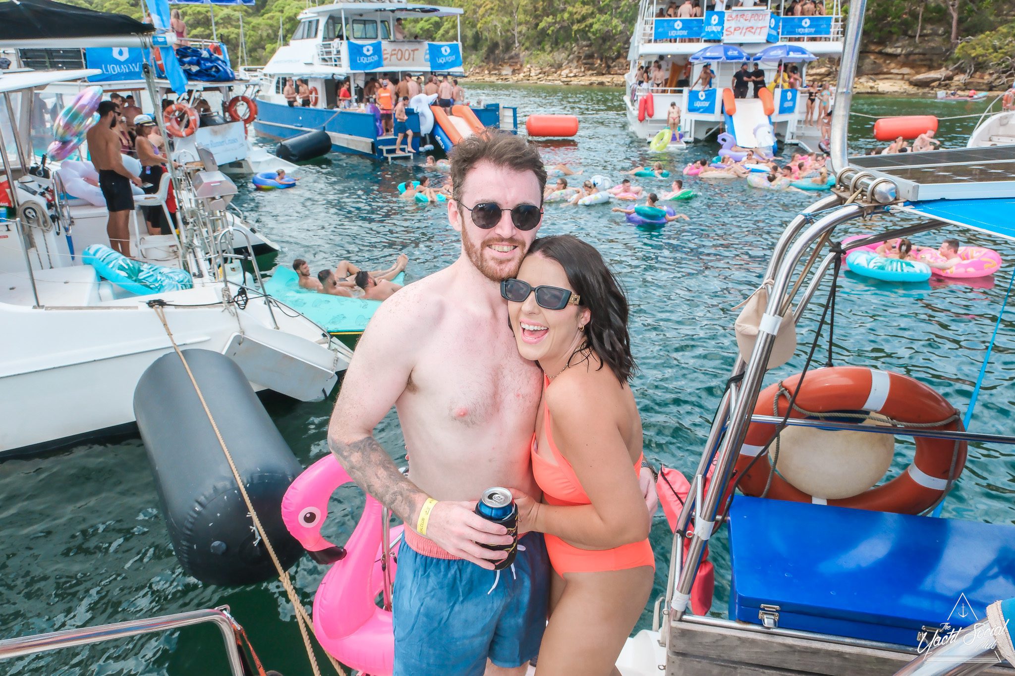 Two people in swimwear smile at the camera, holding drinks, with a lively boat party in the background. Numerous people are floating on colorful inflatables in the water, and boats are docked nearby under a partly cloudy sky.