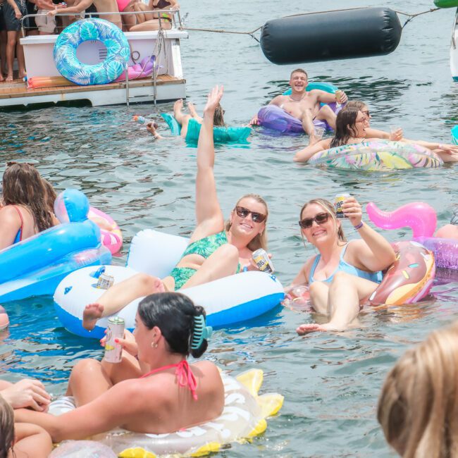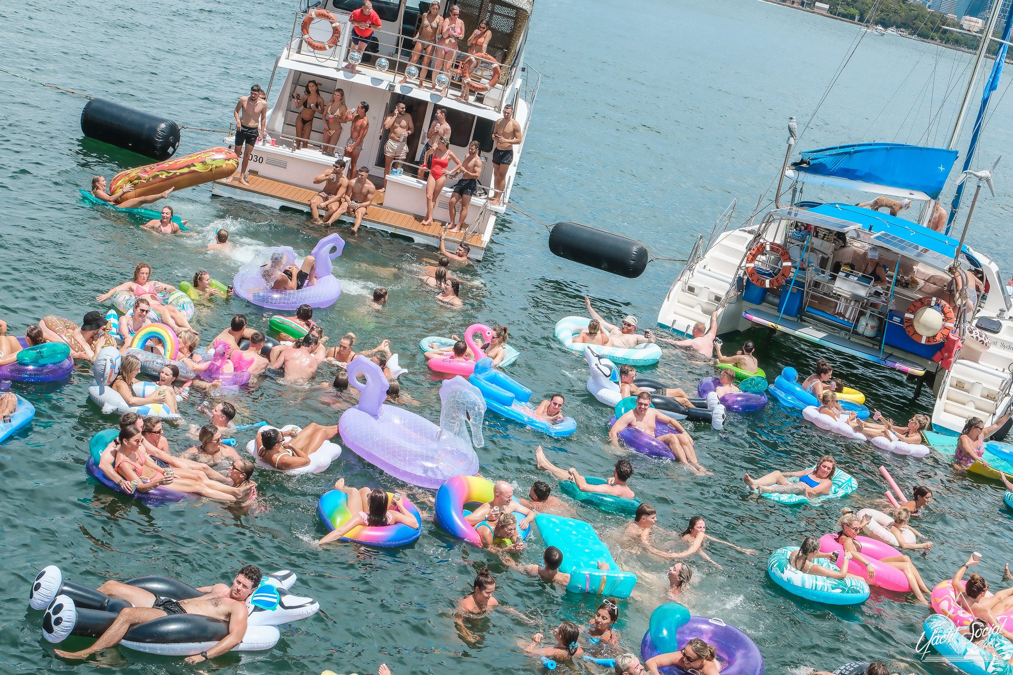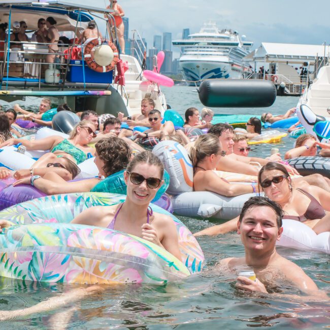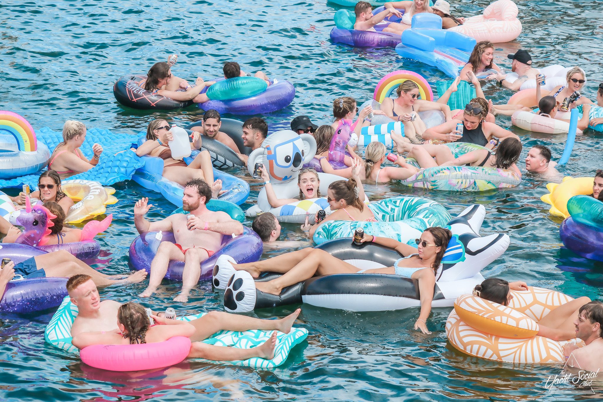 Two people in swimsuits enjoying a party on inflatable floats in the water. They are holding hands and drinks, surrounded by other partygoers and boats. It’s a sunny day with blue skies and fluffy clouds.