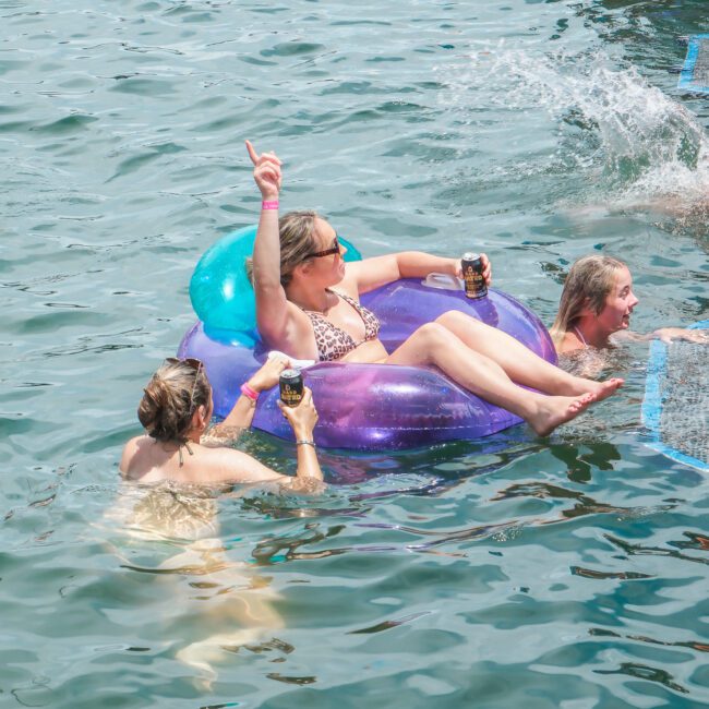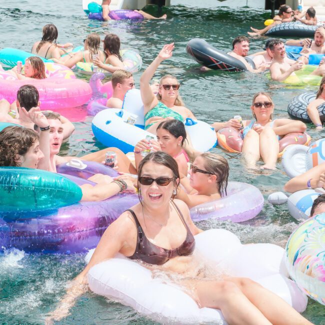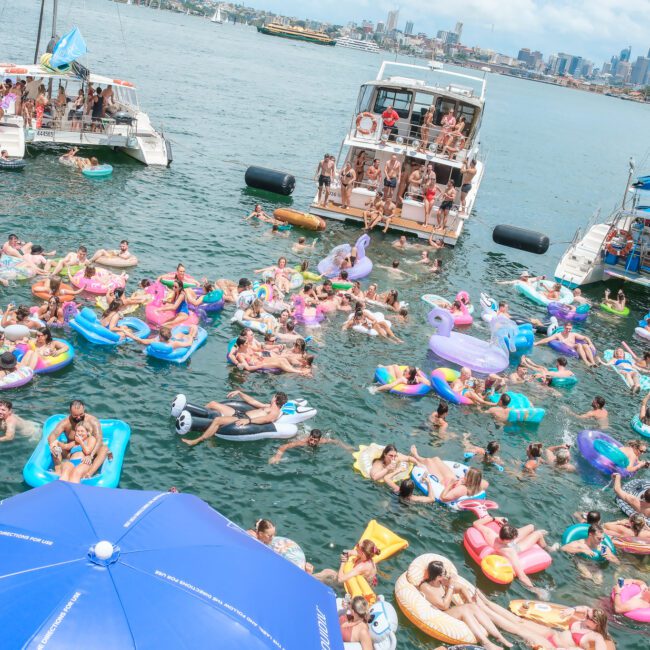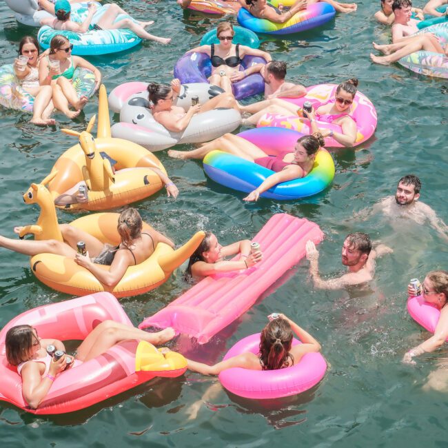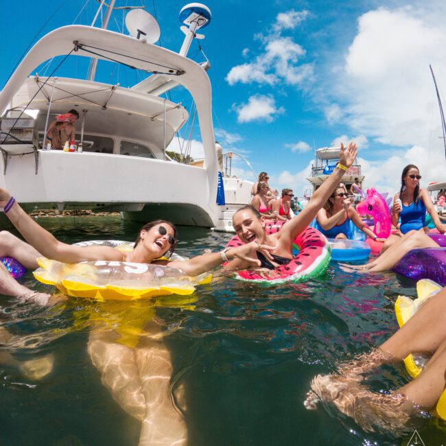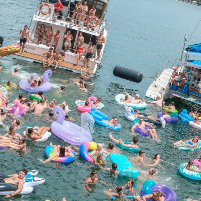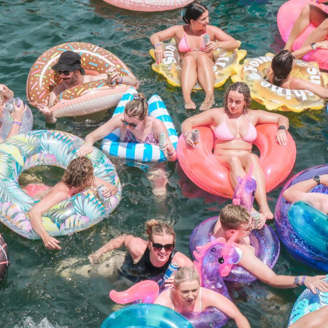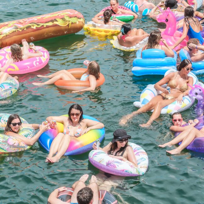 Two people in swimsuits enjoying a party on inflatable floats in the water. They are holding hands and drinks, surrounded by other partygoers and boats. It’s a sunny day with blue skies and fluffy clouds.