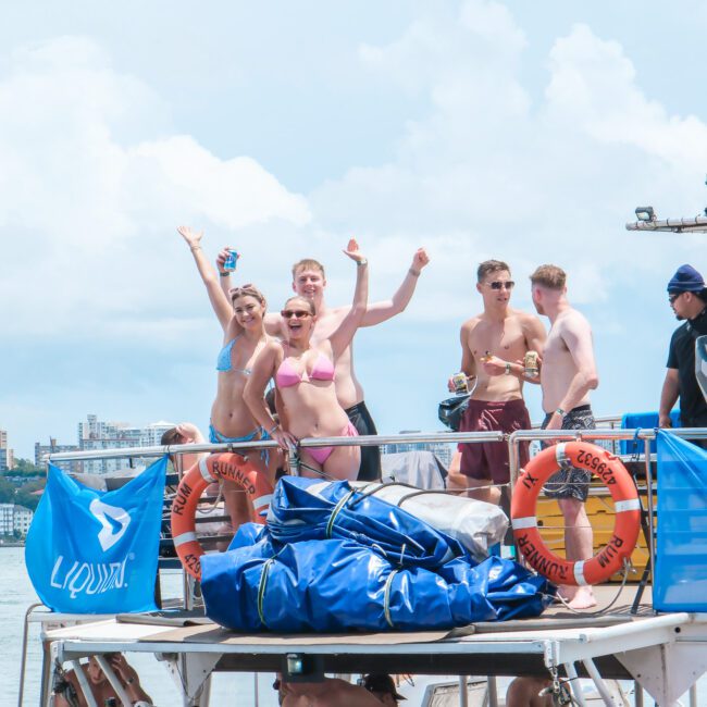 A group of people on a boat, wearing swimwear and enjoying drinks. Some are dancing and cheering. A blue flag is visible, and several life preservers are attached to the railing. Trees and a clear sky are in the background.