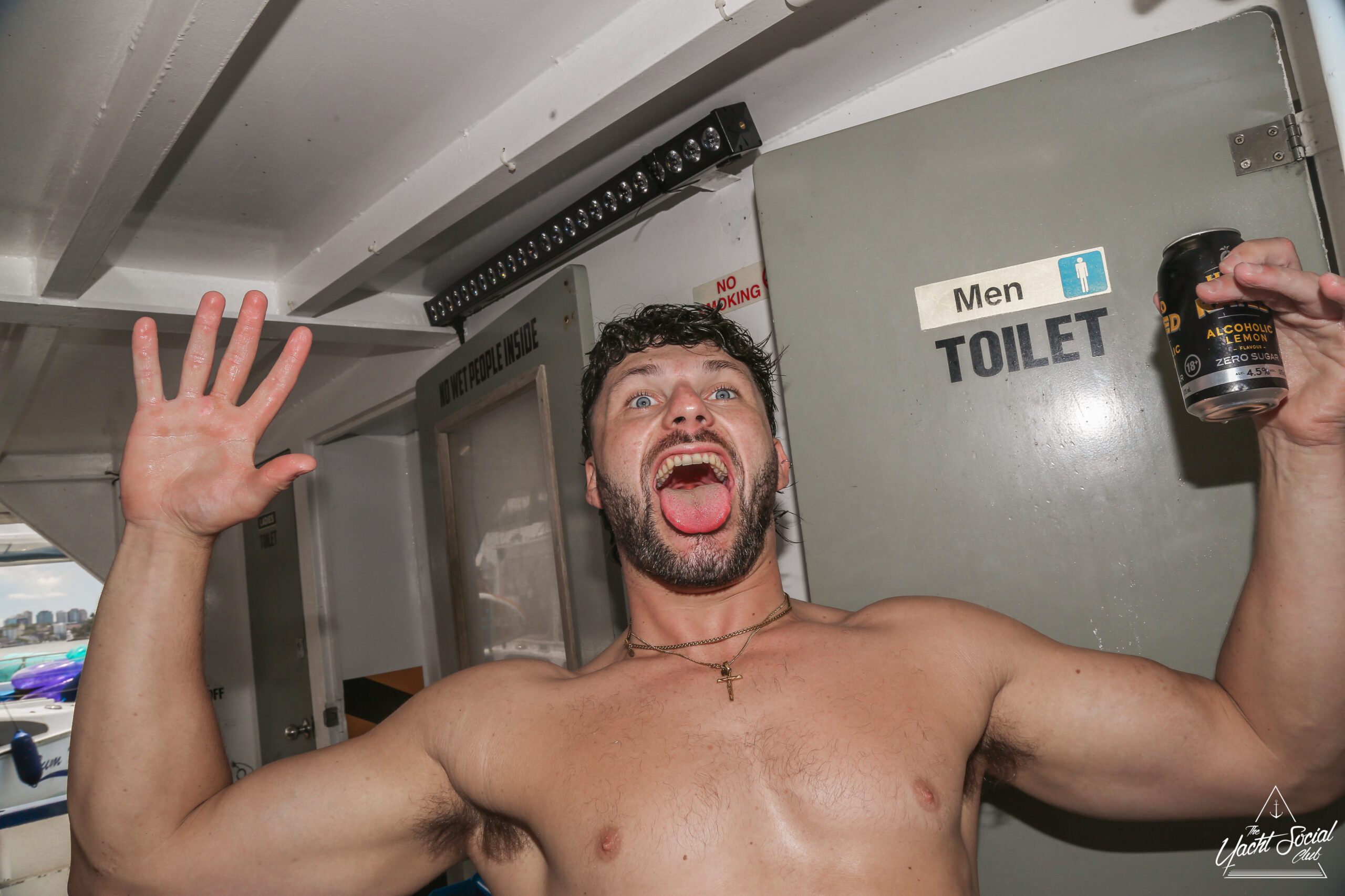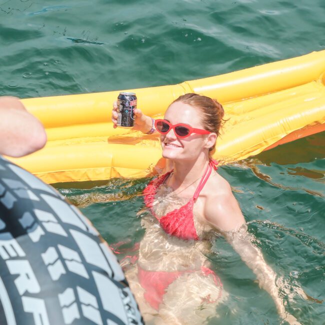 A young man on a boat holds up a can and smiles at the camera. He's surrounded by a group of people enjoying a sunny day, all wearing swimsuits. Behind them, the water is visible, along with pool noodles and a boat railing.