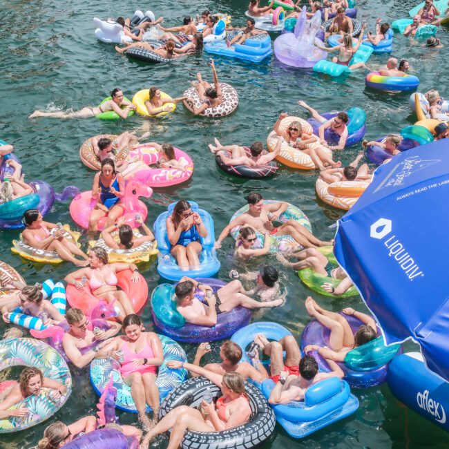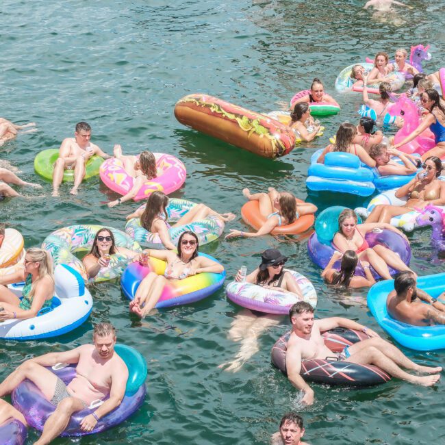 A lively scene of people floating on inflatable tubes in a crowded swimming area near a docked boat. The water is clear, and the inflatables are colorful, with many participants enjoying a sunny day.