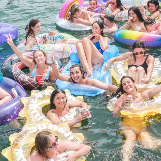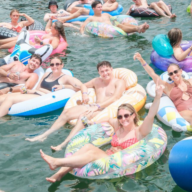 A group of people relaxing and having fun in the water on colorful inflatable tubes. They are smiling and holding drinks, with some raising their arms joyfully. The scene conveys a vibrant and festive summer atmosphere.