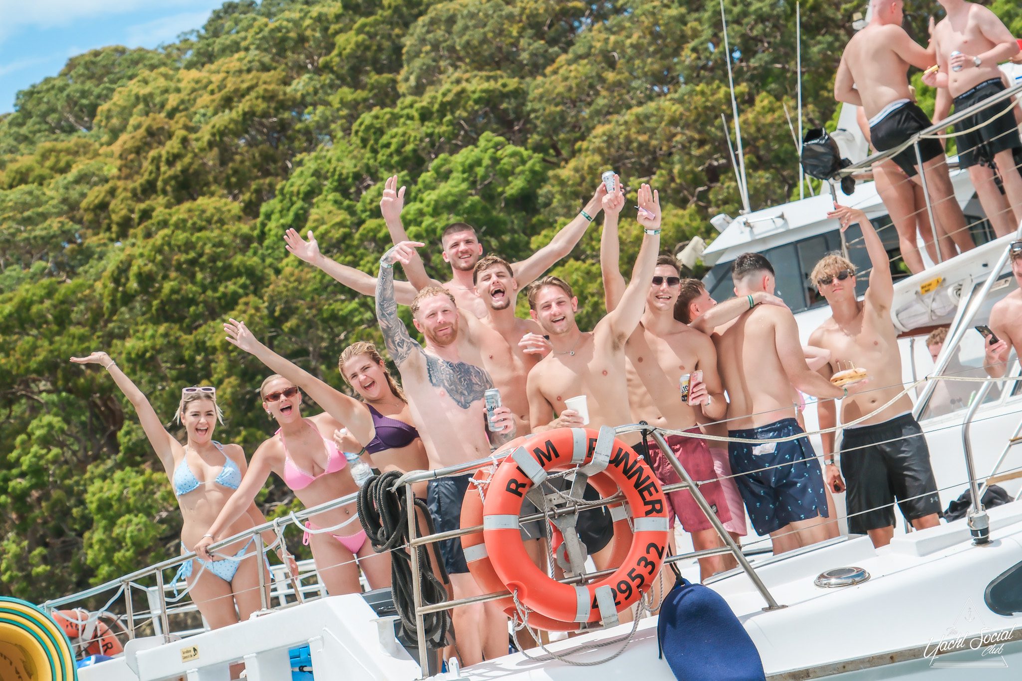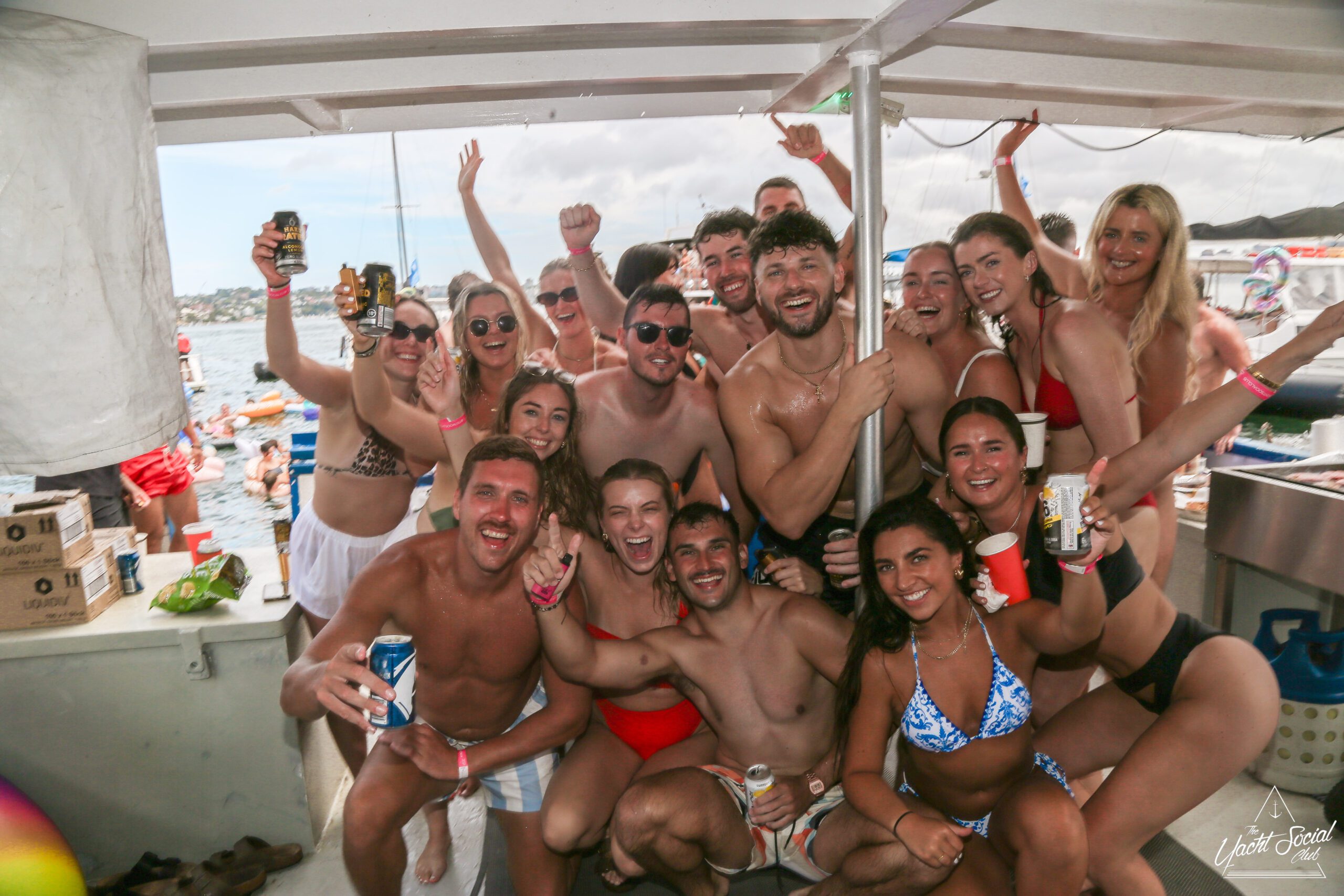 A large group of people in swimwear gather on a boat, smiling and holding drinks. The ocean provides a scenic backdrop. Inflatable tubes are visible on the deck. The sunny atmosphere suggests a joyful summer outing.