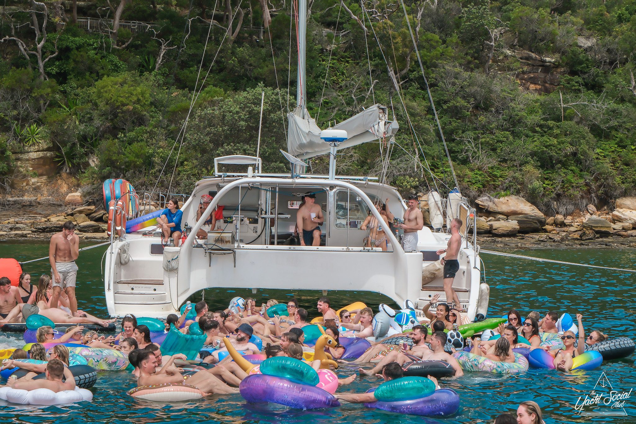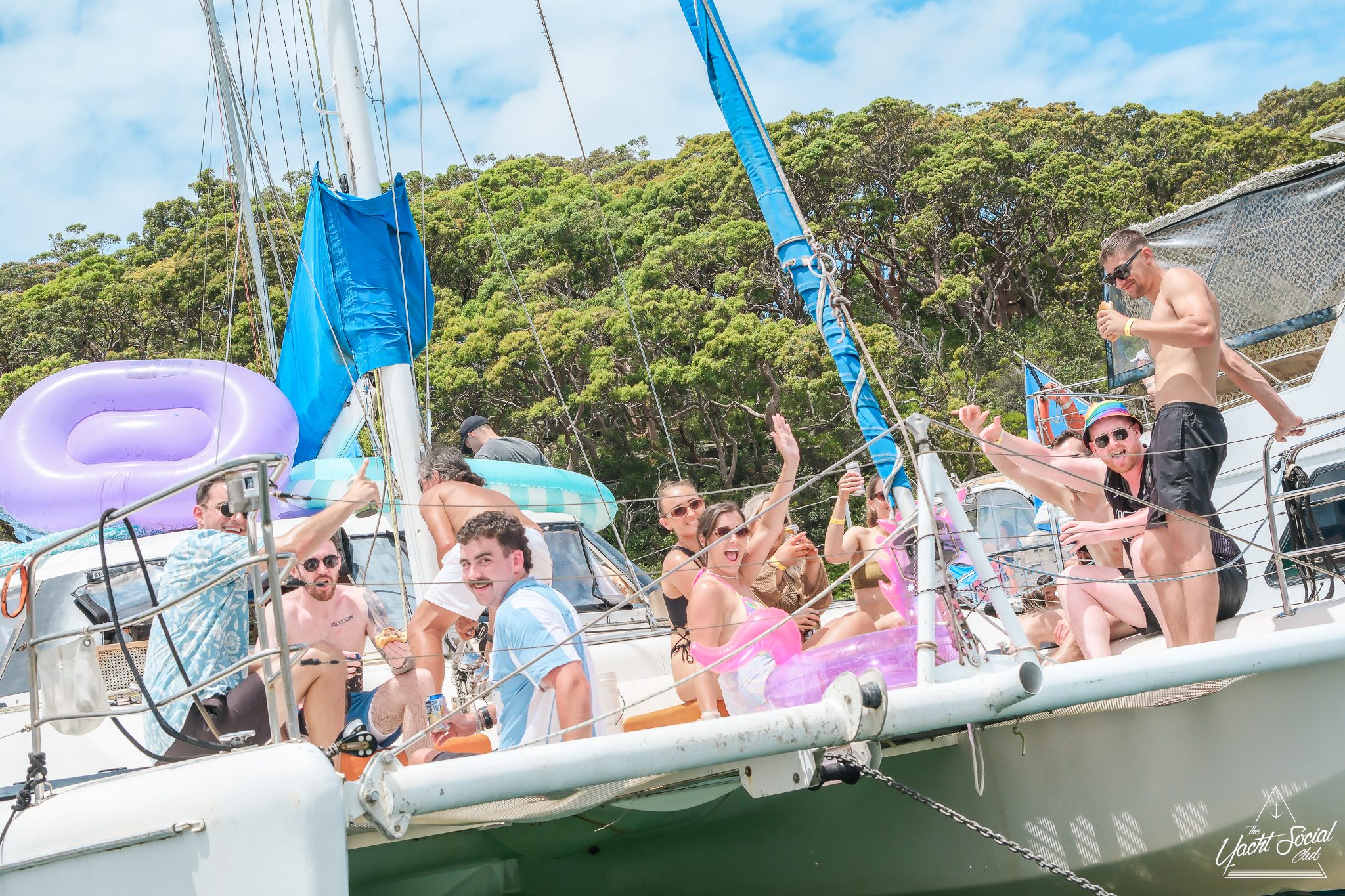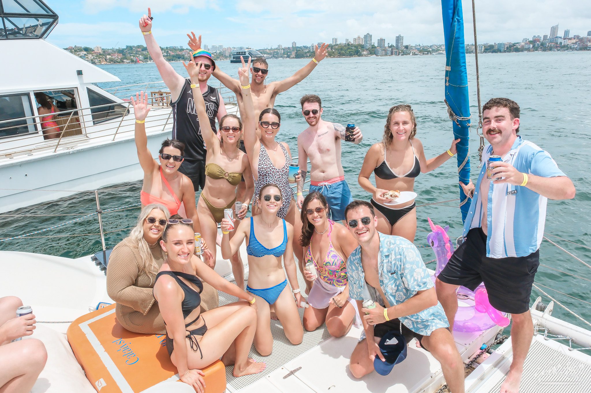 A group of people enjoying themselves on the deck of a catamaran. They're dressed in swimwear, with some holding drinks. The boat is in a calm body of water, and there is green foliage in the background under a partly cloudy sky.