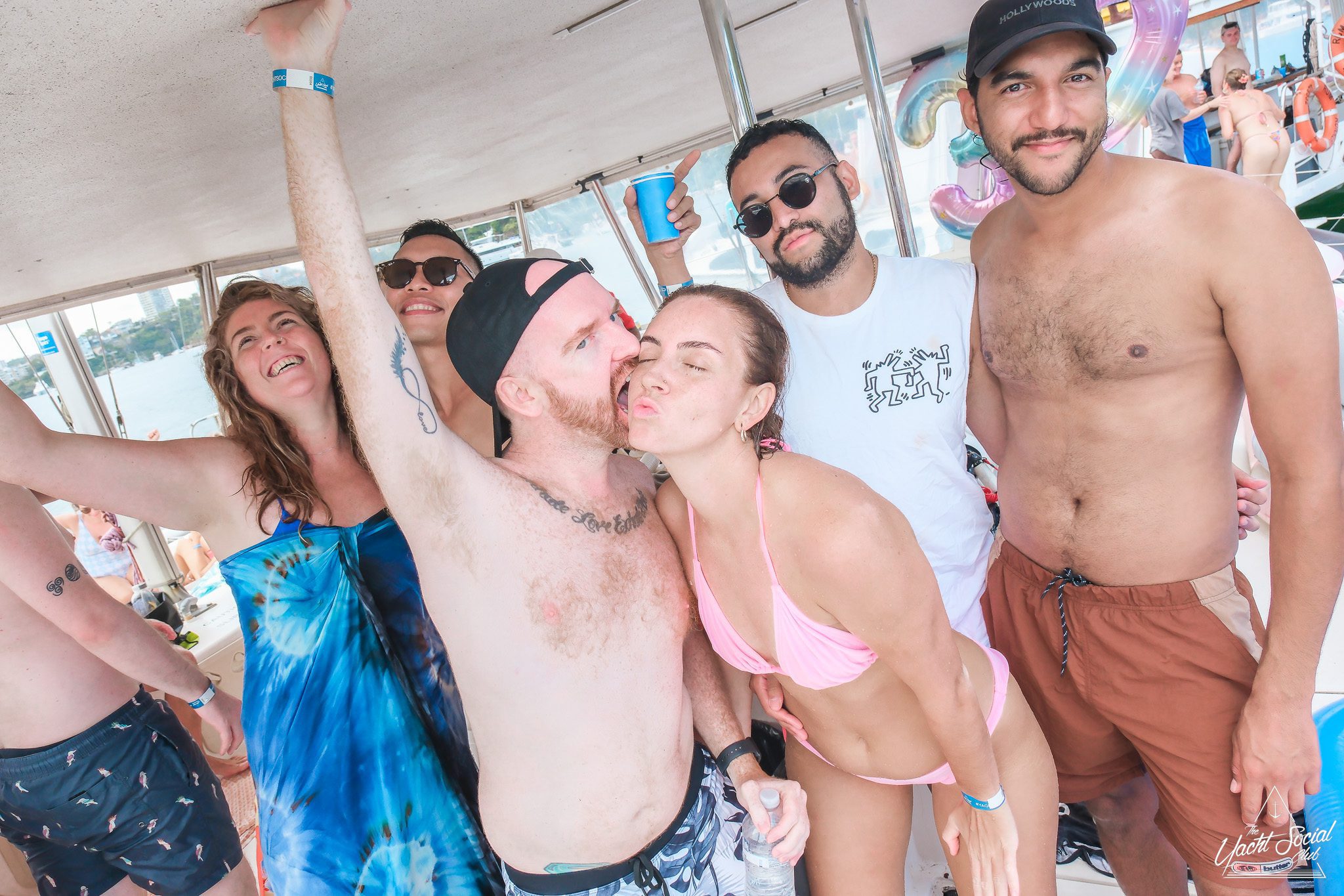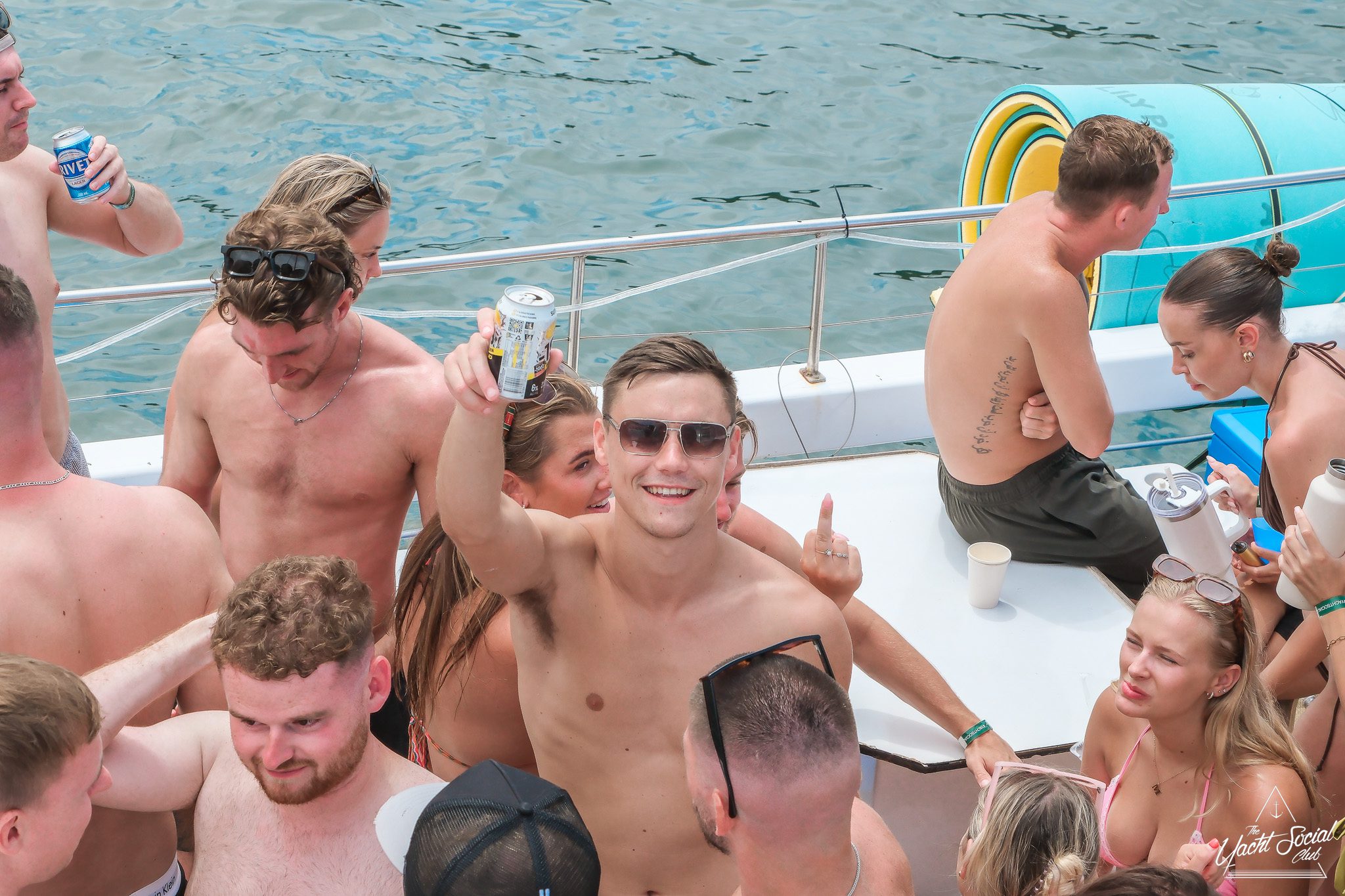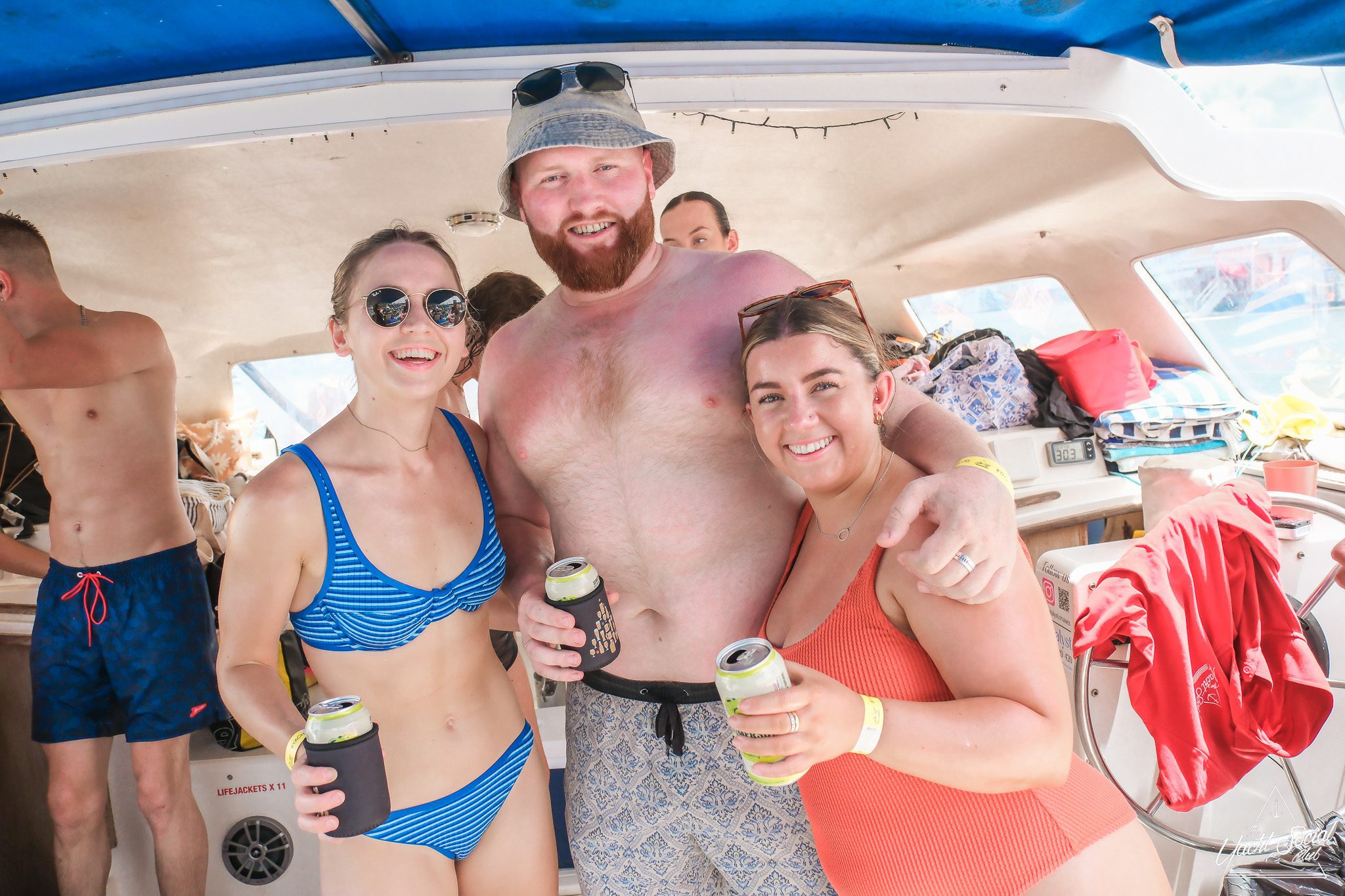 A man and a woman smiling on a boat, with the man holding a phone. The woman is wearing a beige bikini and holding a can. People are visible in the background, enjoying the boat party.