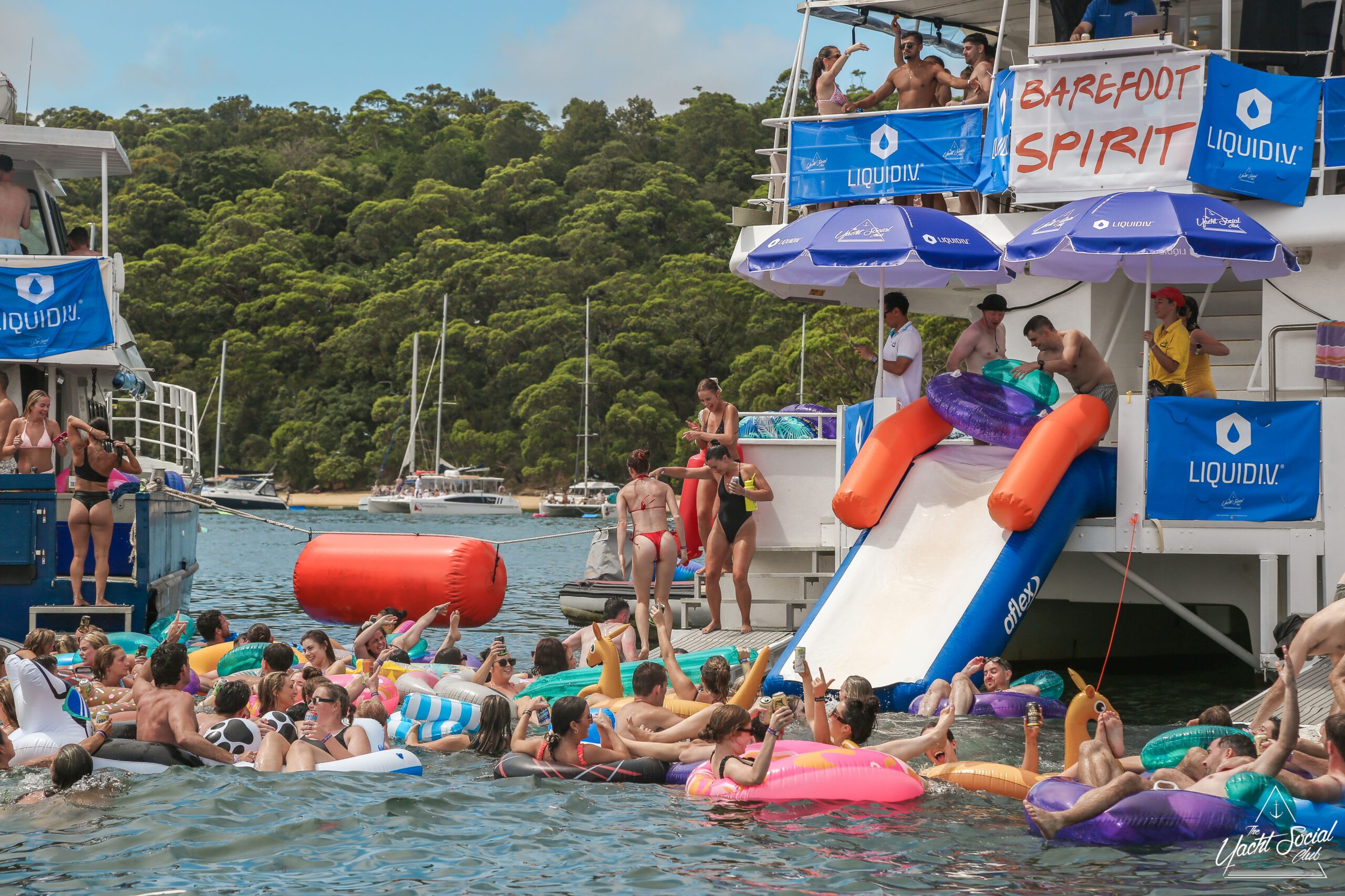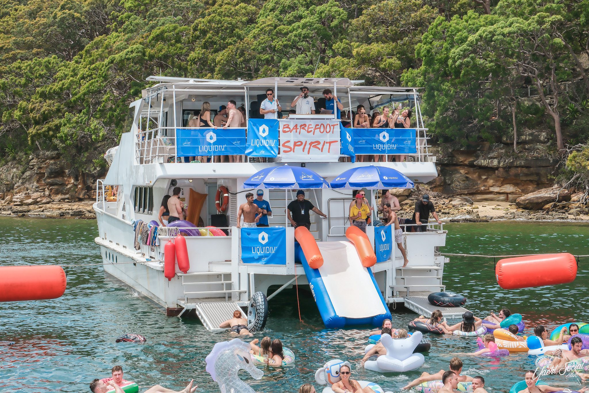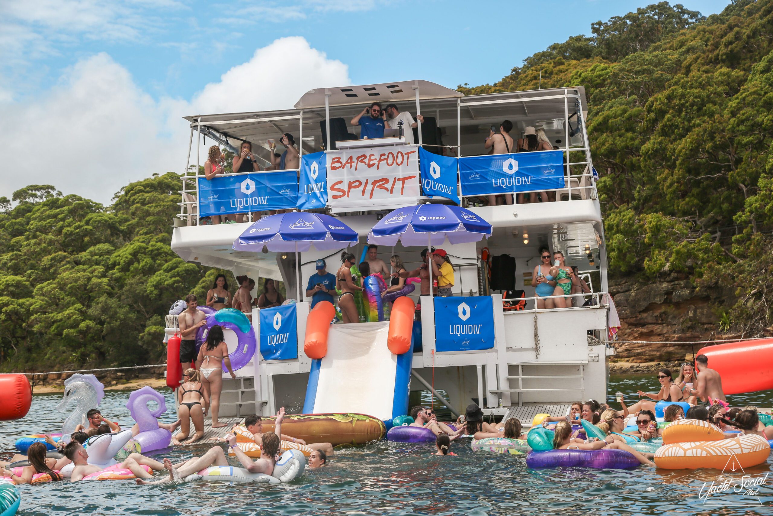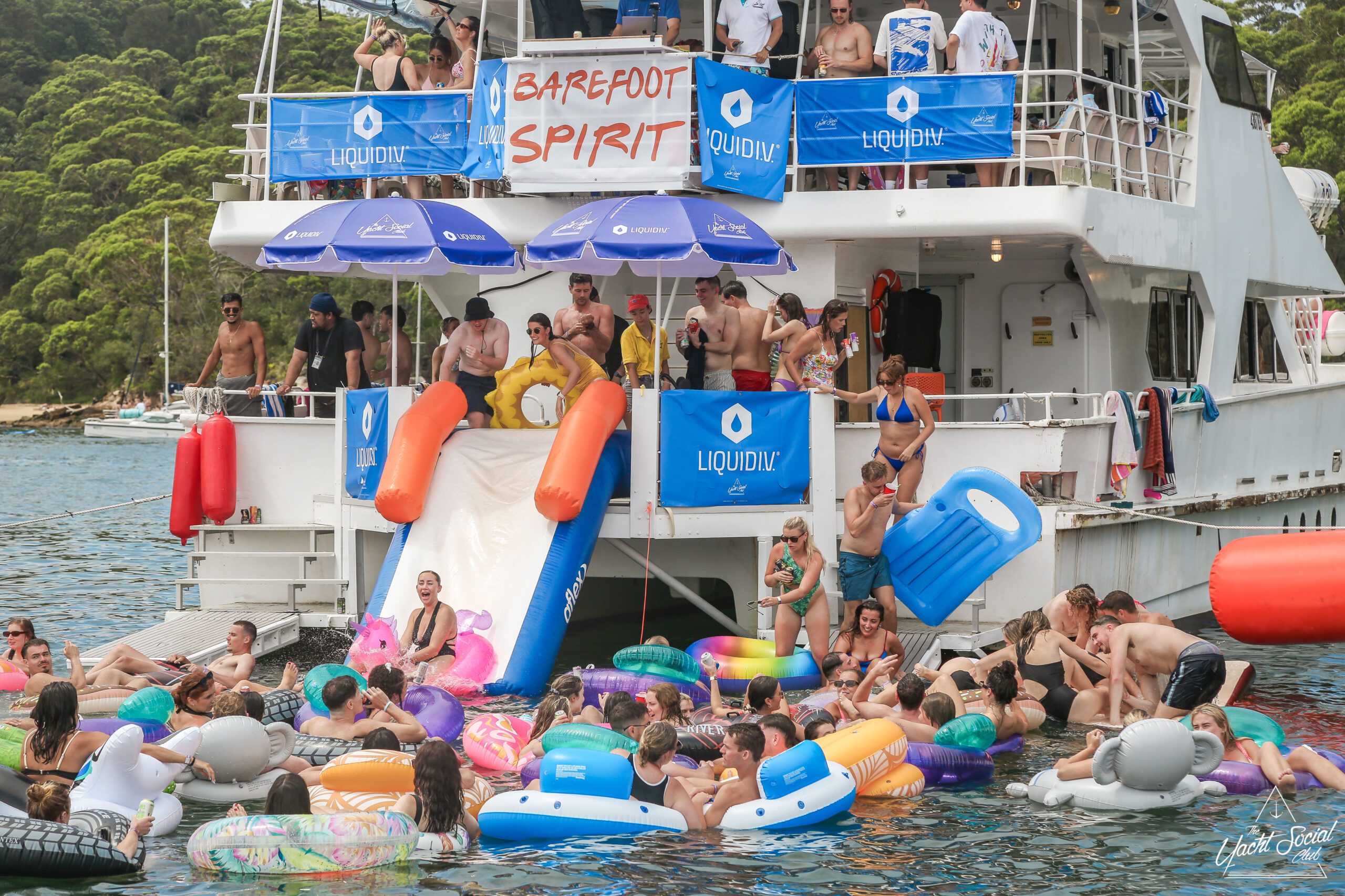 A lively boat party with people enjoying a large inflatable slide, surrounded by colorful pool floats in the water. Signs with "Barefoot Spirit" and "LiquidII" are visible. The background features lush greenery.