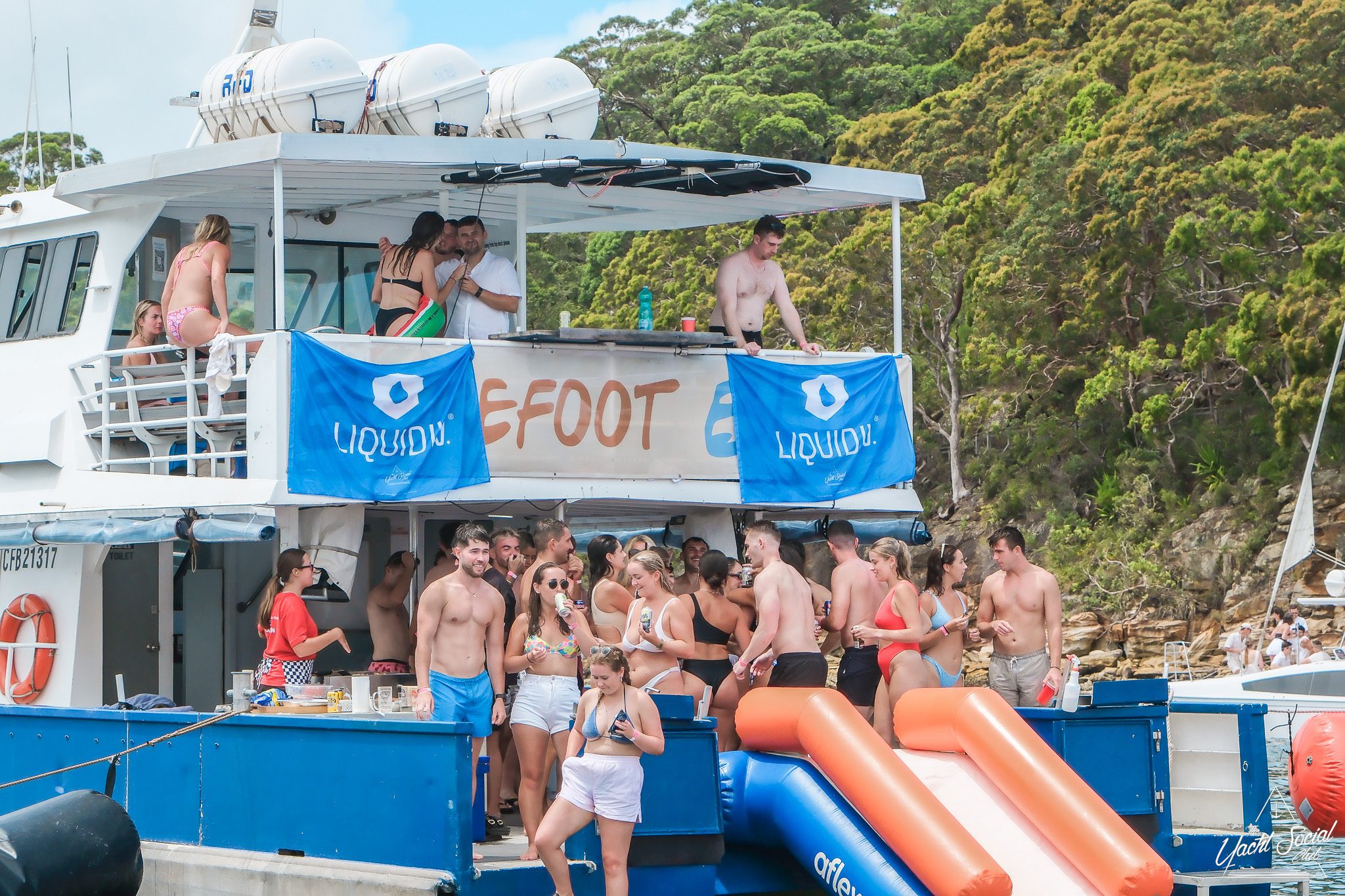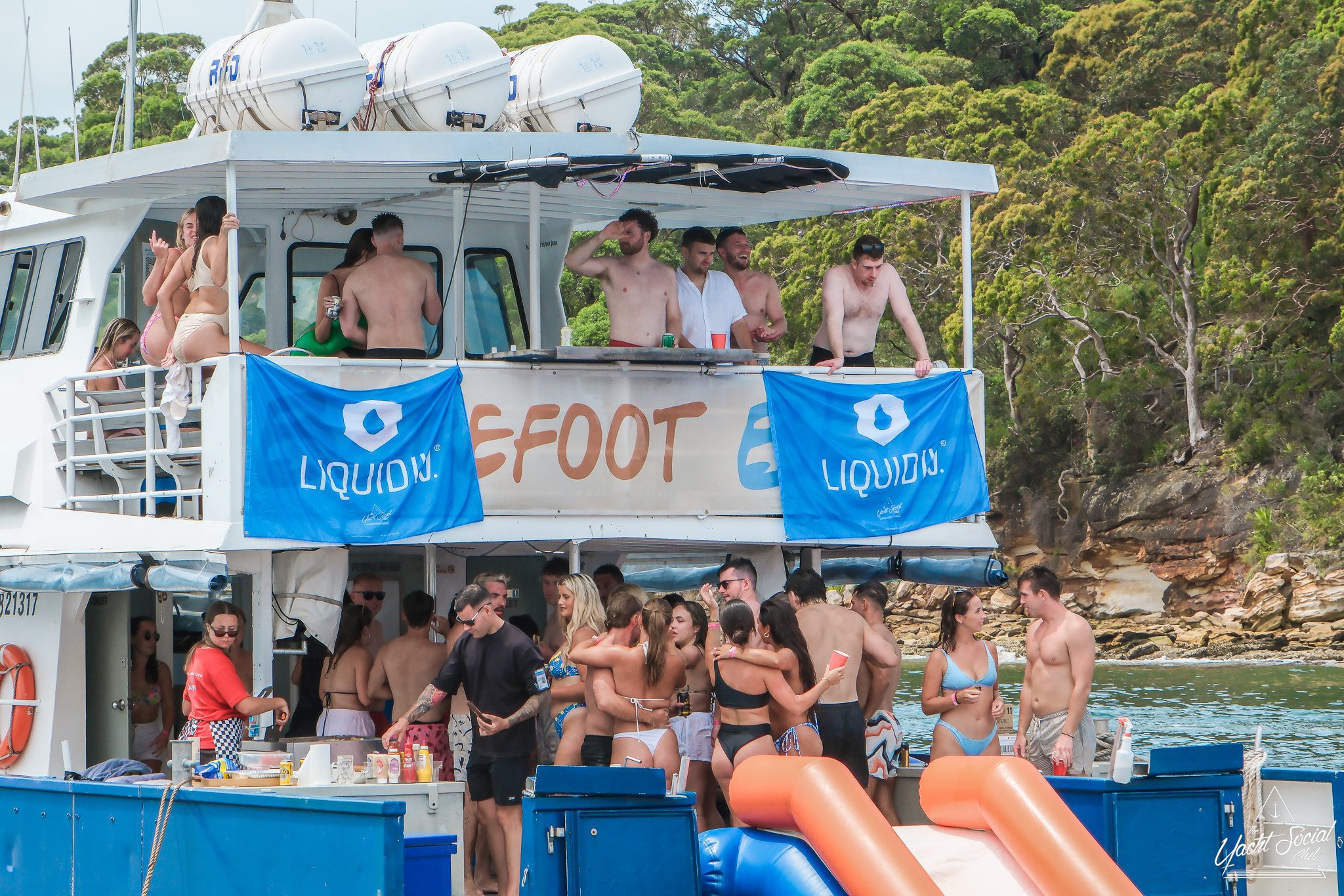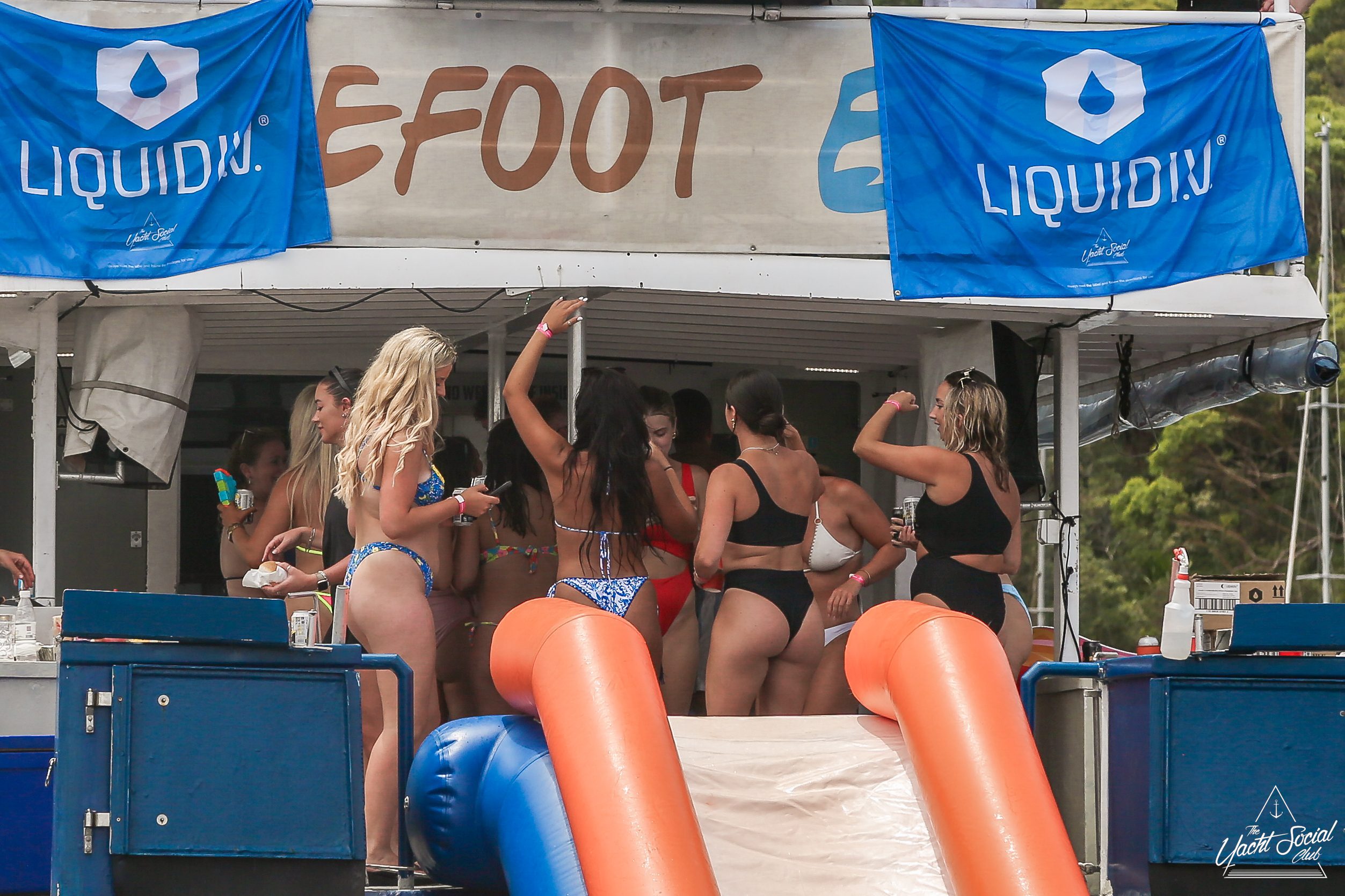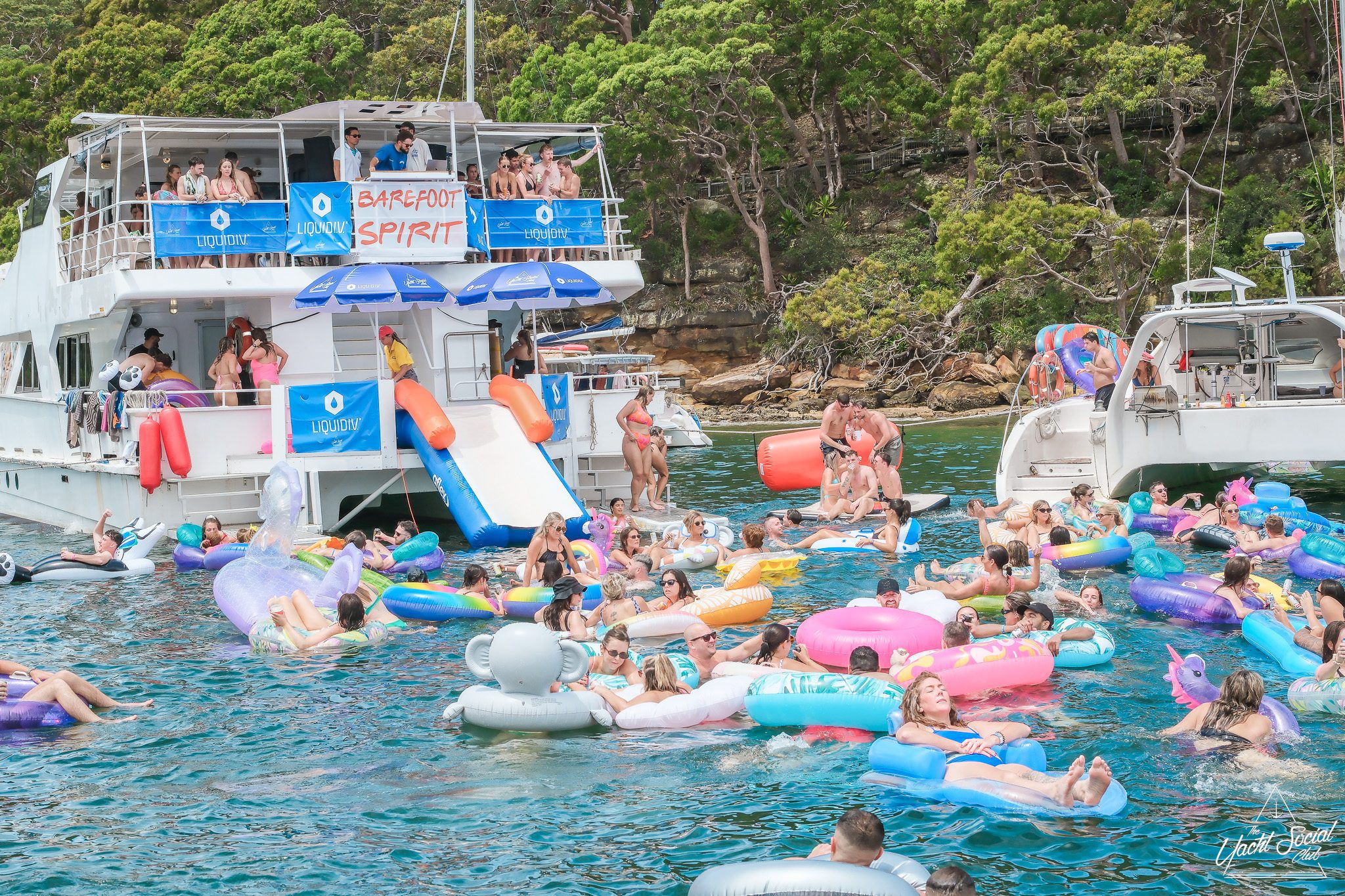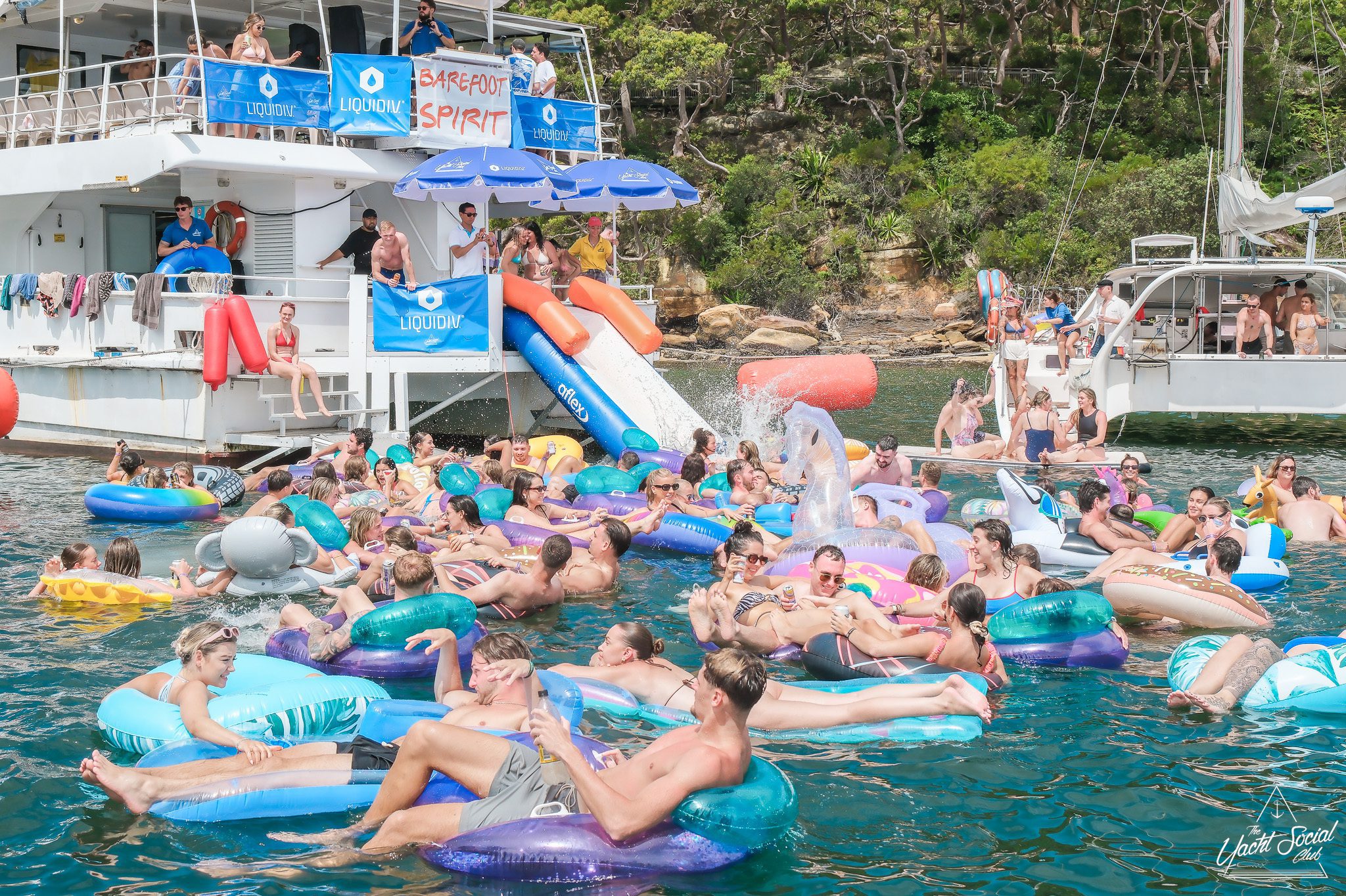 A lively boat party with people enjoying a large inflatable slide, surrounded by colorful pool floats in the water. Signs with "Barefoot Spirit" and "LiquidII" are visible. The background features lush greenery.
