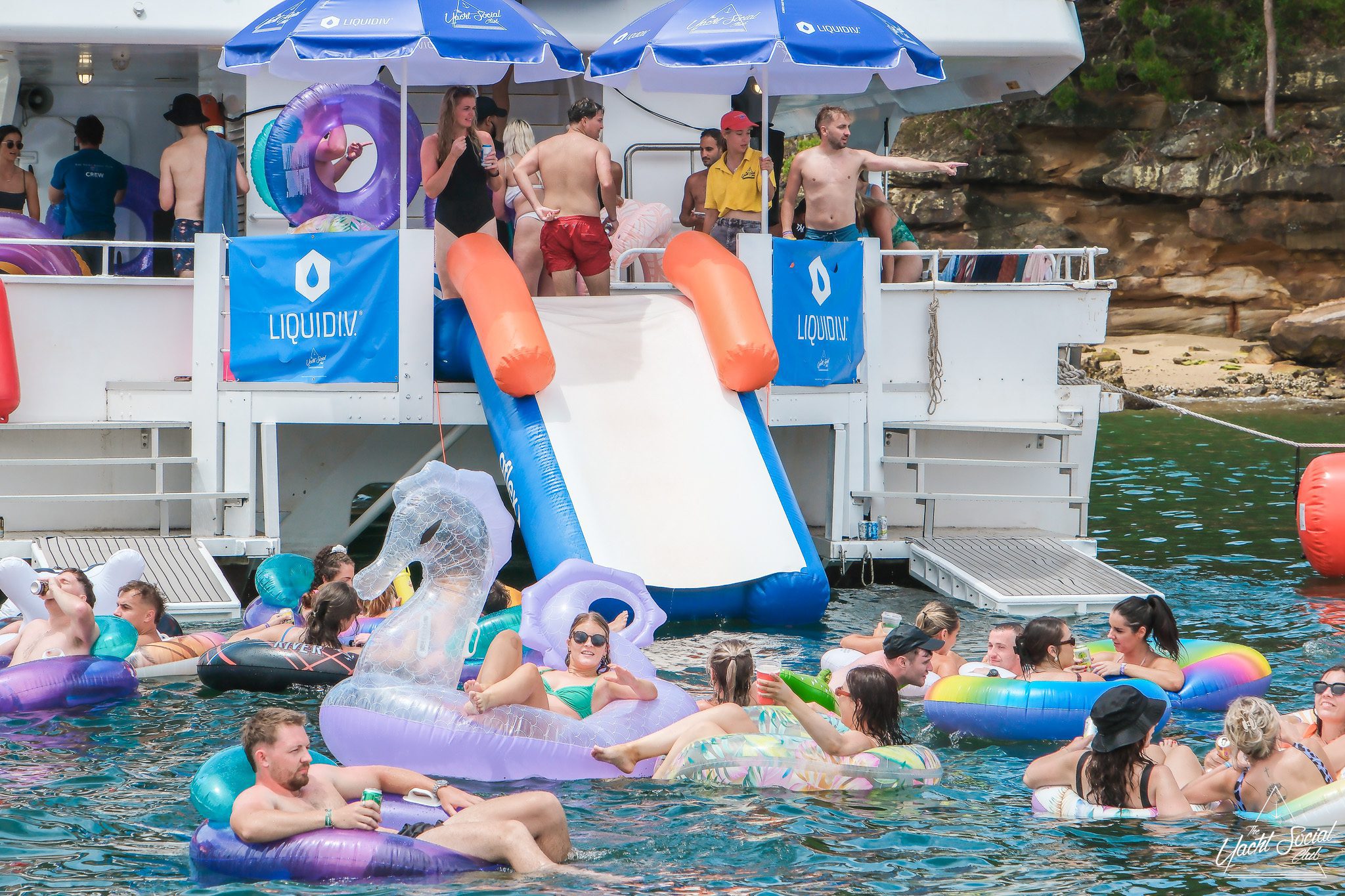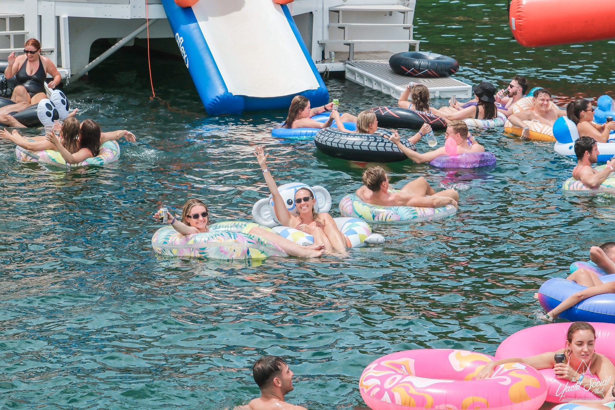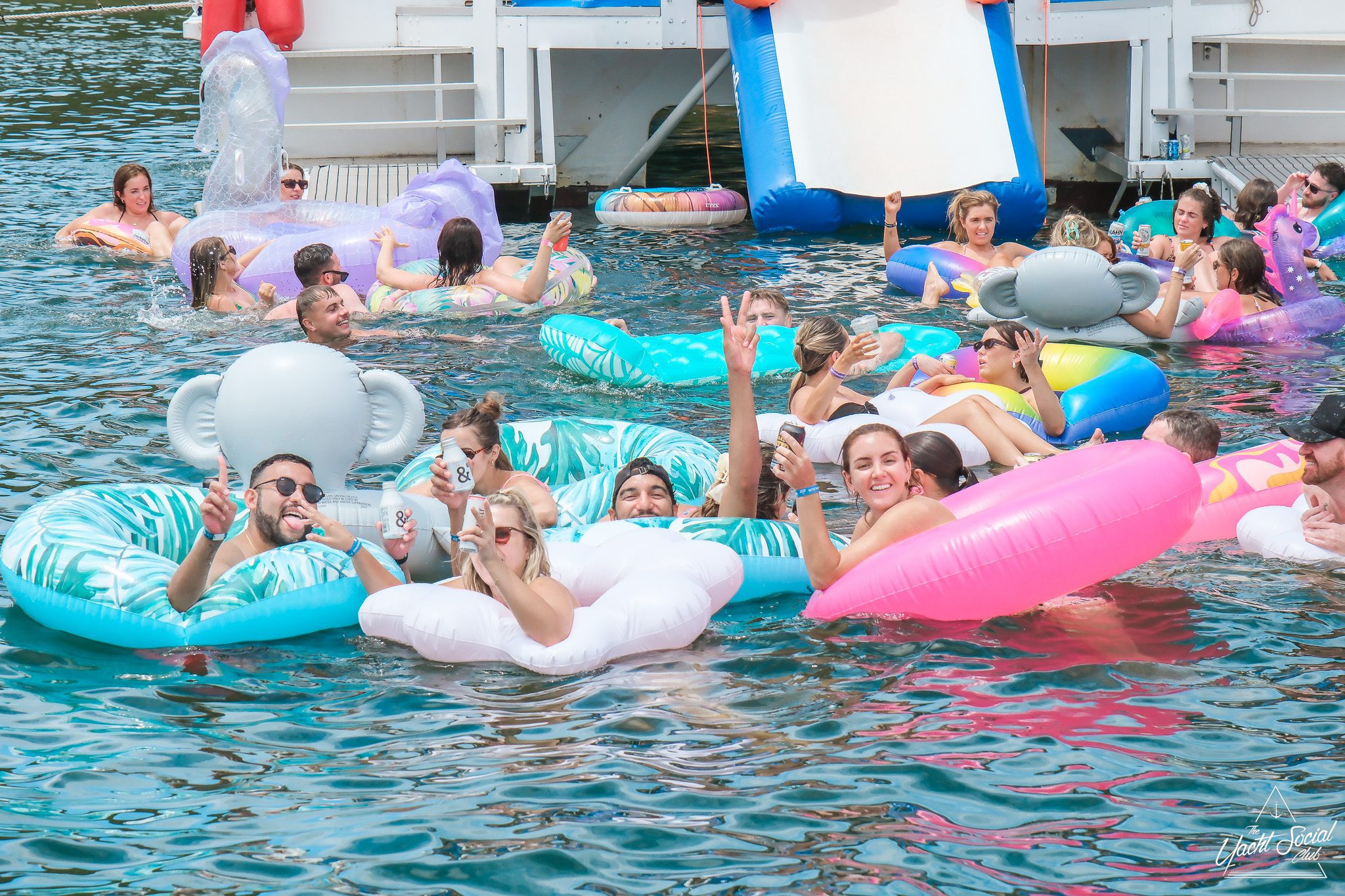 A group of people enjoying a party on inflatable floats in the water near a boat with an inflatable slide. They are smiling, relaxing, and holding drinks on various colorful pool floats.