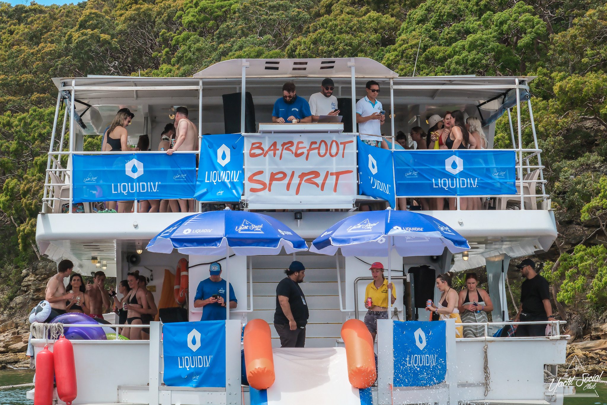 A large boat with two decks is crowded with people. Several individuals are standing and socializing under a "Barefoot Spirit" banner. Blue umbrellas and banners from "LiquidIV" brand are displayed. The background features lush greenery.